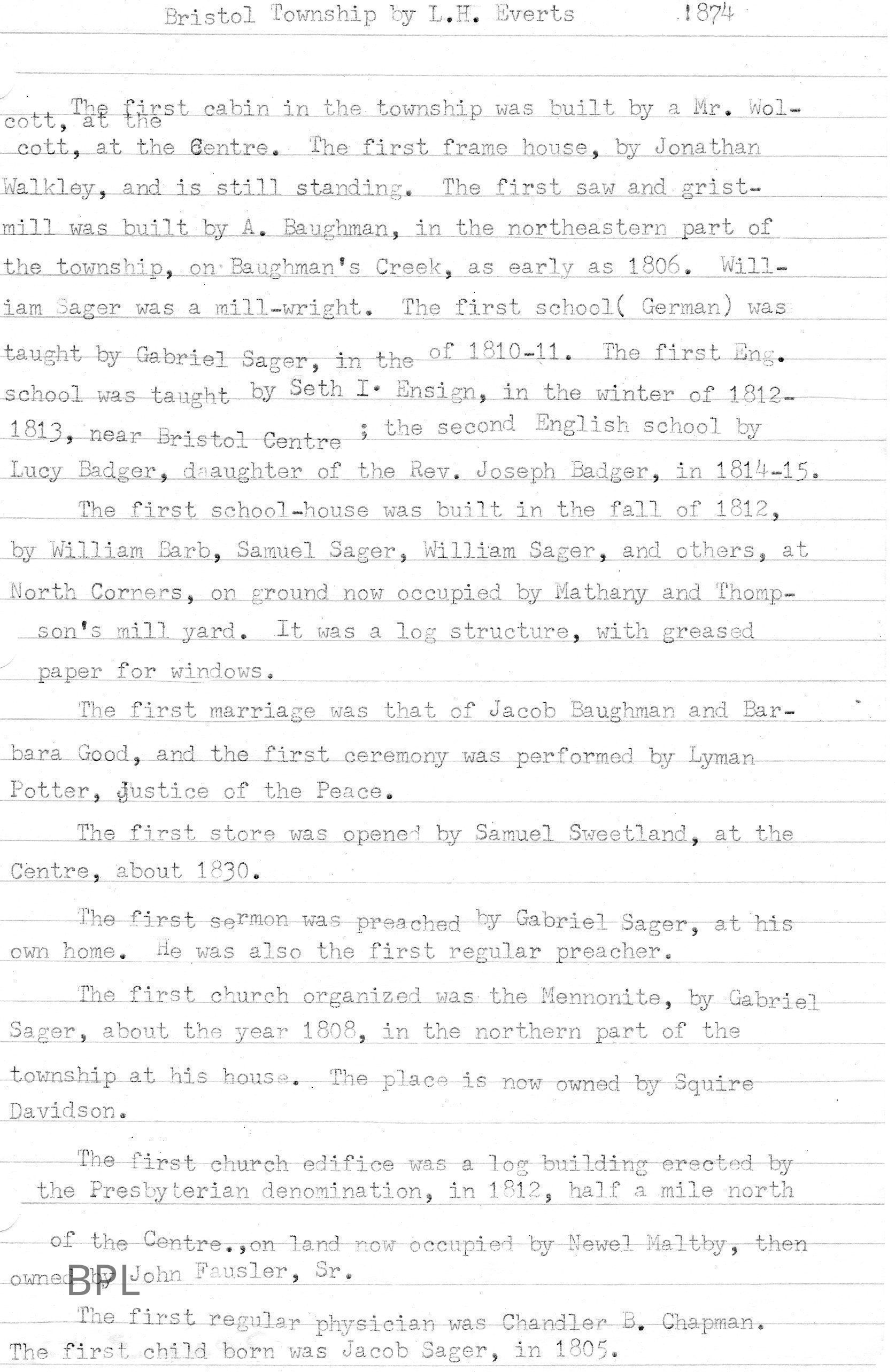 Copied History Written by L.H. Everts in 1874 of Bristol Township