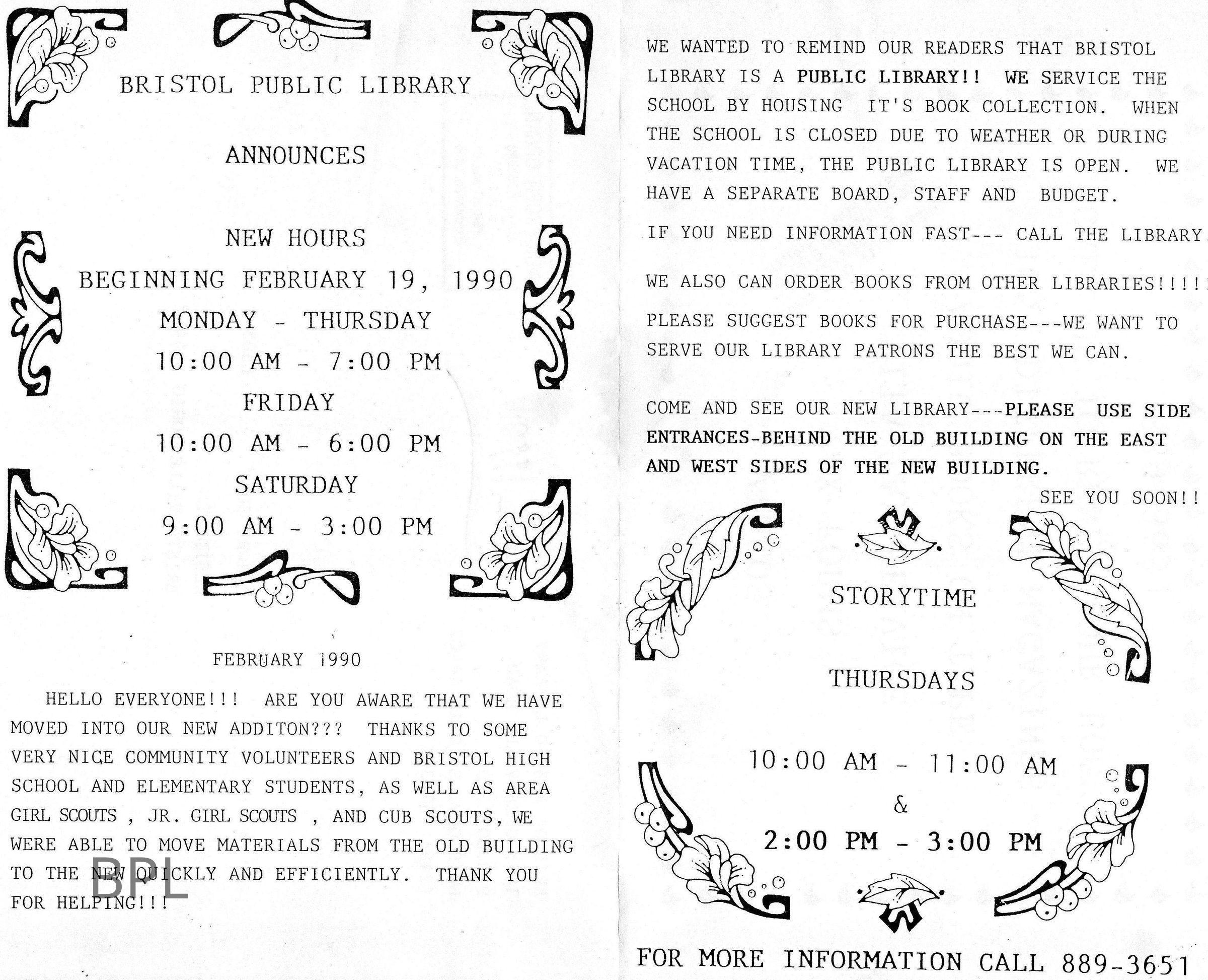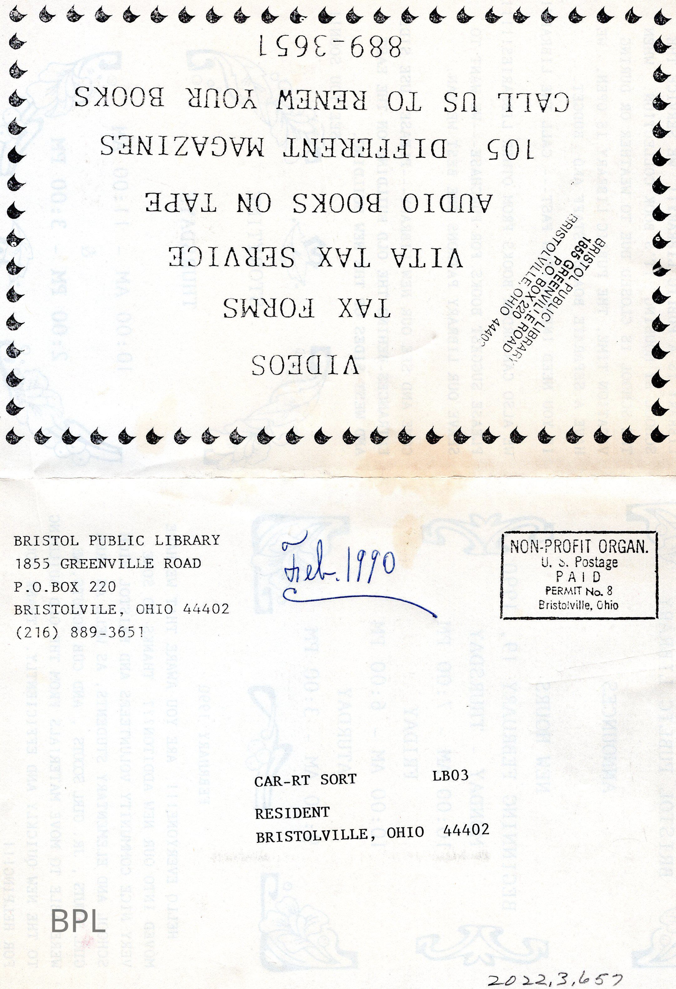 Mailer from Bristol Public Library, February, 1990Cataloged By