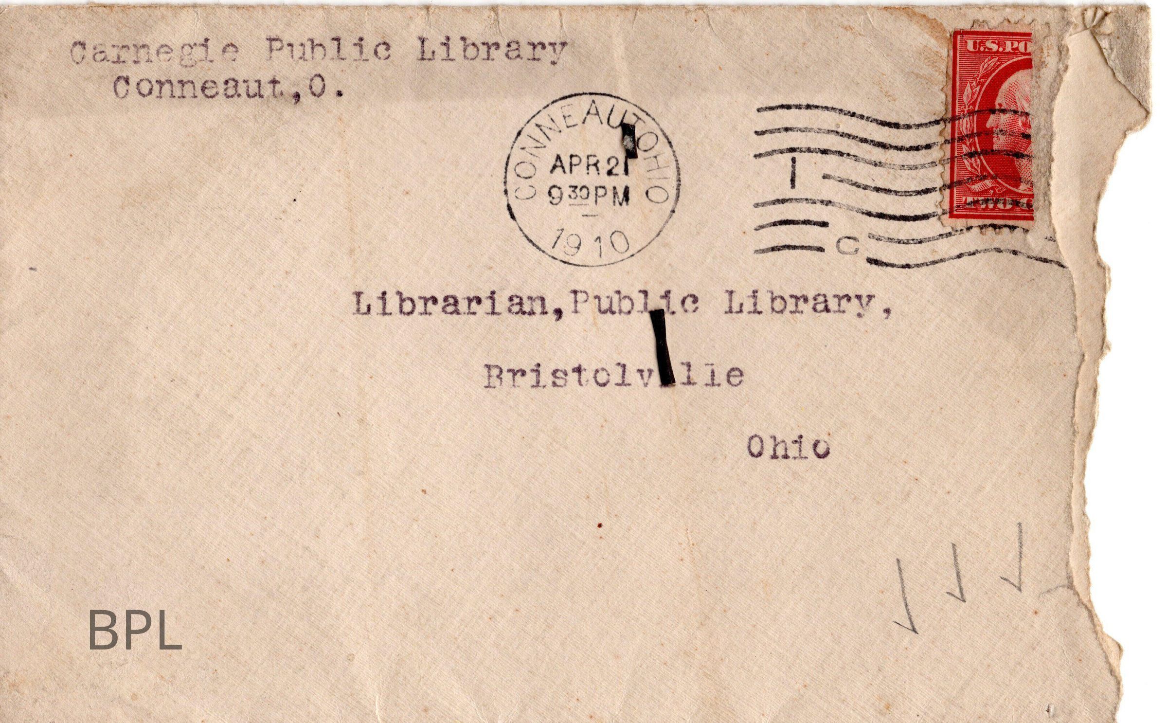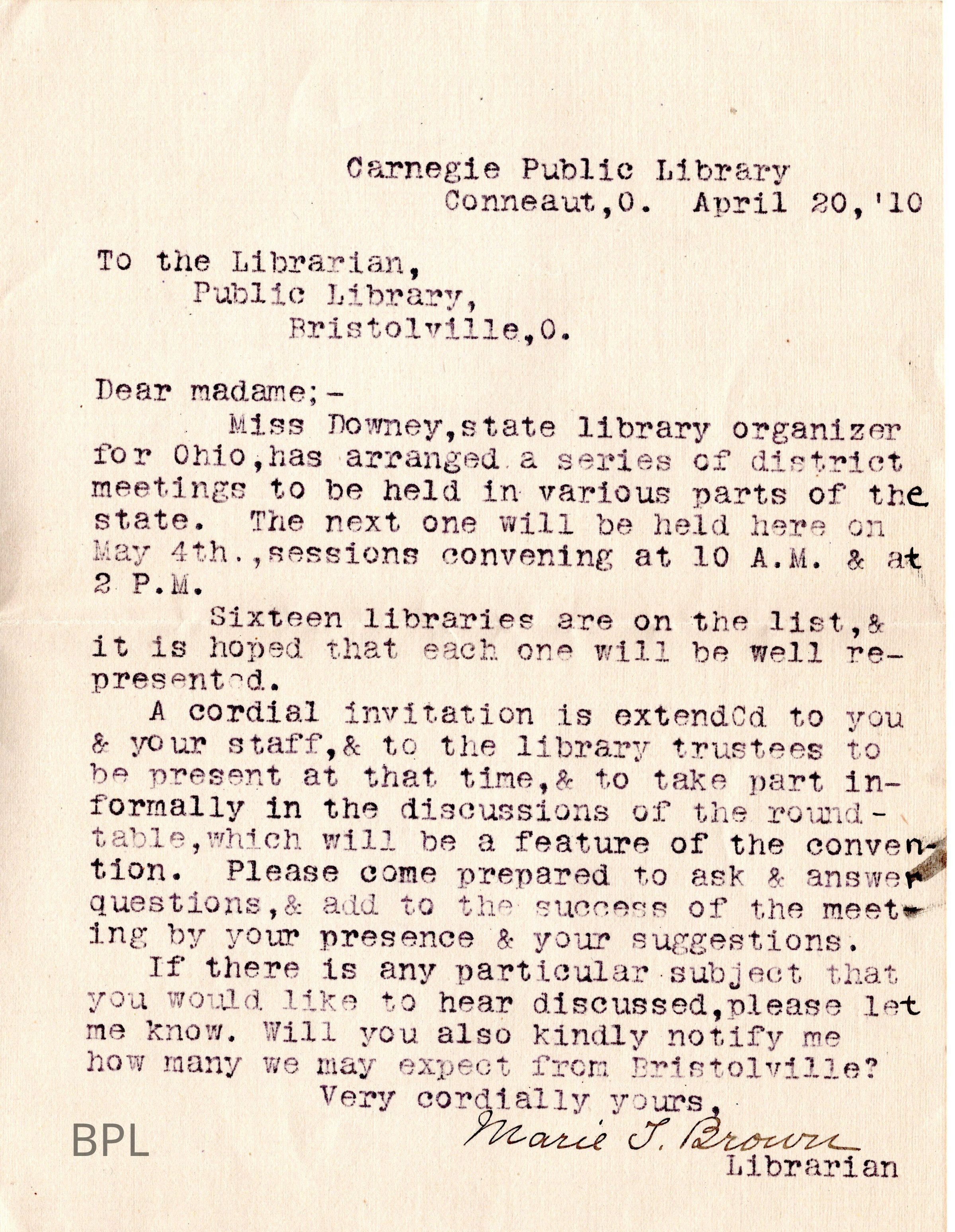 Letter to Bristol Librarian from Marie T. Brown of Carnegie Public Library of Conneaut, Ohio , April 20 1910, inviting Bristol staff to a session on libraries.Cataloged By