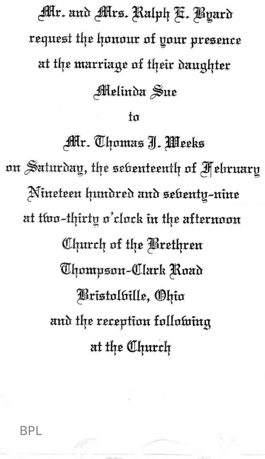 Wedding invitation for Melinda Sue Byard to Thomas J. Weeks, February 17, 1979 with envelope addressed to Dr. Mrs HubbardCataloged By