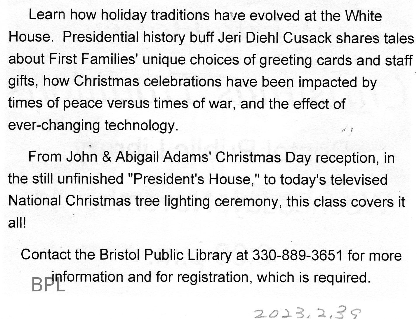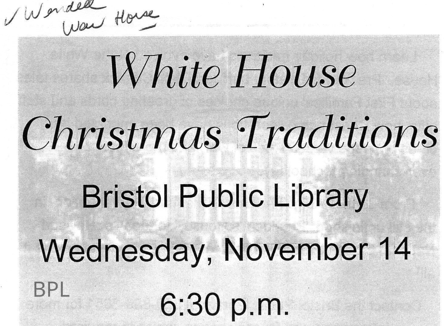 Program at Bristol Public Library on White House Traditions Presented by Jeri Diehl CusackCataloged By