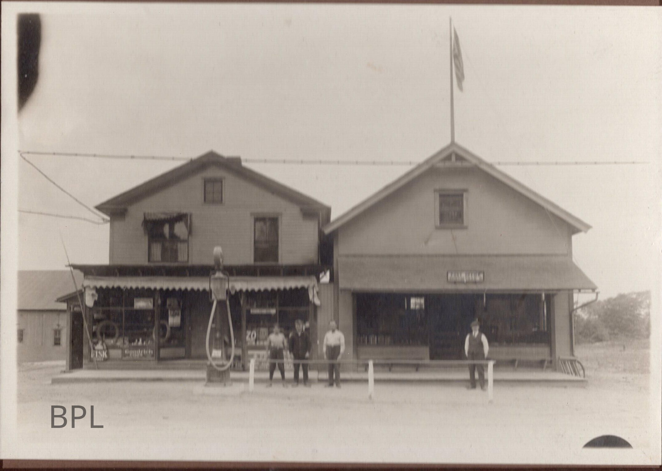 Photo of Bristolville Ohio Post Office and gas station with 4 men standing in front.Cataloged By