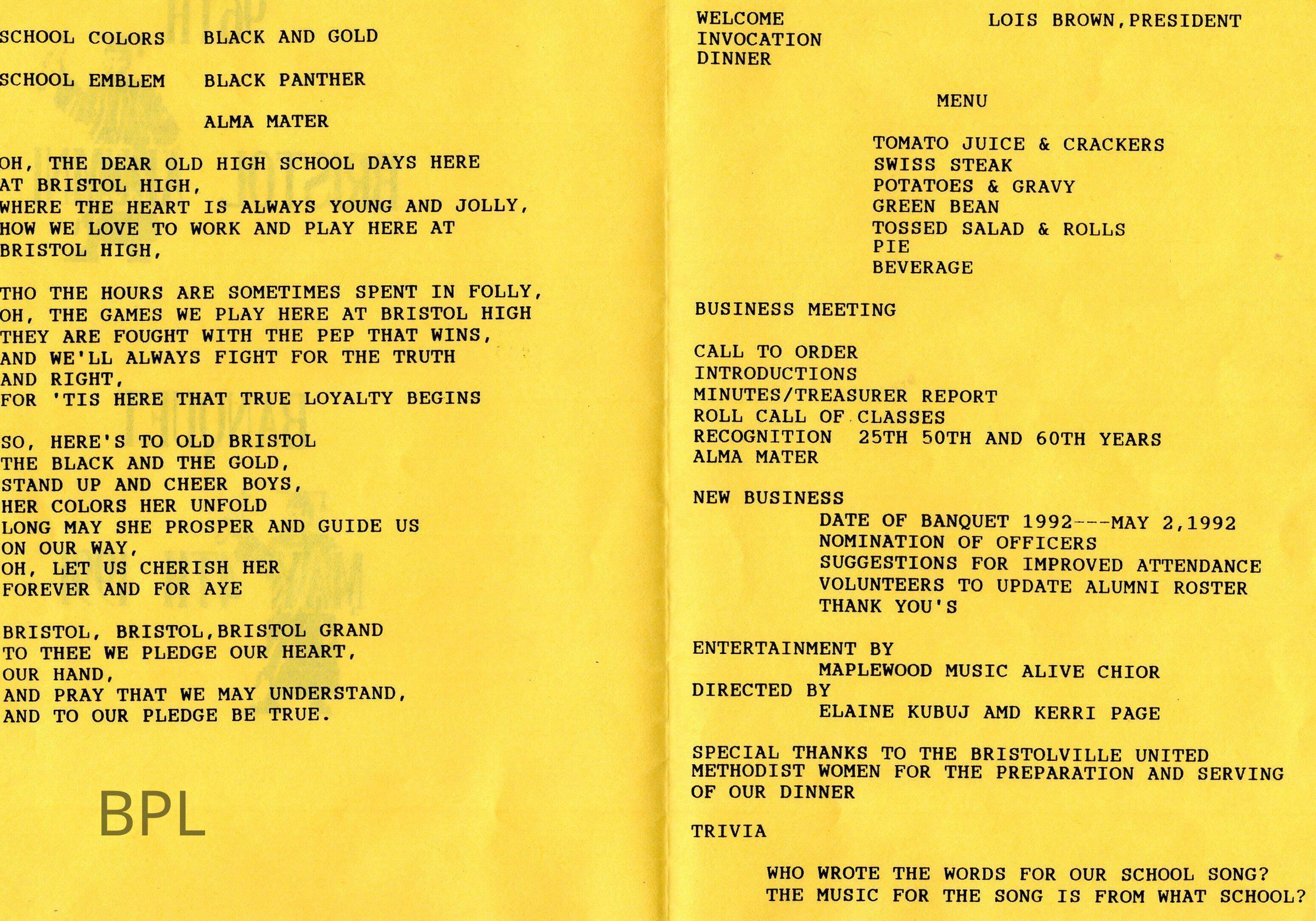 Program, 96th Bristol Alumni Banquet,1991Entry/Object ID