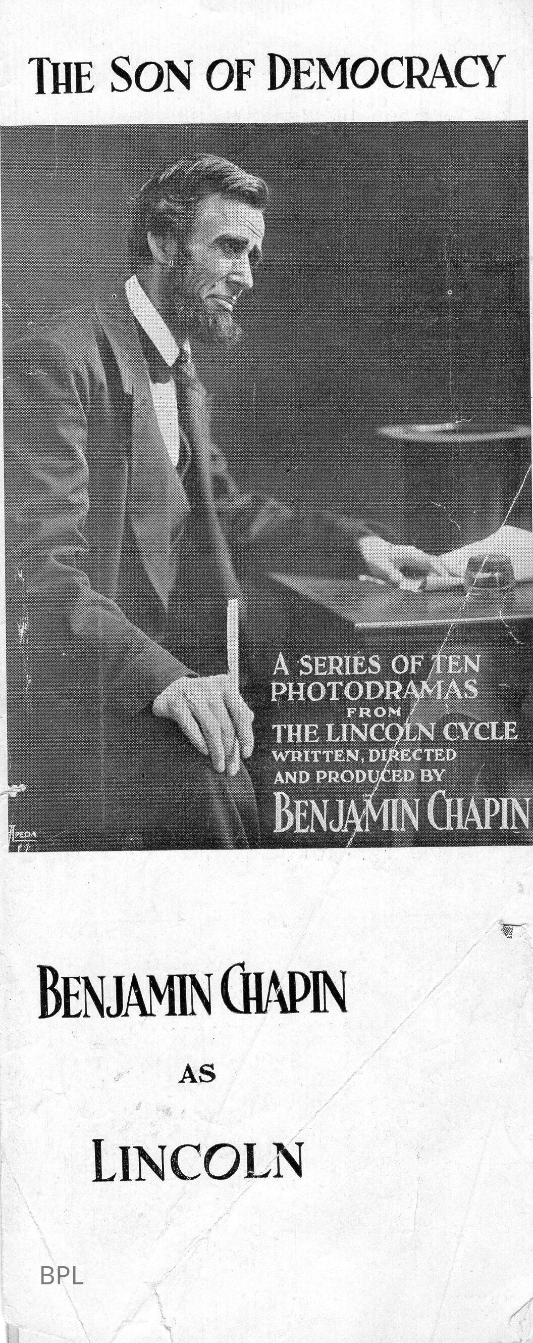 Pamphlet of " Son of Democracy" with Benjamin Chapin photo portraying Lincoln "A Series of Ten photodramas from The Lincoln Cycle. Written and directed and produced by Benjamin Chapin. Chapin was born and is buried in Bristolville, OhioCataloged By