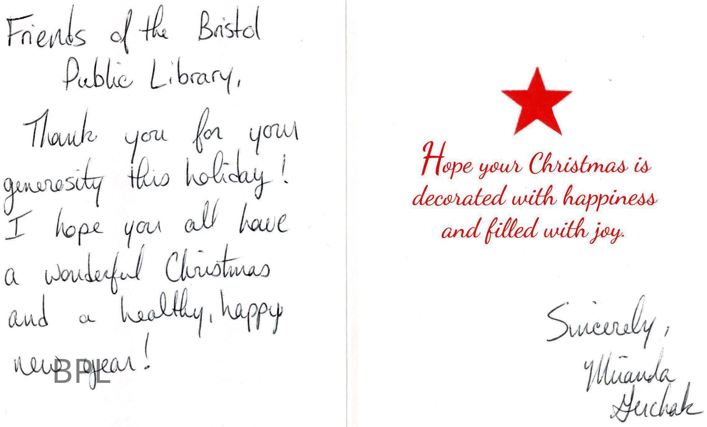 Thank You Card to Friends of Bristol Public Library from Staff Member of Bristol Public Library Miranda Gerchak for Christmas Gift.Cataloged By