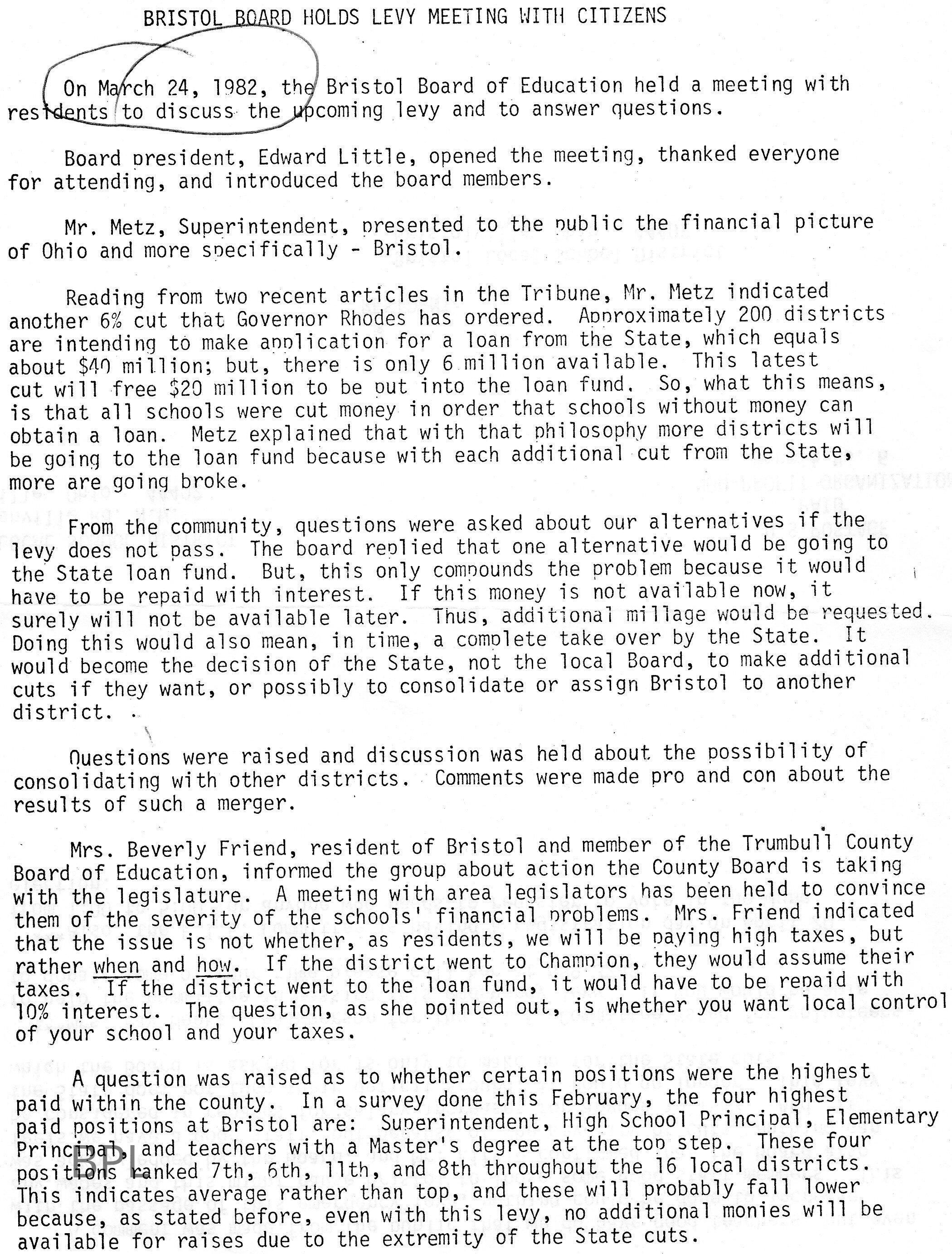 Bristol School Report about Board of Education meeting with citizens about levy.Cataloged By