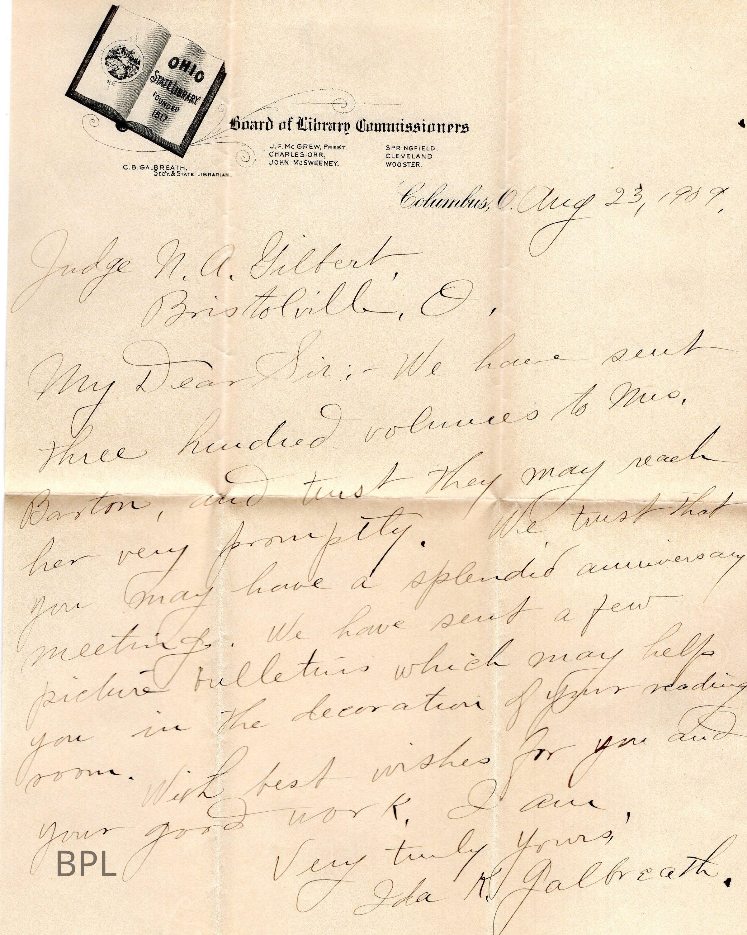 Letter from Ida K Galbreath of The Board of Library Commissoners to Judge N. A. Gilbert, about sending 300 books to Bristol dated August 23, 1909Cataloged By