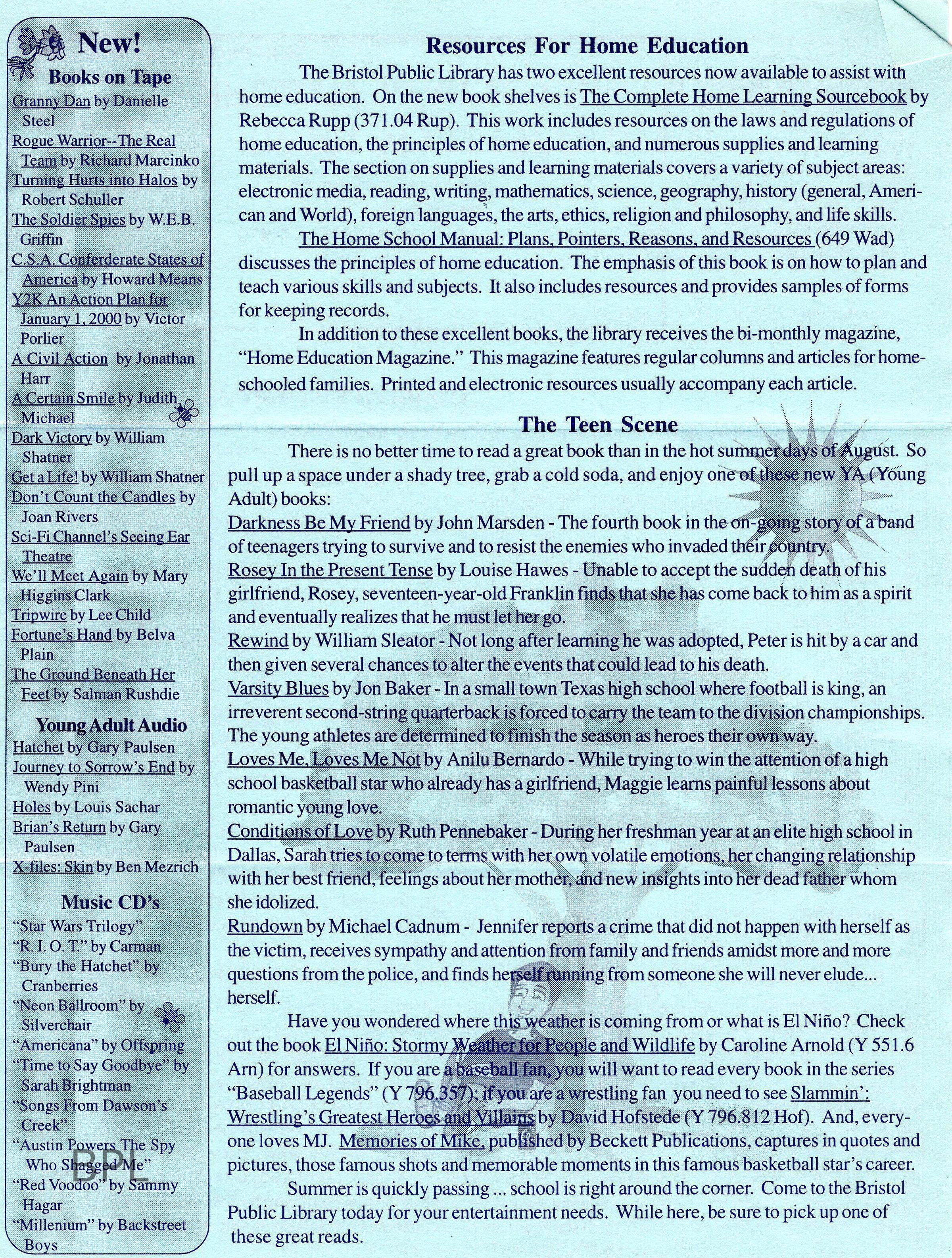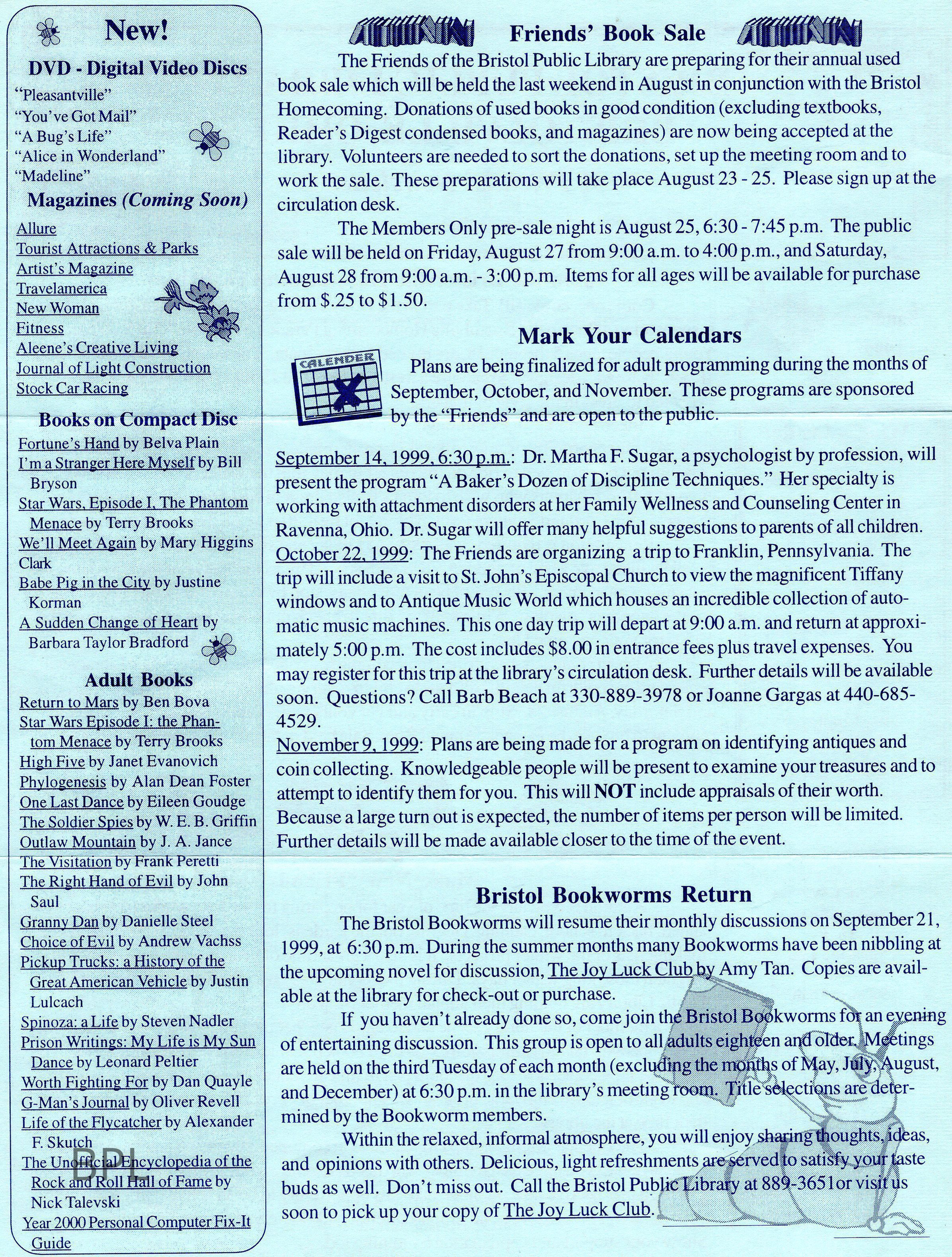 Newsletter from Friends of Bristol Public Library, Summer of 1999Cataloged By