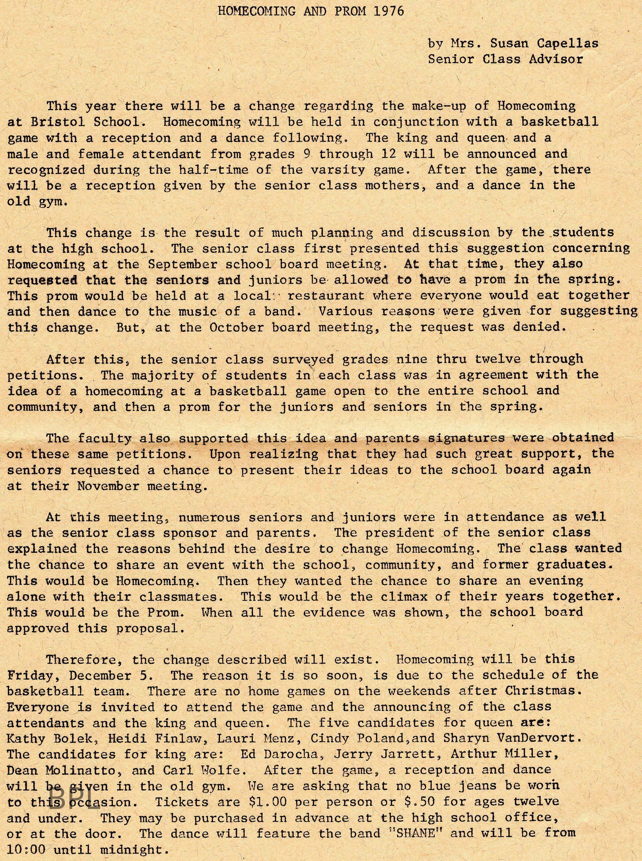 Letter of senior class advisor for Bristol School Board regarding changing HomecomingCataloged By