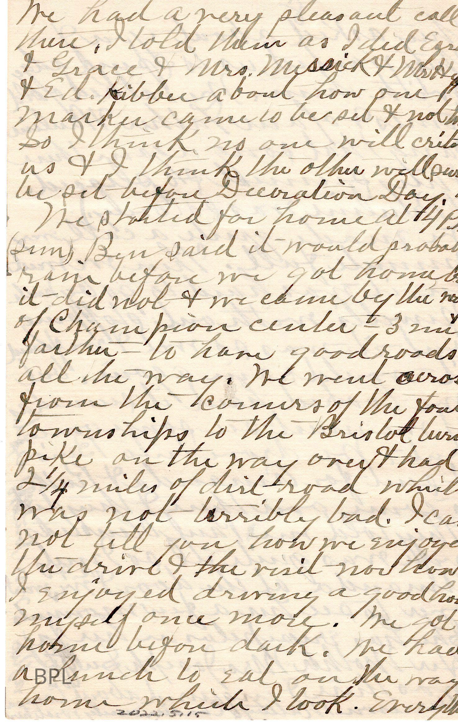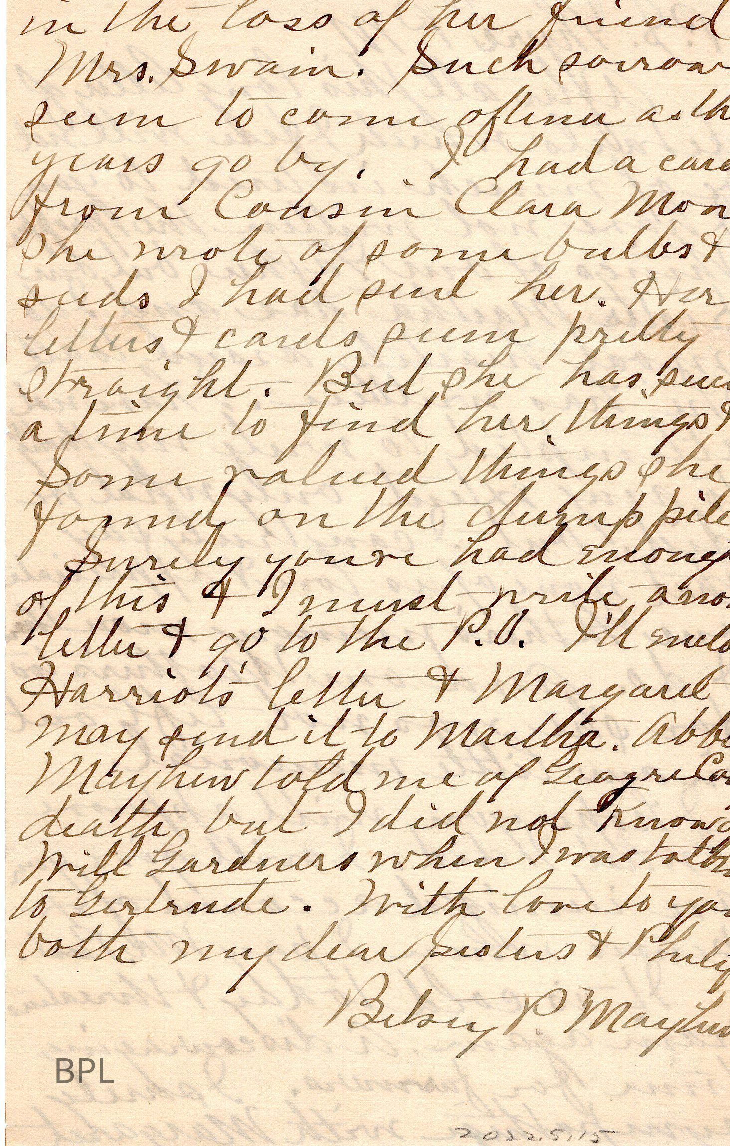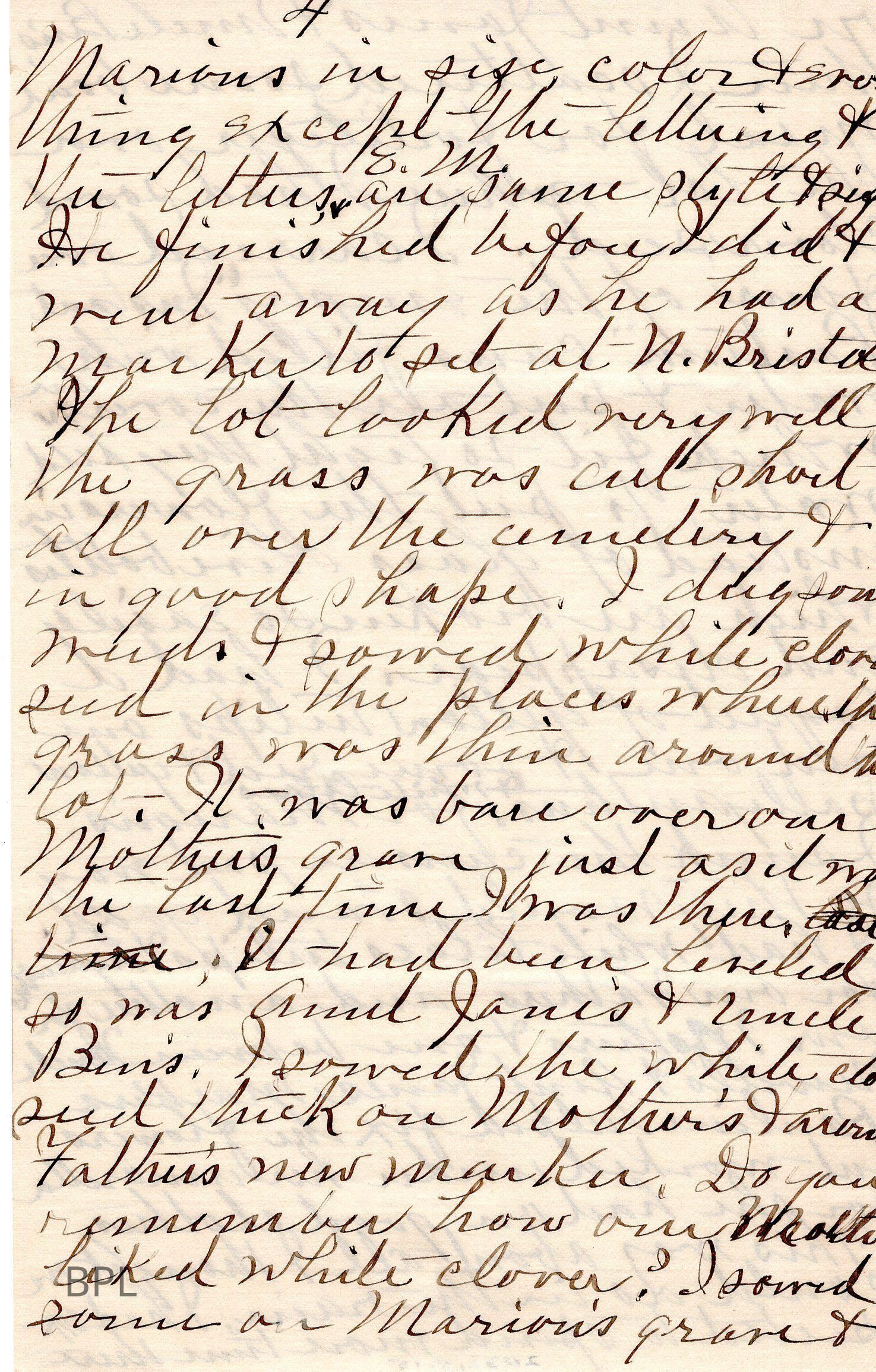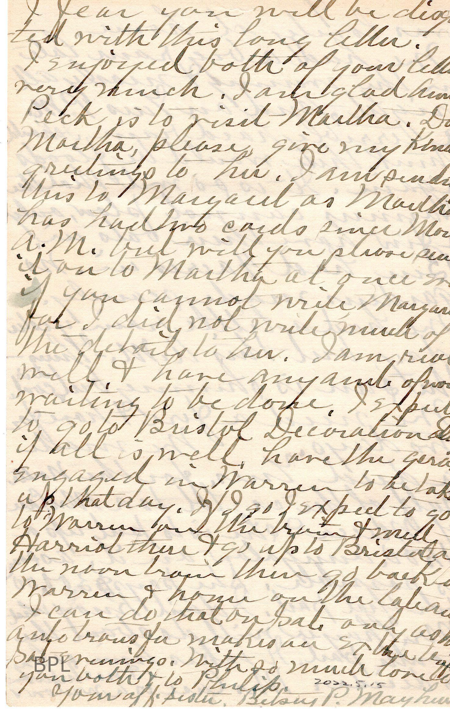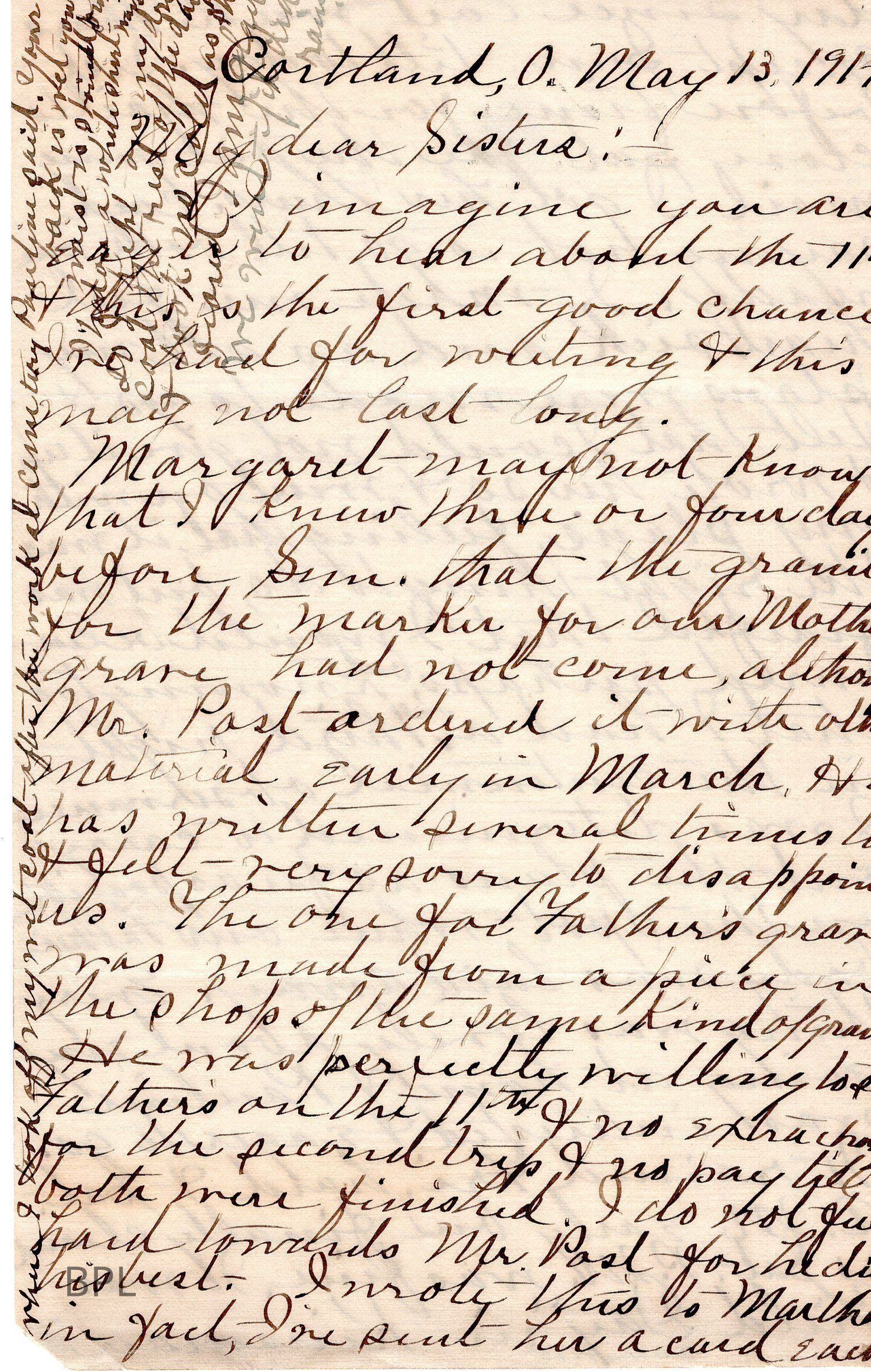 Letter from Betsy Patchen Mayhew to her sister, Martha Maltby, May 13, 1914, regarding Headstone at Evergreen Cemetery for their Mother. Ten Pages, (both sides)Cataloged By