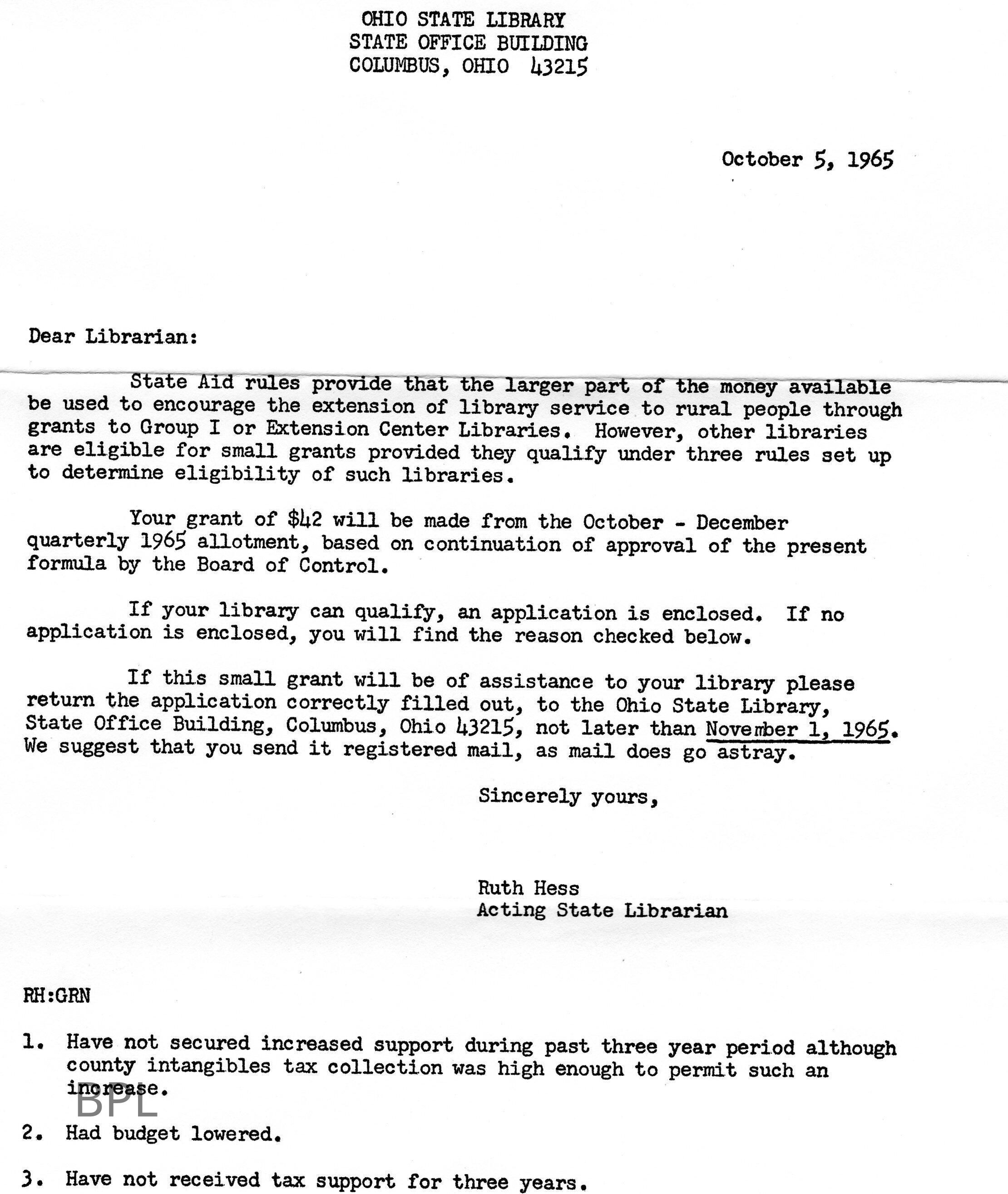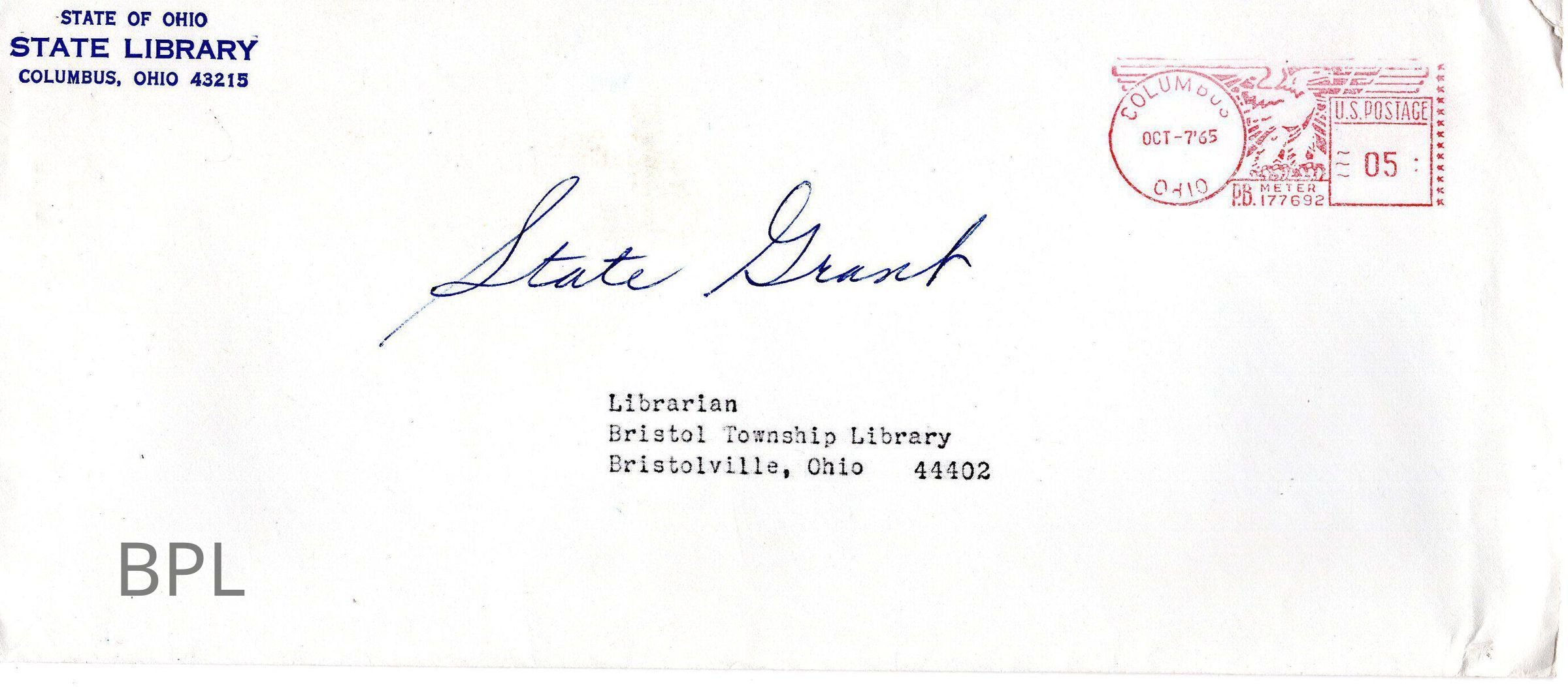 Envelope and letter from Ohio State Library, Columbus, Ohio, October 5, 1965 regarding grant monies received and applicationCataloged By