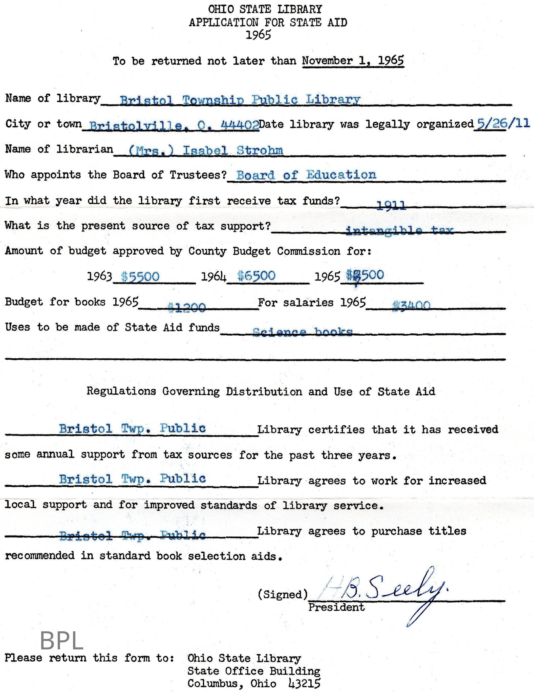 Ohio Board of Library Commissioners, Bristol Township Library, Strohm, Isabel, Seely, H. B.