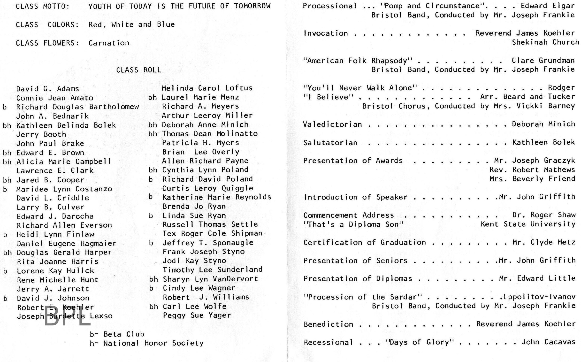 Bristol School, Adams, David G., Amato, Connie Jean, Bartholomew, Richard Douglas, Bednarik, John A., Bolek, Kathleen Belinda, Booth, Jerry, Brake, John Paul, Brown, Edward E., Campbell, Alicia Marie, Clark, Lawrence E., Cooper, Jared B., Costanzo, Maridee Lynn, Criddle, David L., Culver, Larry B., Darocha, Edward J., Everson, Richard Allen, Finlaw, Heidi Lynn, Hagmaier, Daniel Eugene, Harper, Douglas Gerald, Harris, Rita Joanne, Hulick, Lorene Kay, Hunt, Rene Michelle, Jarrett, Jerry A., Johnson, David J., Koehler, Robert E., Lexso, Joseph Burdette, Loftus, Melinda Carol, Menz, Laurel Marie, Miller, Arthur Leeroy, Minich, Deborah Anne, Molinatto, Thomas Dean, Myers, Patricia H., Overly, Brian Lee, Payne, Allen Richard, Poland, Cynthia Lynn, Poland, Richard David, Quiggle, Curtis Leroy, Reynolds, Katherine Marie, Ryan, Brenda Jo, Ryan, Linda Sue, Settie, Russell Thomas, Shipman, Tex Roger Cole, Sponaugle, Jeffrey T., Styno, Jodi Kay, Suderland, Timothy Lee, VanDervort, Sharyn Lyn, Wagner, Cindy Lee, Williams, Robert J., Wolfe, Carl Lee, Yager, Peggy Sue, Frankie, Joseph, Koehler, James Rev, Barney, Vickki, Graczyk, Joseph, Mathews, Robert Rev., Friend, Beverly, Griffith, John, Shaw, Roger Dr., Metz, Clyde, Little, Edward, Mahan, Ray K., Snyder, Nancy, Clutter, Ernest, Noble, Conrad, Wolfe, Lee A., Capellas, Susan, Ashelman, Sally, Bates, Edward, Bundy, Linda, Burkhart, Richard, Gerber, Paula, Hadley, Herbert, Hallow, Richard, Jones, Karen, Kalas, Shirley, Kopple, William, Kovalak, Stanley, Messersmith, John, Omerzo, Yvonne, Ritch, Joseph, Schneider, Mai Lin, Stein, Nanette, Volz, Susan, Wajda, Edward