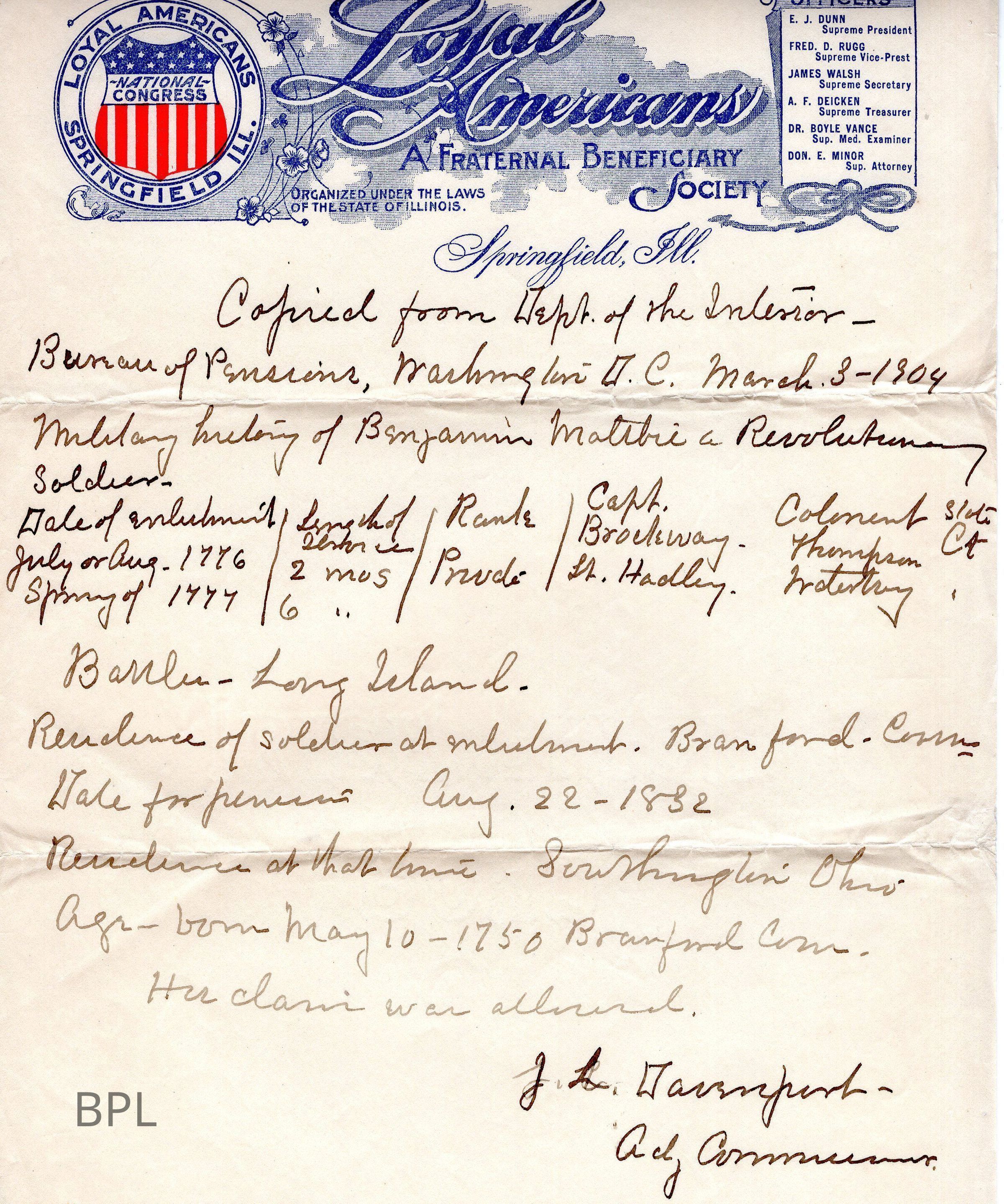 Military History of Maltby Family, March 3, 1904, from Dept. of Interior Bureau of Pensions, Washington, D.C. Benjamin Maltbie was a Revolutionary Solider. Date of Enlistment, July or August 1776Cataloged By