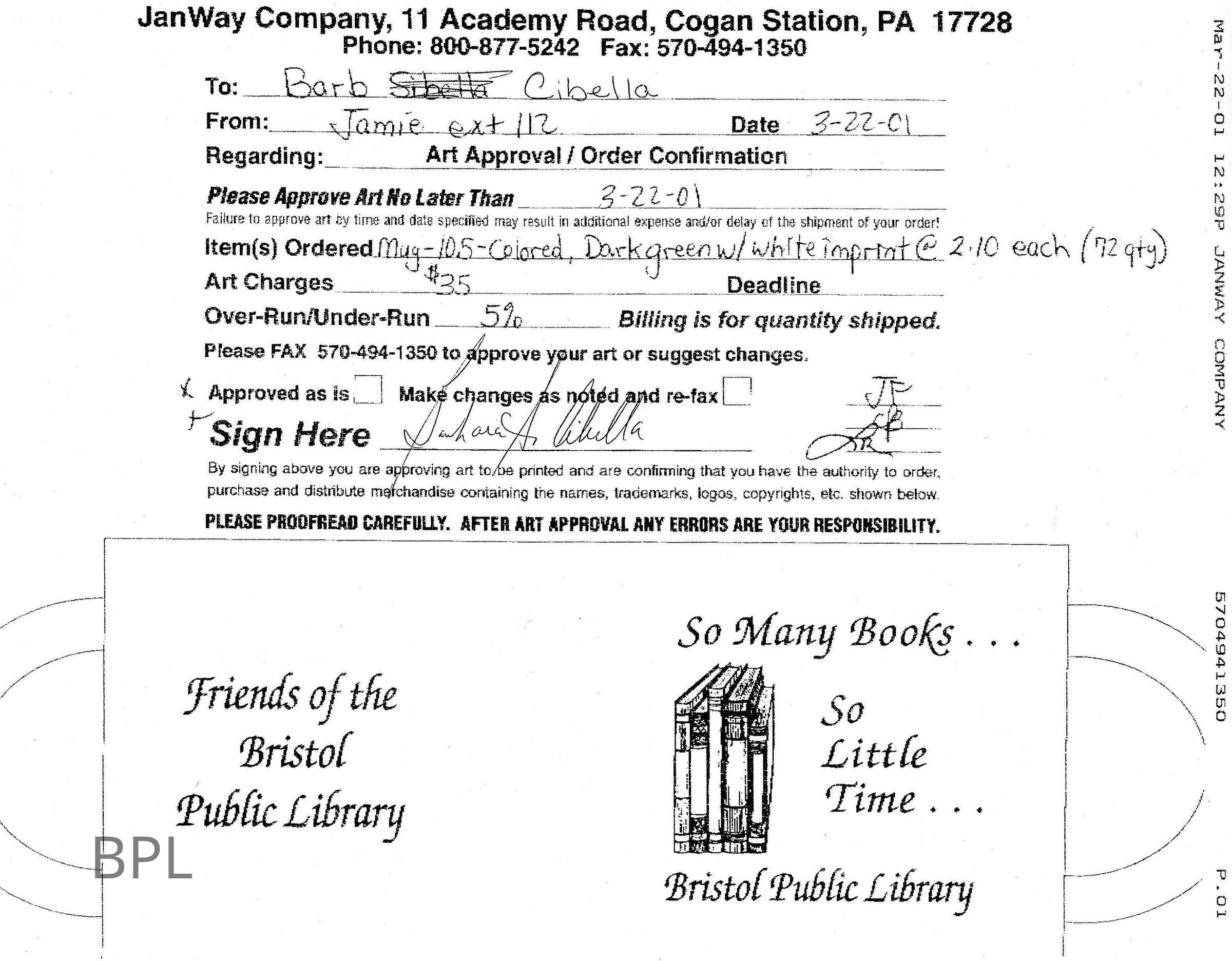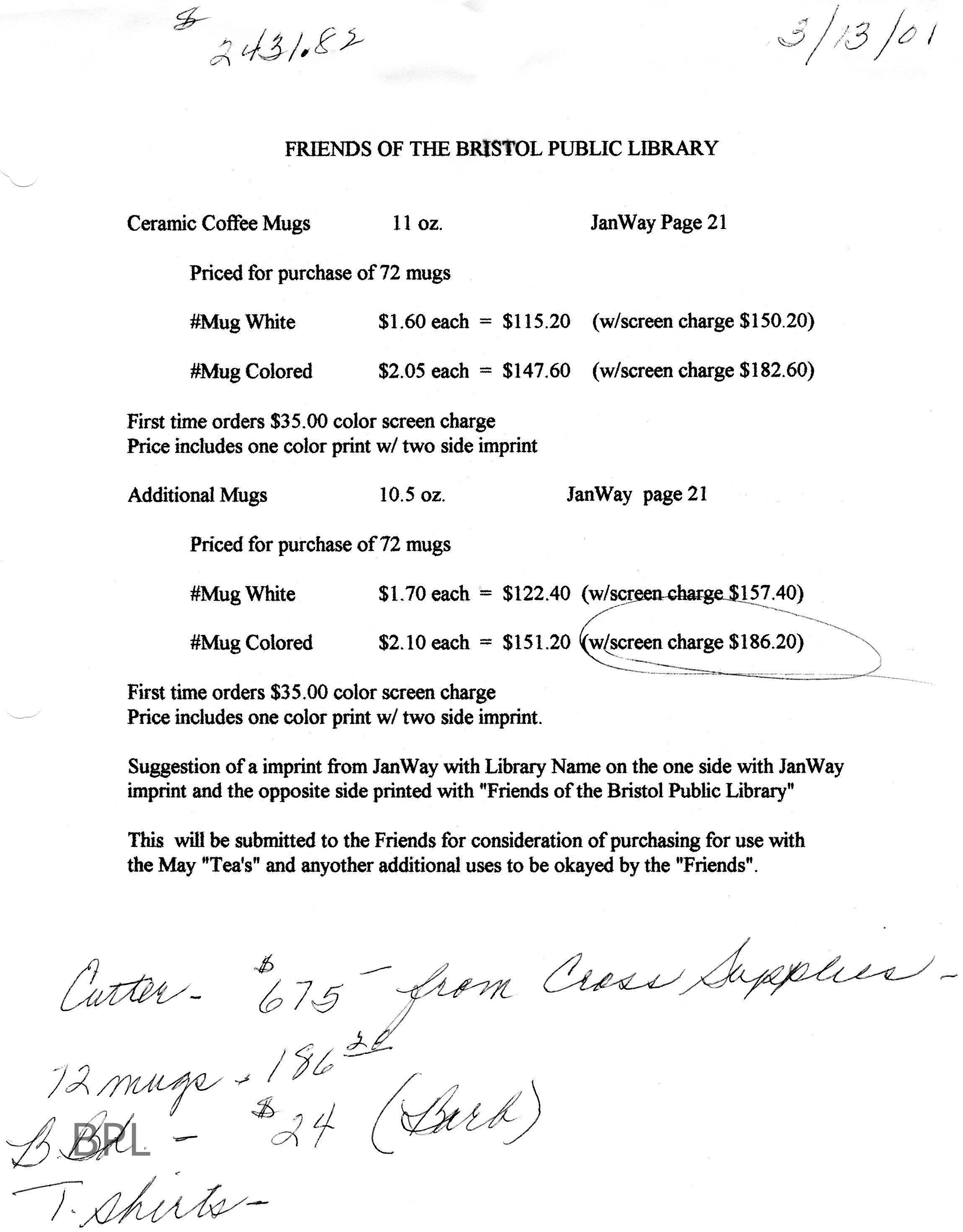 Invoice, Friends Bristol Public Library for Mugs, March 22, 2001Cataloged By