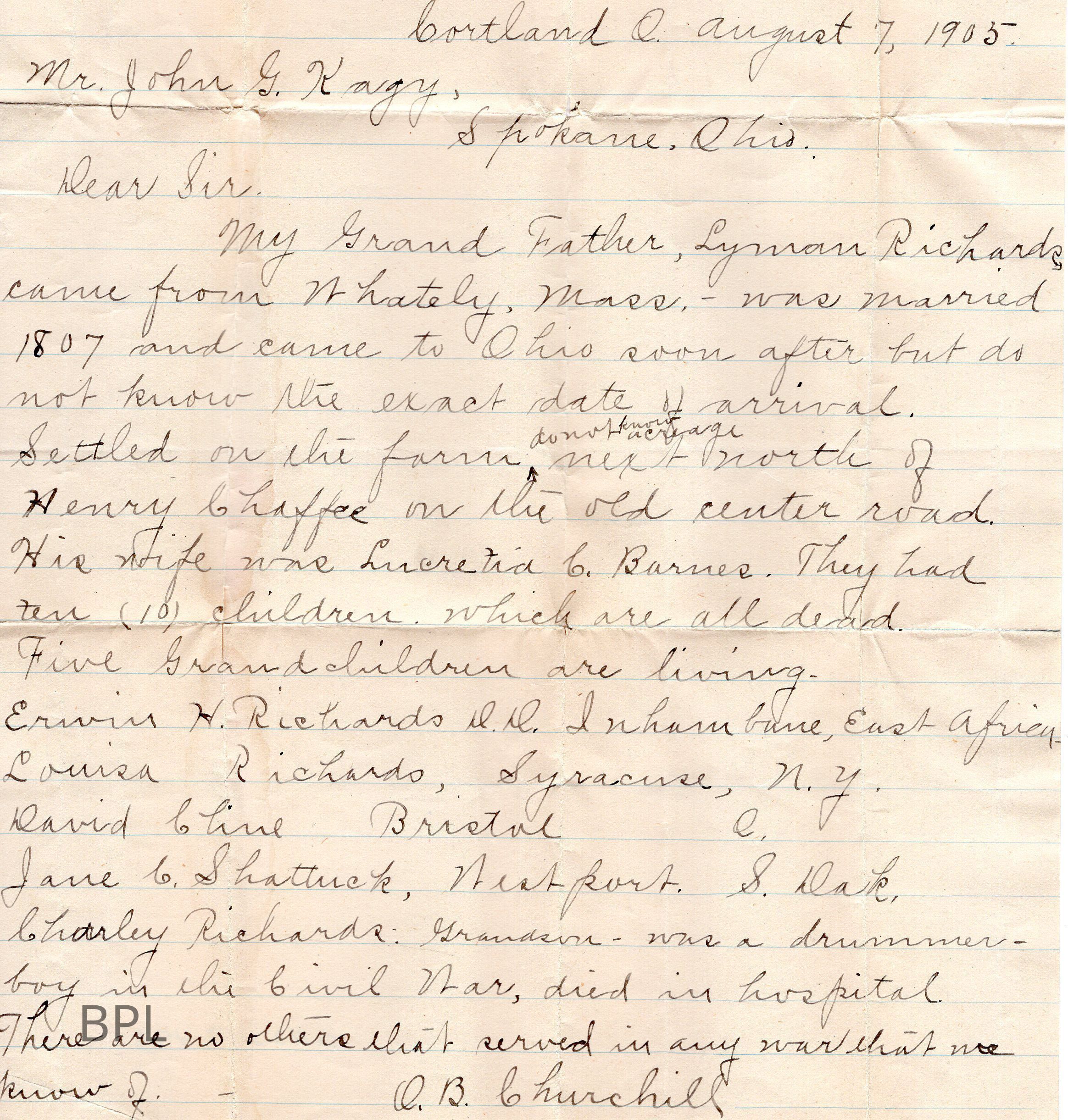 Envelope and Letter to John Kagy from O.B. Churchill Regarding History of Lyman RichardsCataloged By