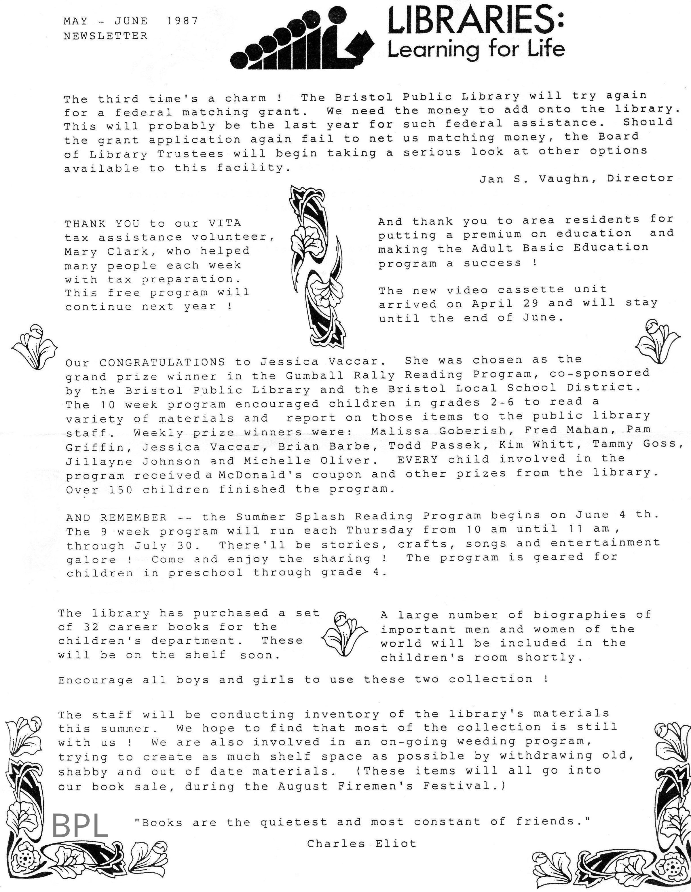 Bristol Public Newsletter, May, June 1087Cataloged By