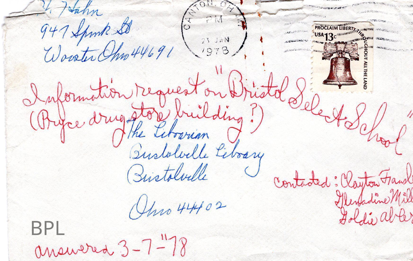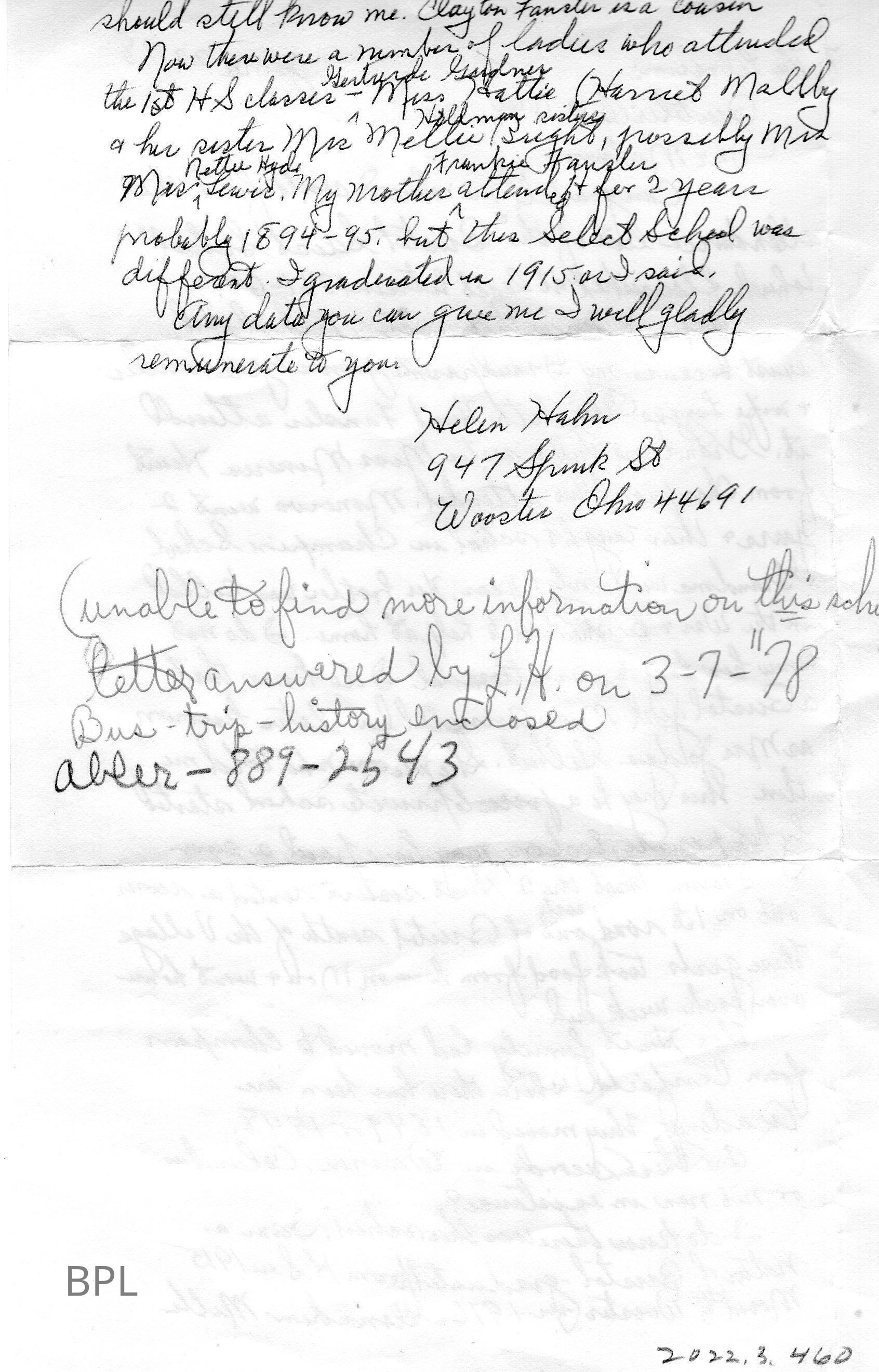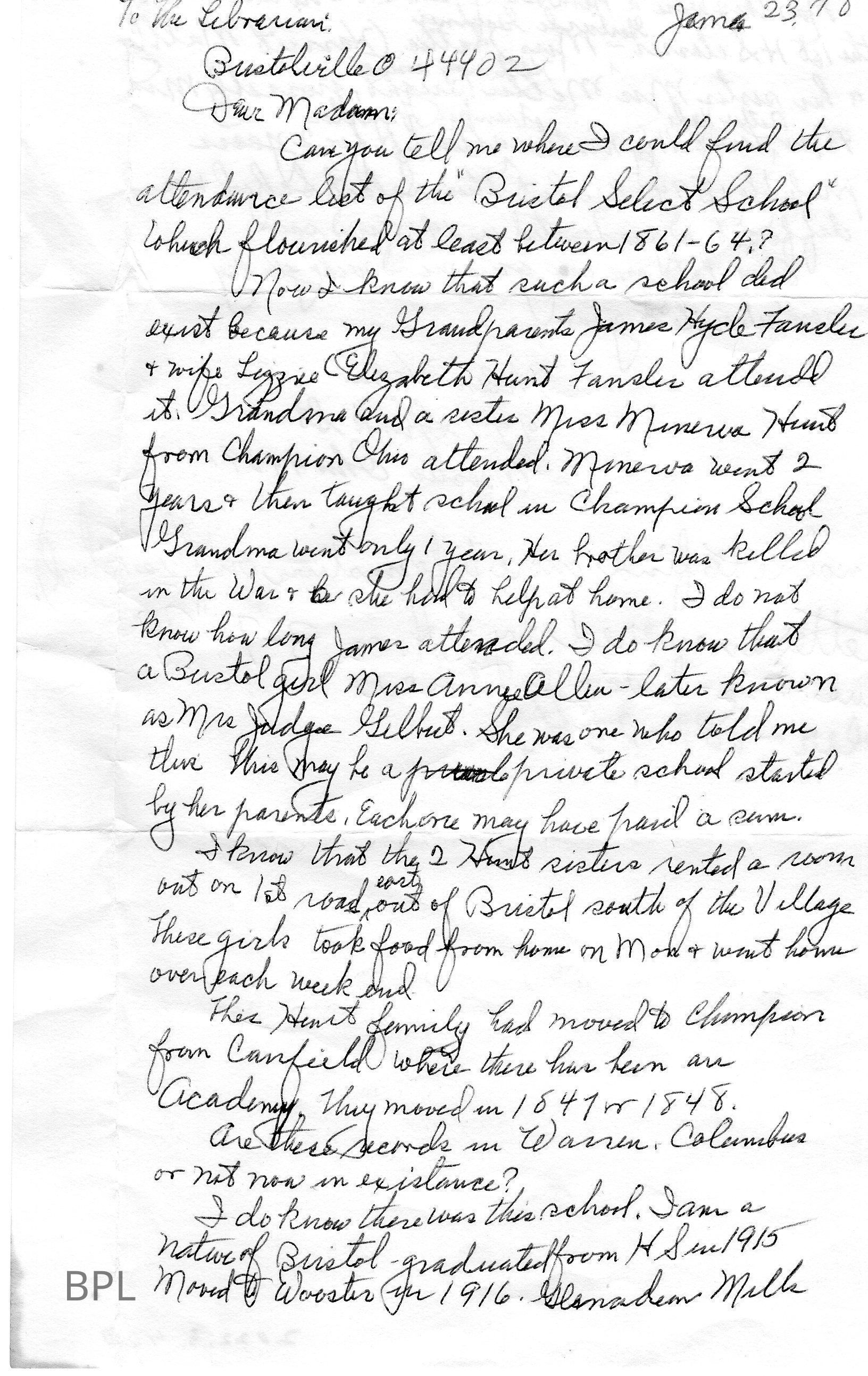 Envelope and letter to Bristol Librarian from Helen Hahn requesting attendance list of Bristol Select School for years 1861-1864Cataloged By