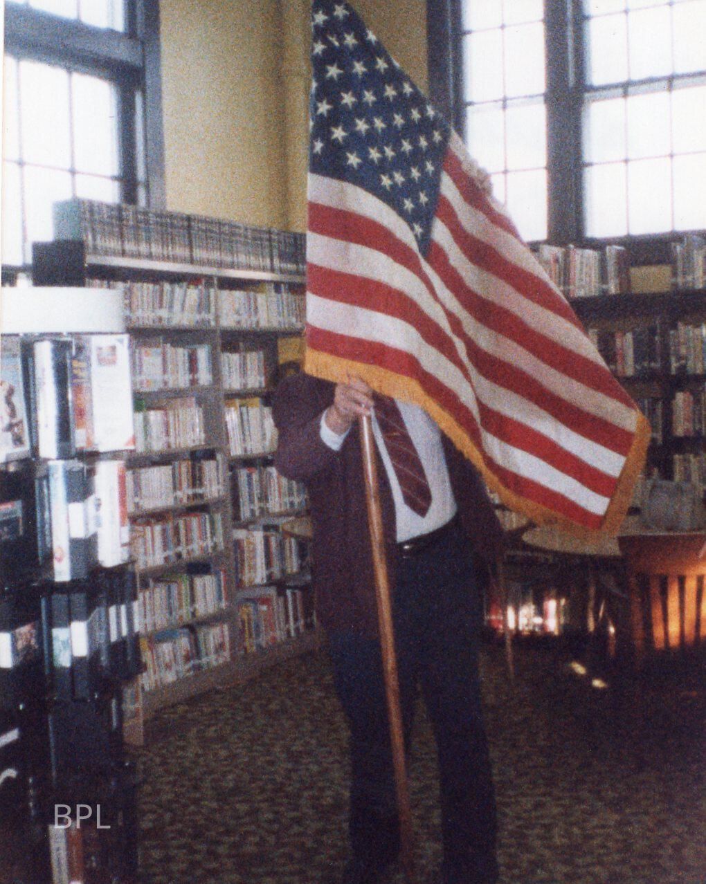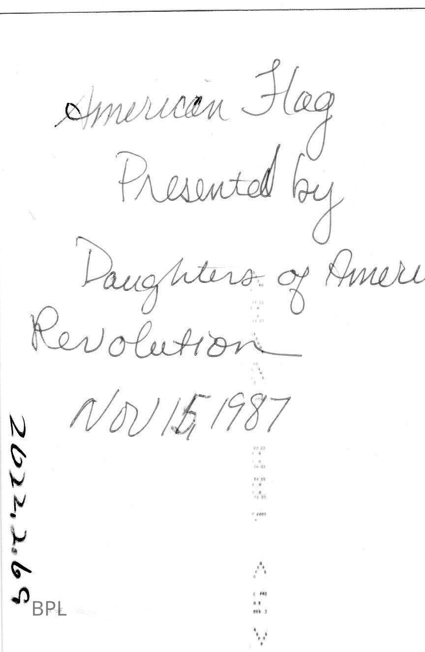 Photo of American flag presented to Bristol Public Library by the Daughters of American Revolution, November 15, 1987.Cataloged By