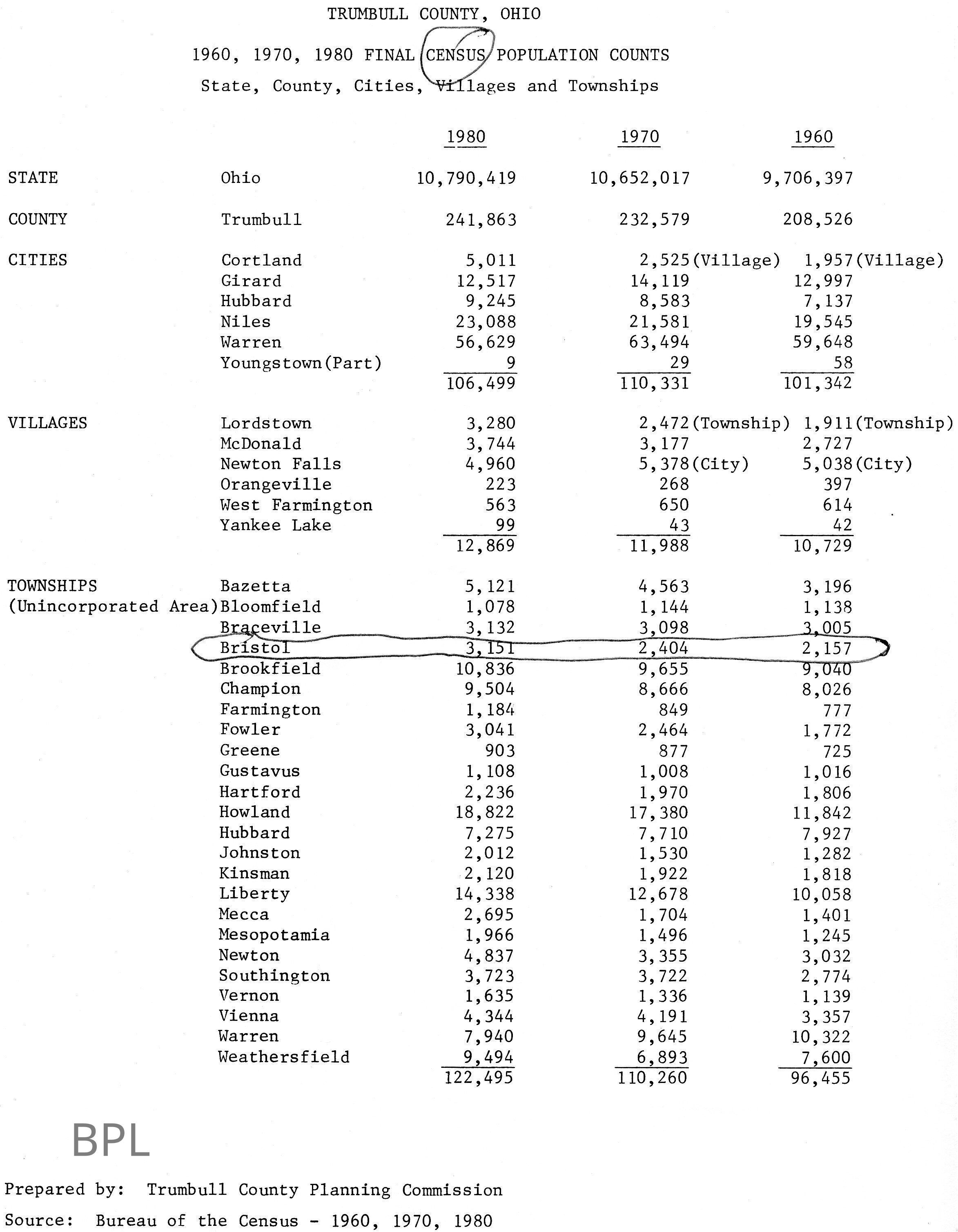 Trumbull County Census, 1960, 1970, 1980 CensusCataloged By