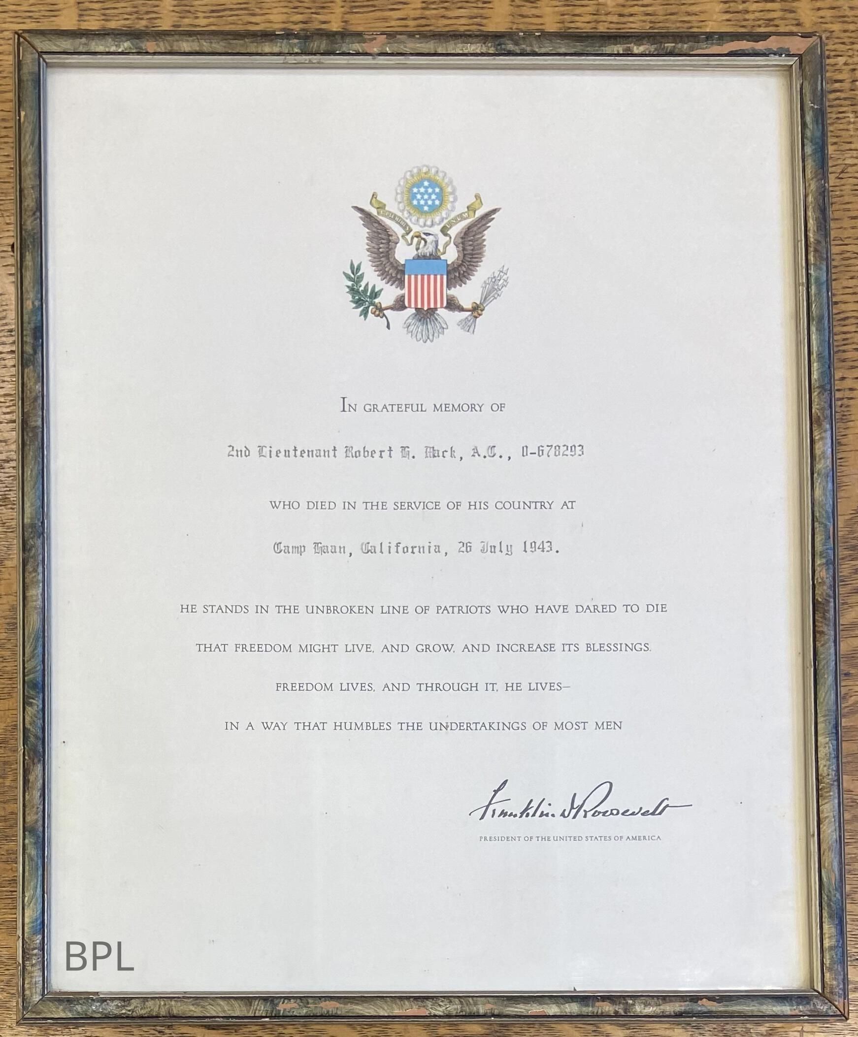 Memorial Certificate from Federal government for Robert Mack.Cataloged By