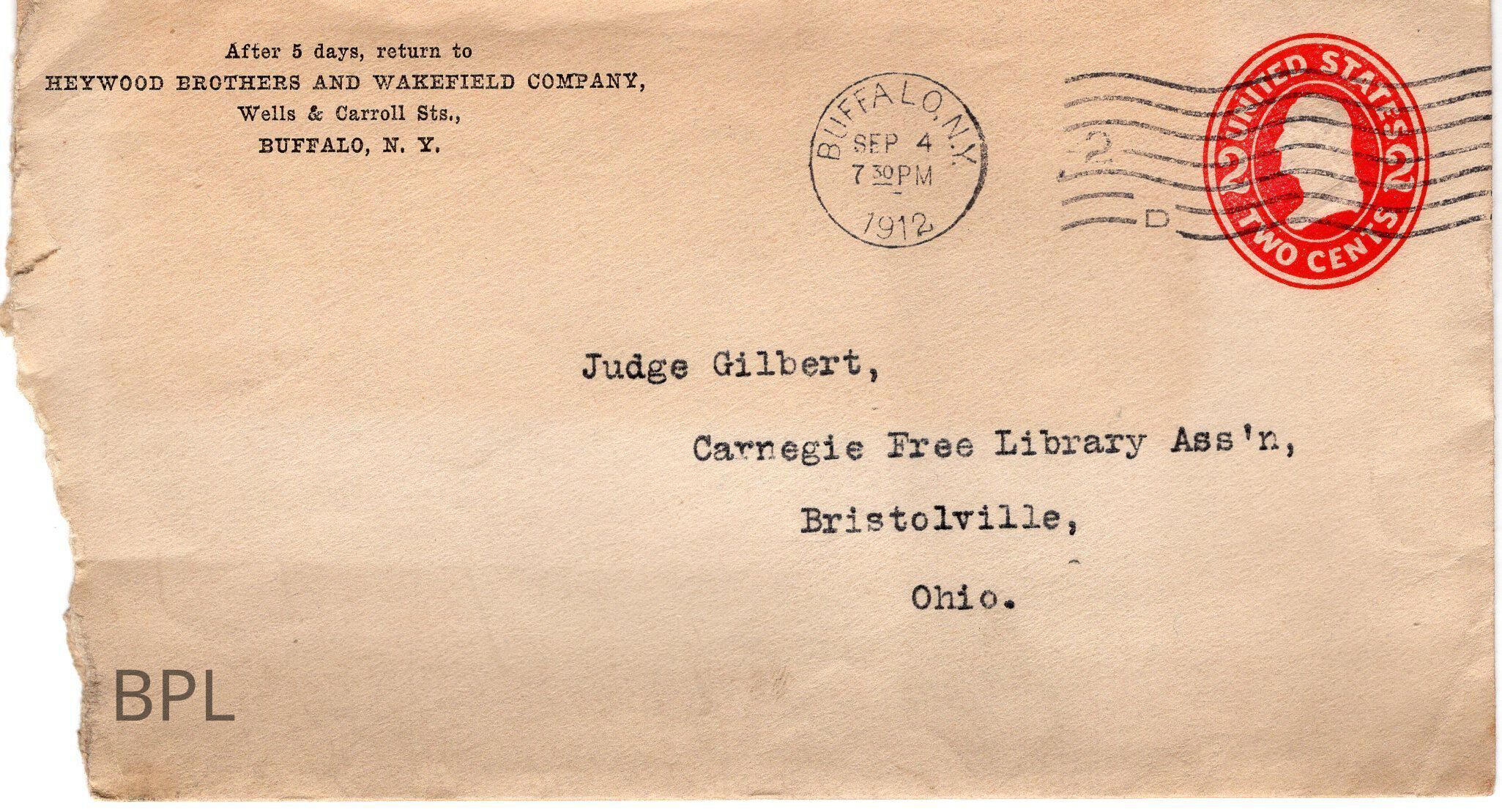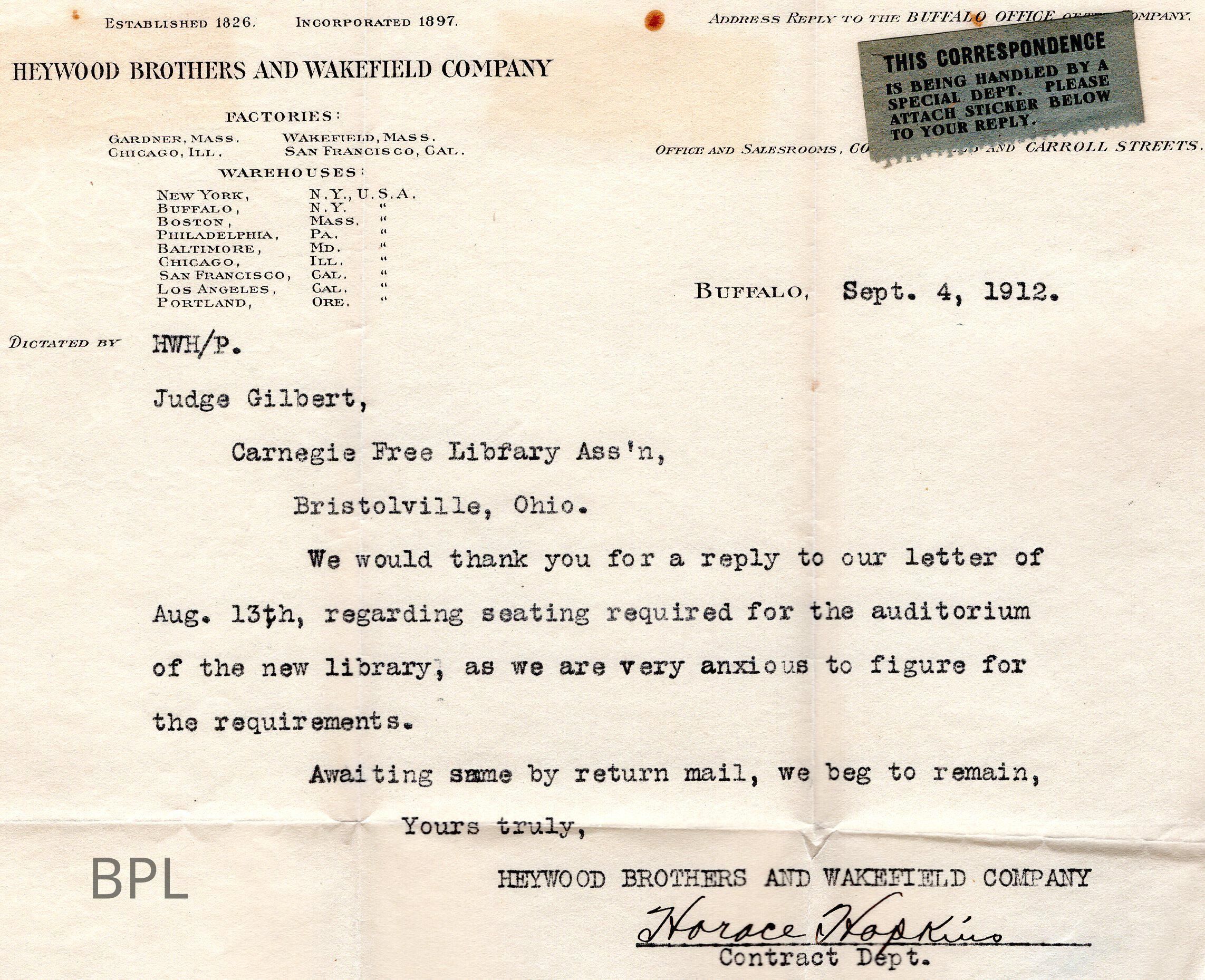 Envelope and letter to Judge Gilbert from Heywood brothers and Wakefield Company of Buffalo. New York for sale of seating for auditorium of library, dated September, 4, 1912.Cataloged By