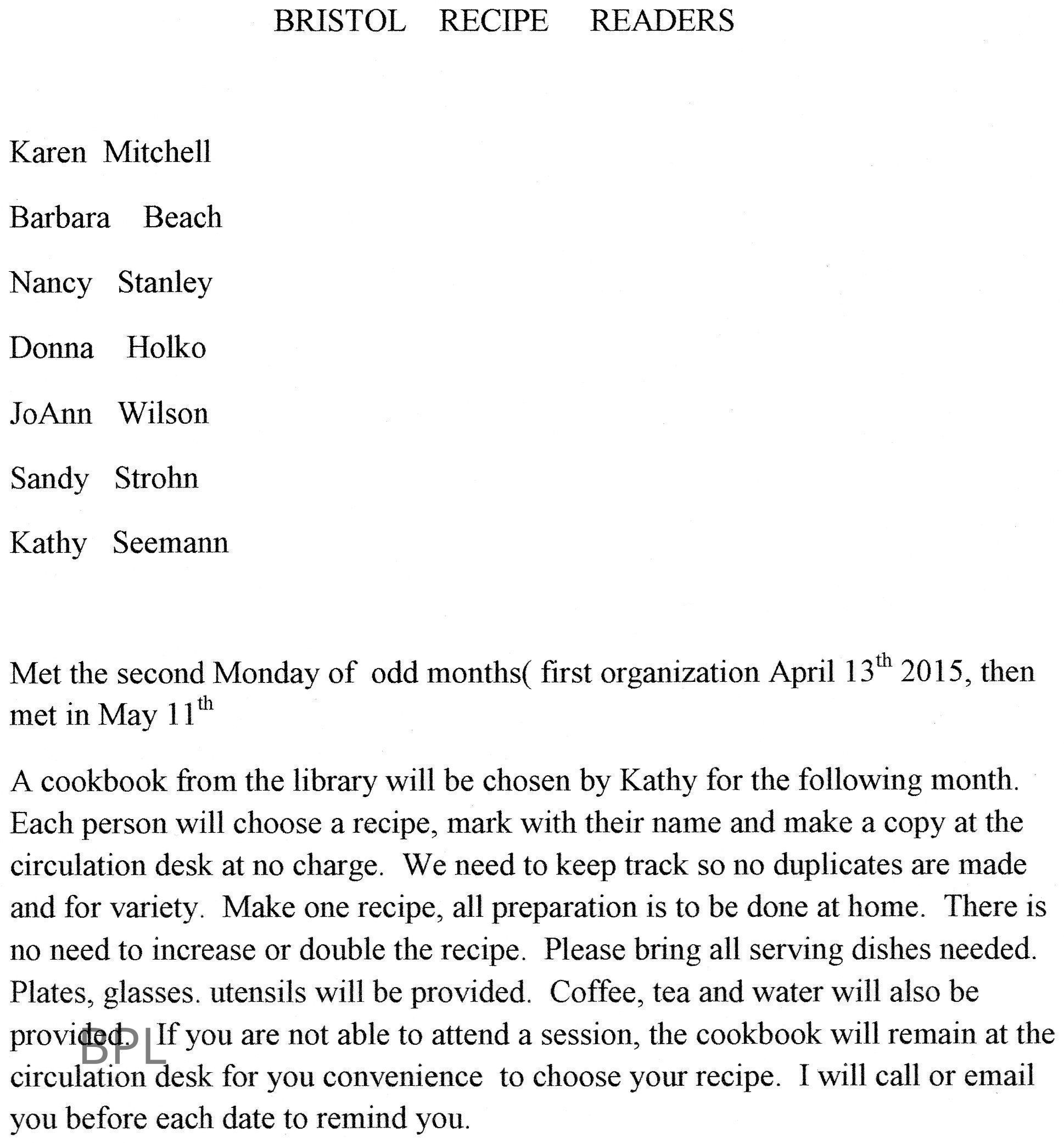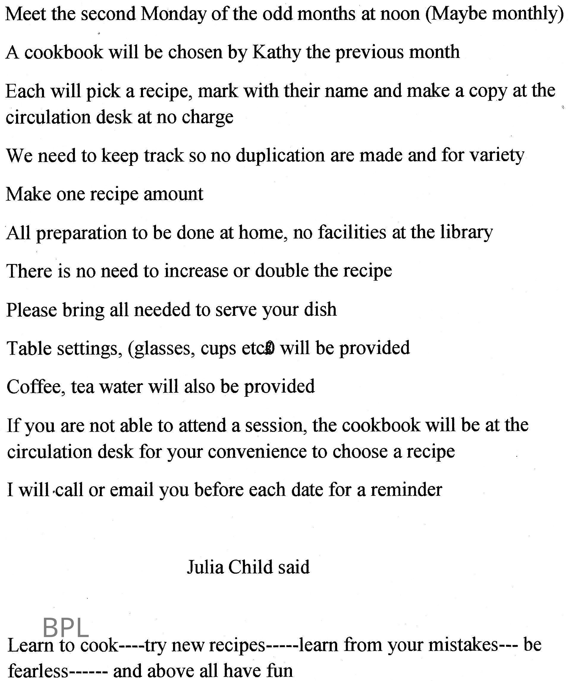 Information regarding BPL Cookbook Club, Recipe Readers