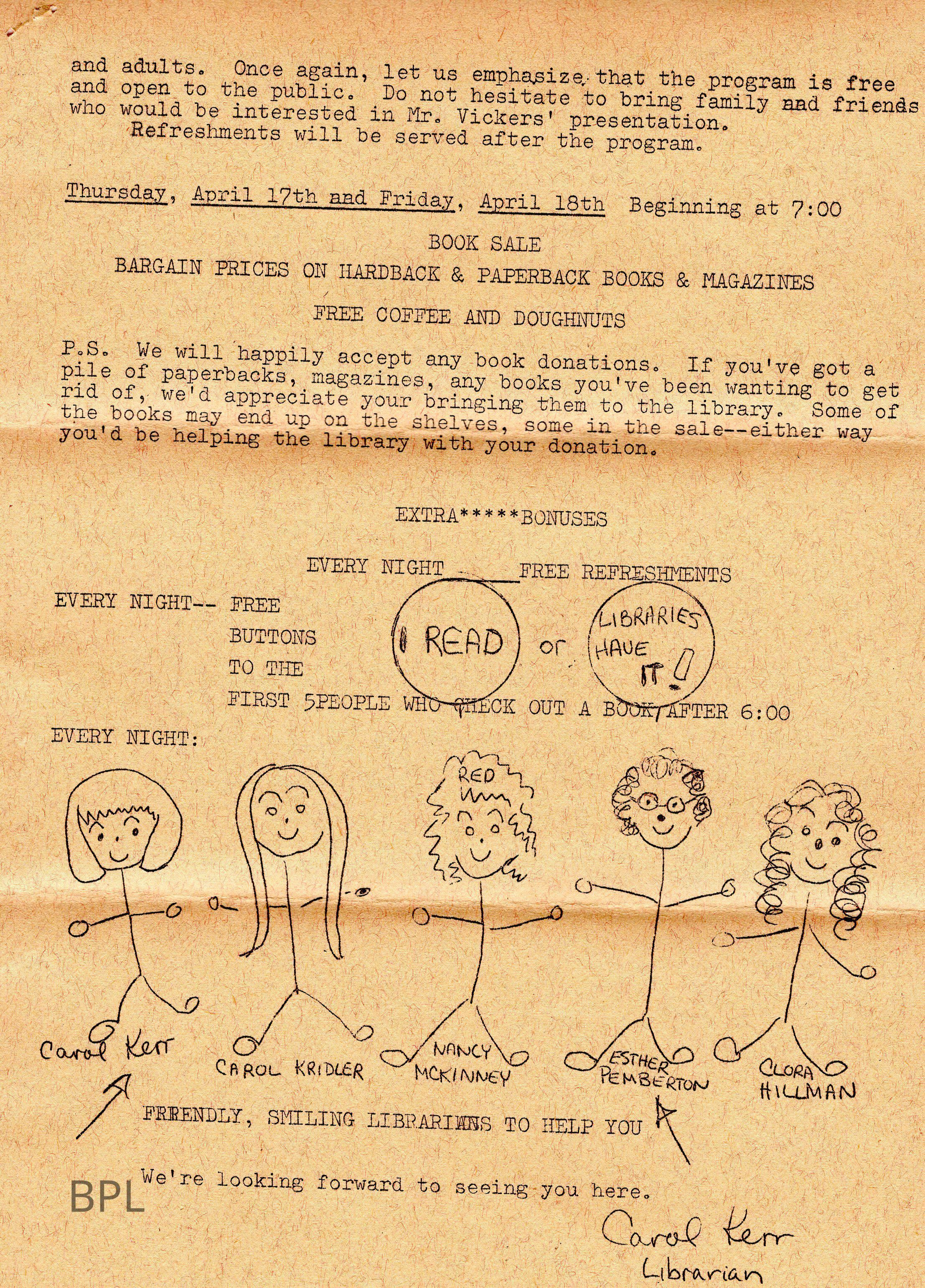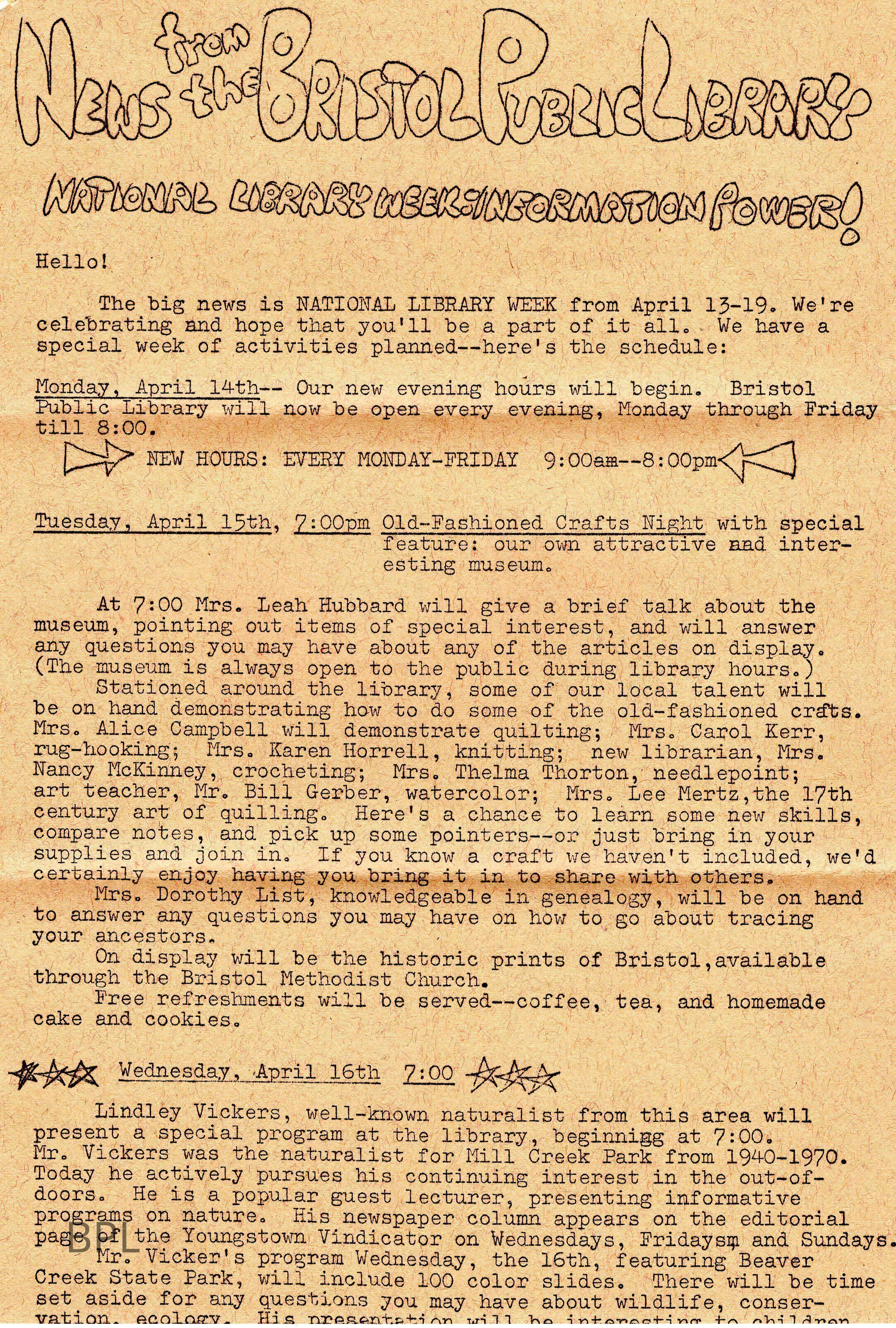 Newsletter of Bristol Public Library announcing events for National Library WeekCataloged By