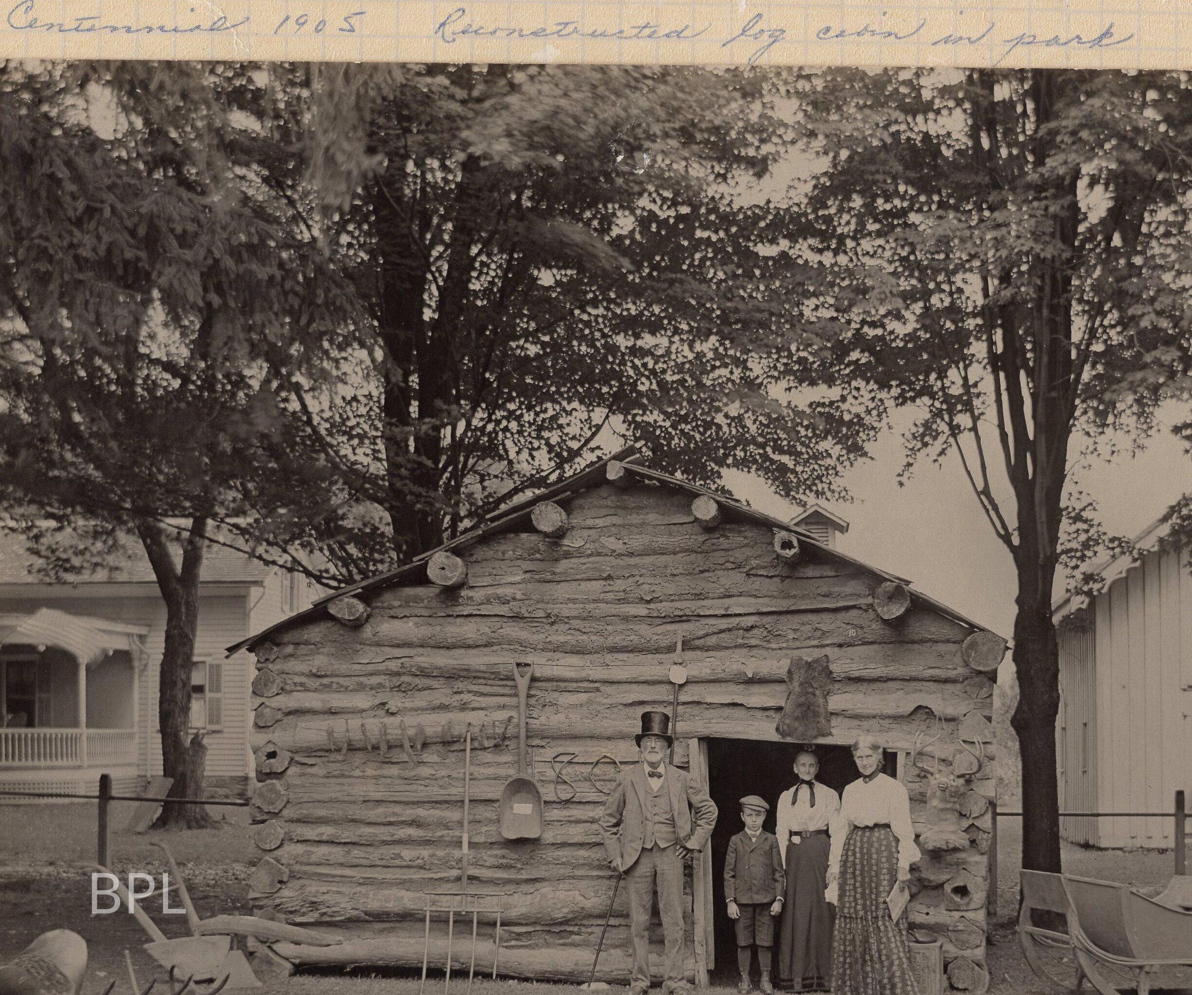 1905 Bristolville, Ohio centennial celebration at town center. A log cabin was reconstructed in the Town Park. Pictured left to right: Daniel Shaffer, Homer Barr, Mary A. Osborne NortonCataloged By
