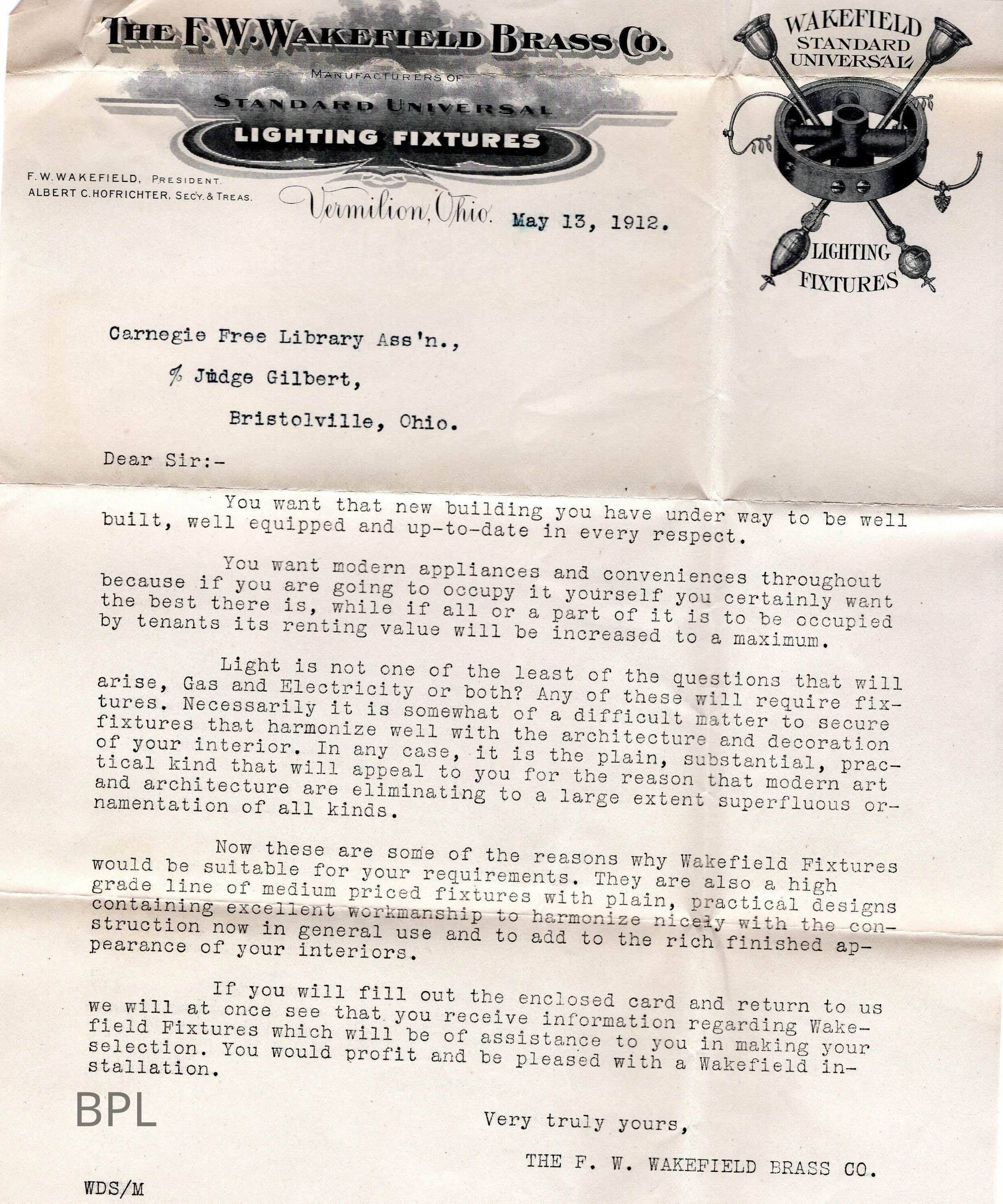 Letter to Carnegie Free Library, Judge Gilbert, dated May 13, 1912, from F.W. Wakefield Brass Company of Vermilion , Ohio for sale of lighting fixtures.Cataloged By