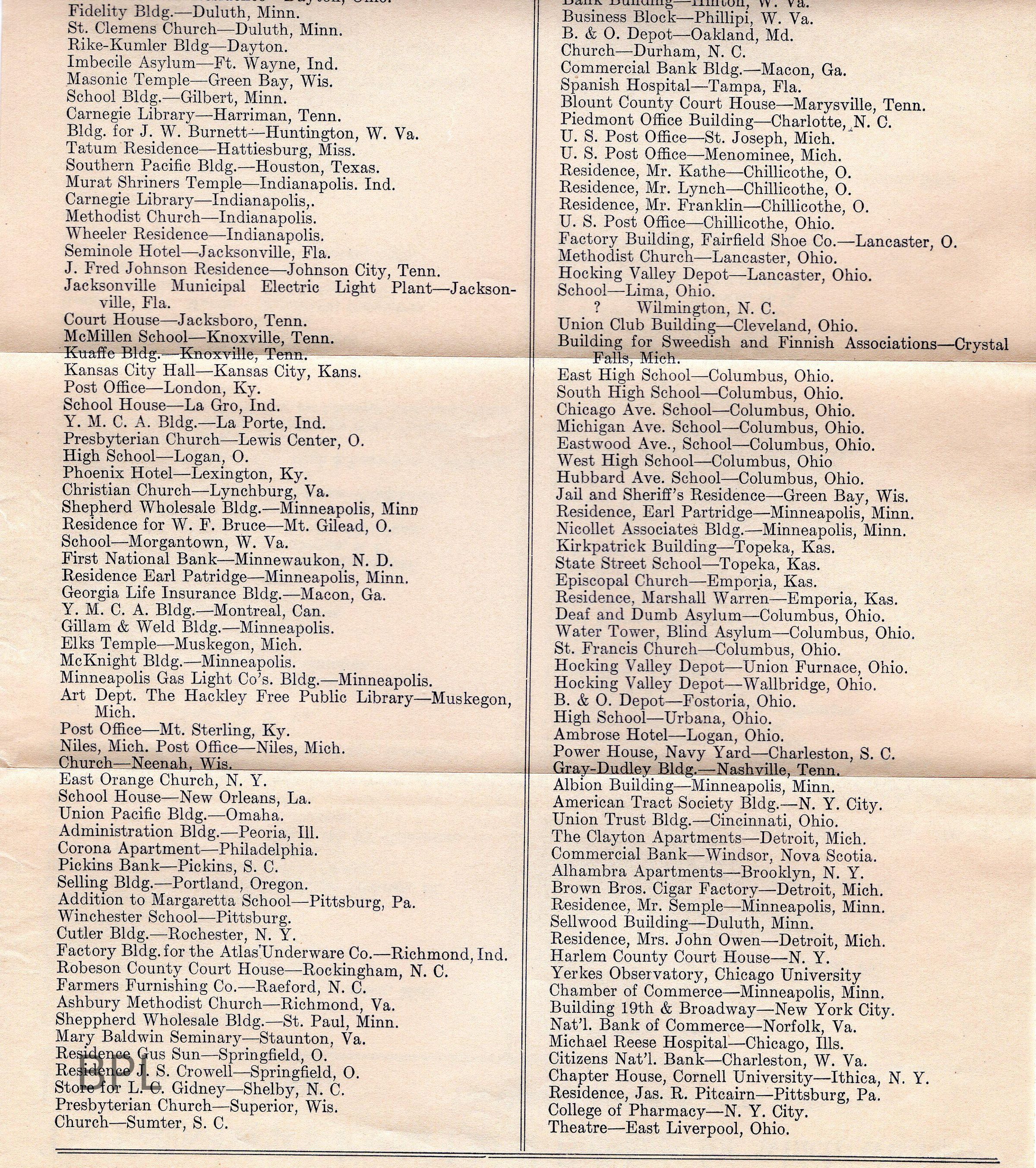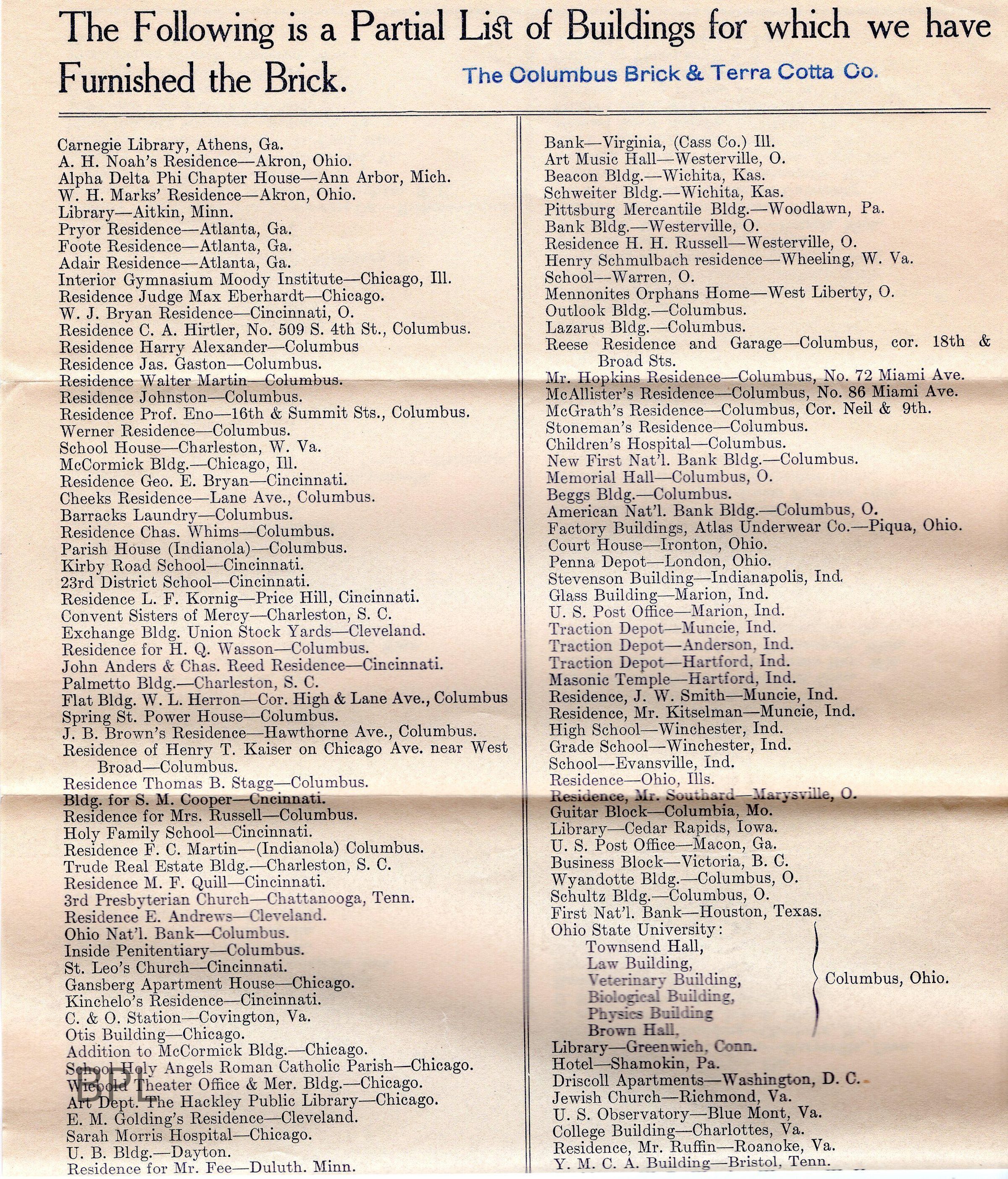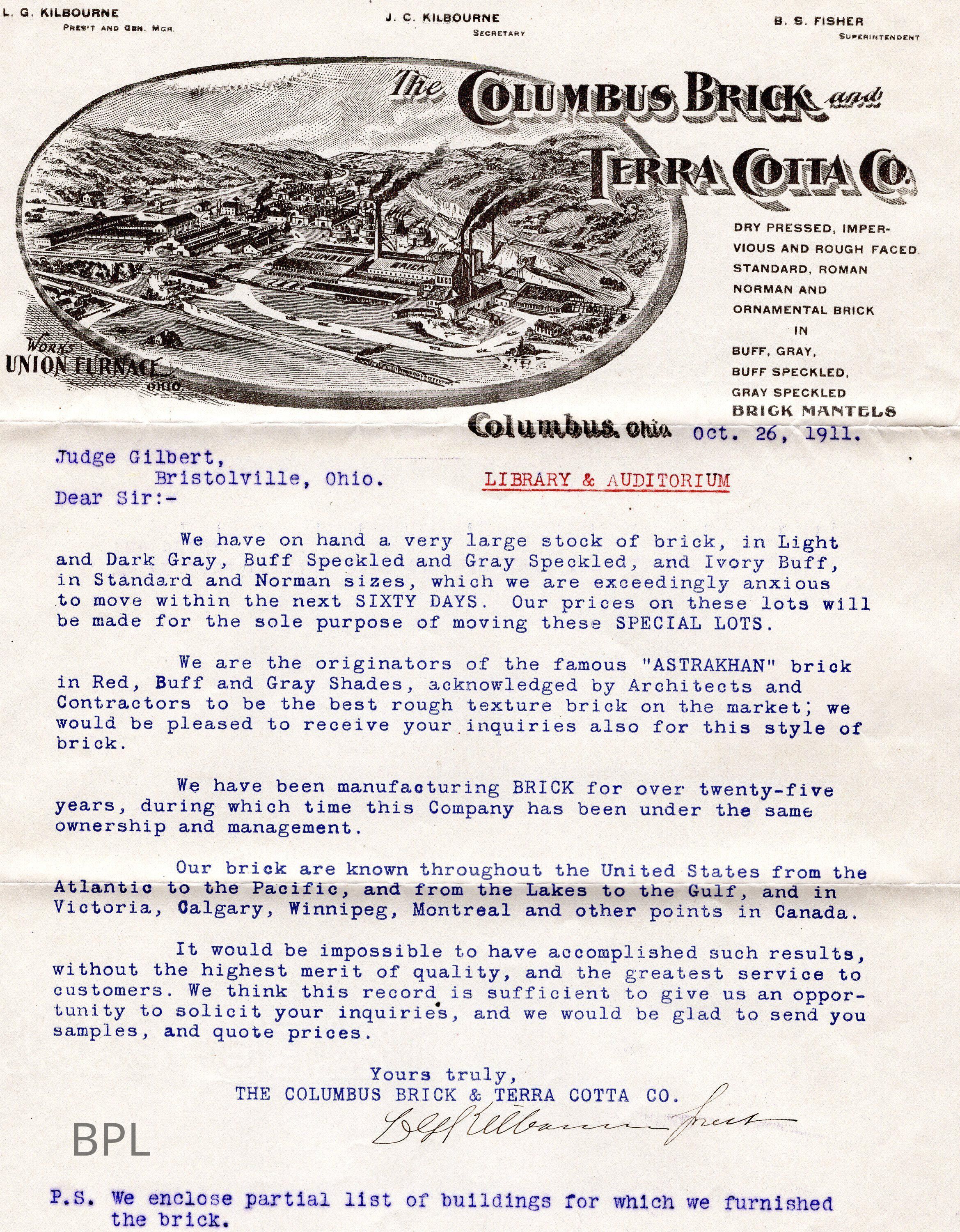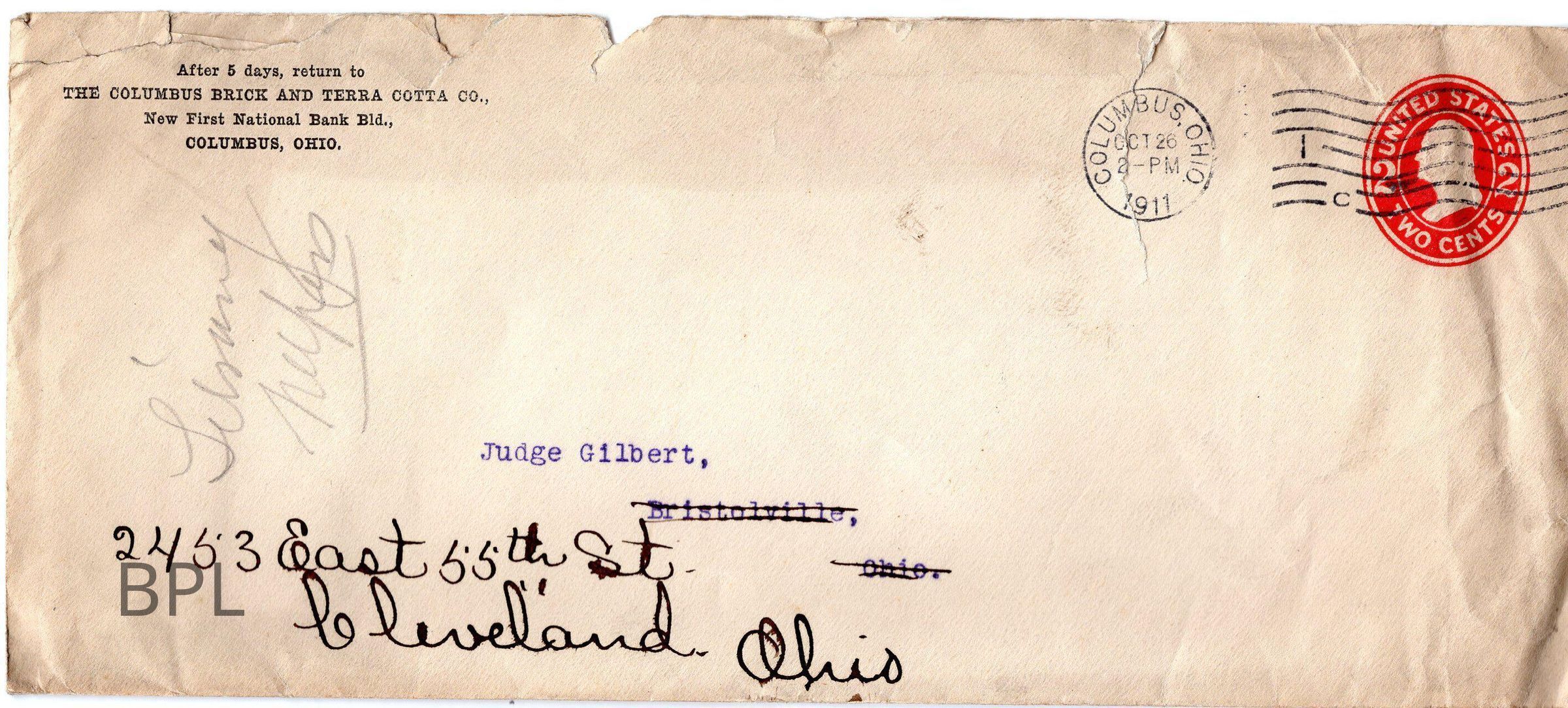 Envelope, letter and listing of buildings bricks supplied for by Columbus Brick and Terra Cotta Company to Judge N.A. Gilbert, October 26, 1911Cataloged By