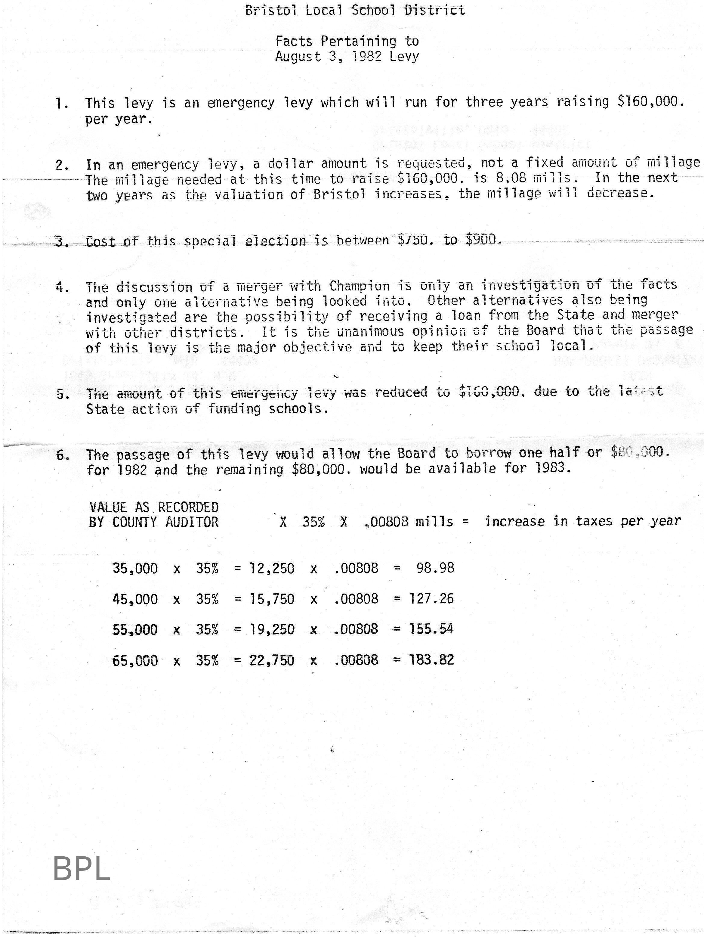 Bristol School Report, August 3, 1982, regarding upcoming levyCataloged By