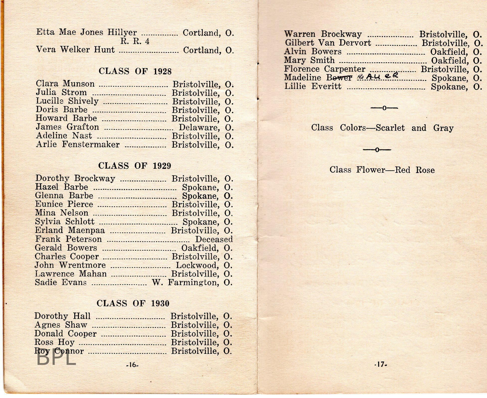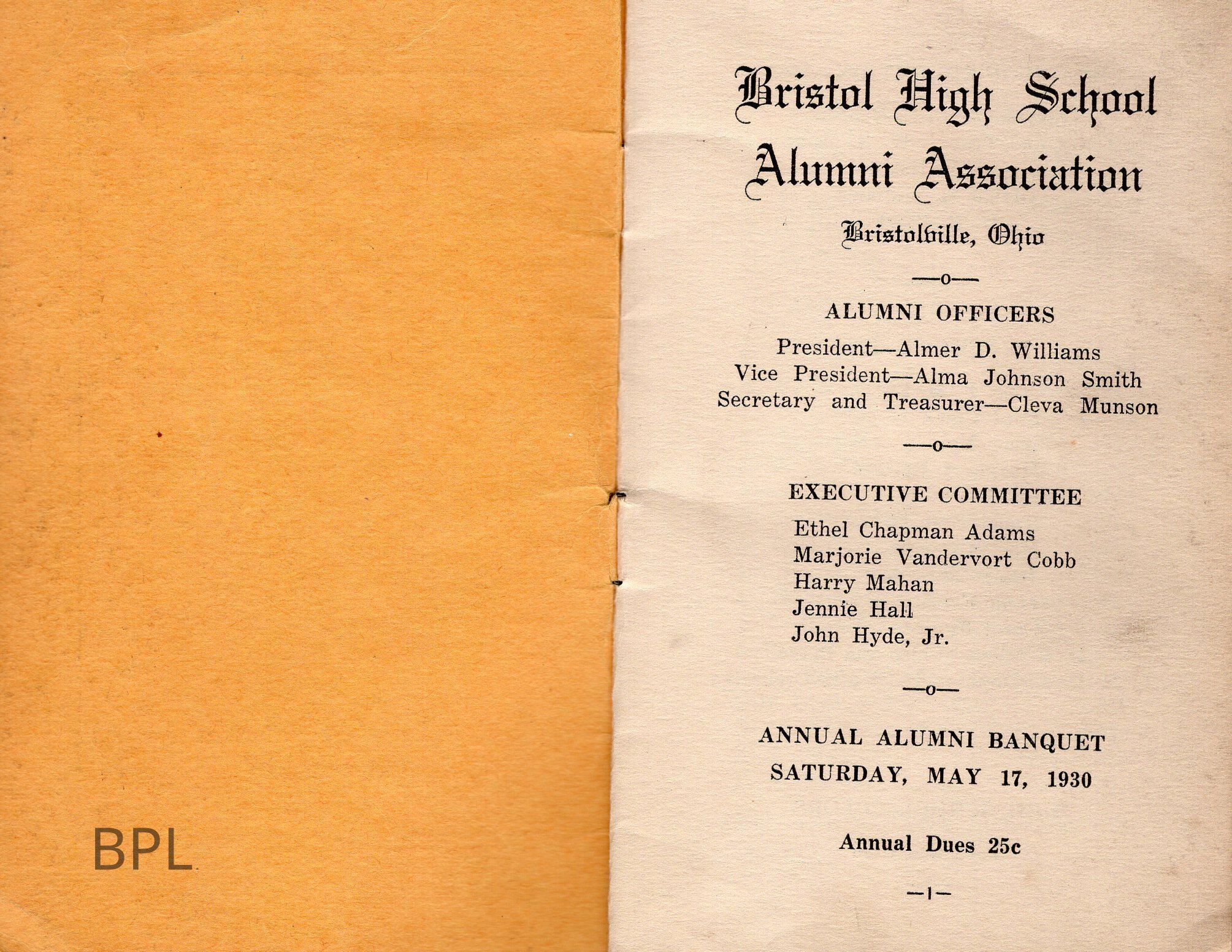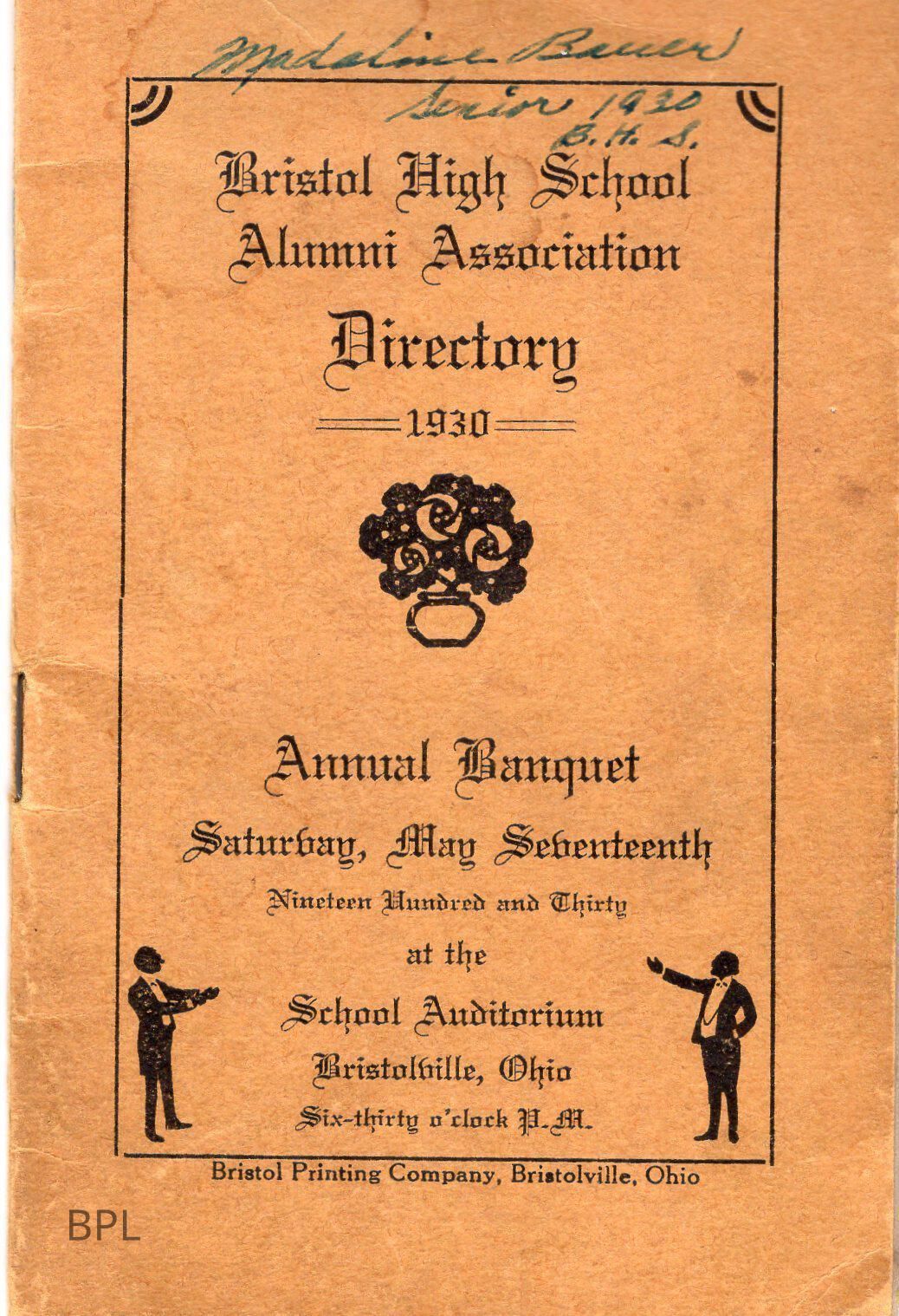 Bristol High School Alumni Association Directory 1930.Alumni organized in 1895. Names of Board of Education (1930), teachers of 1930, past superintendents, past Board of Education members, and names of graduated from classes of 1888 thru 1930Cataloged By