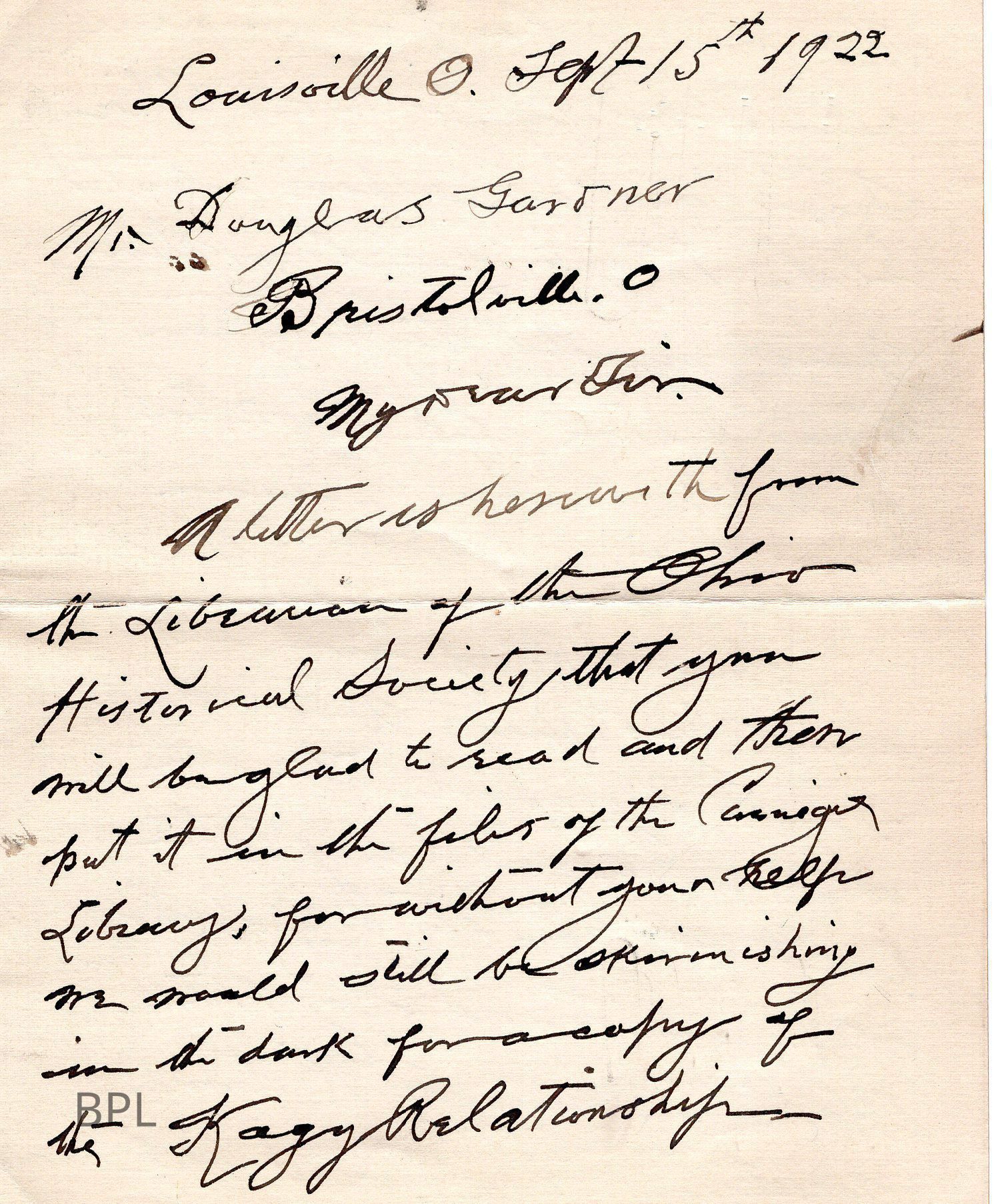 Letter from A. Ward Fenton to Douglas Gardner, September 15, 1922 with Fenton historyCataloged By
