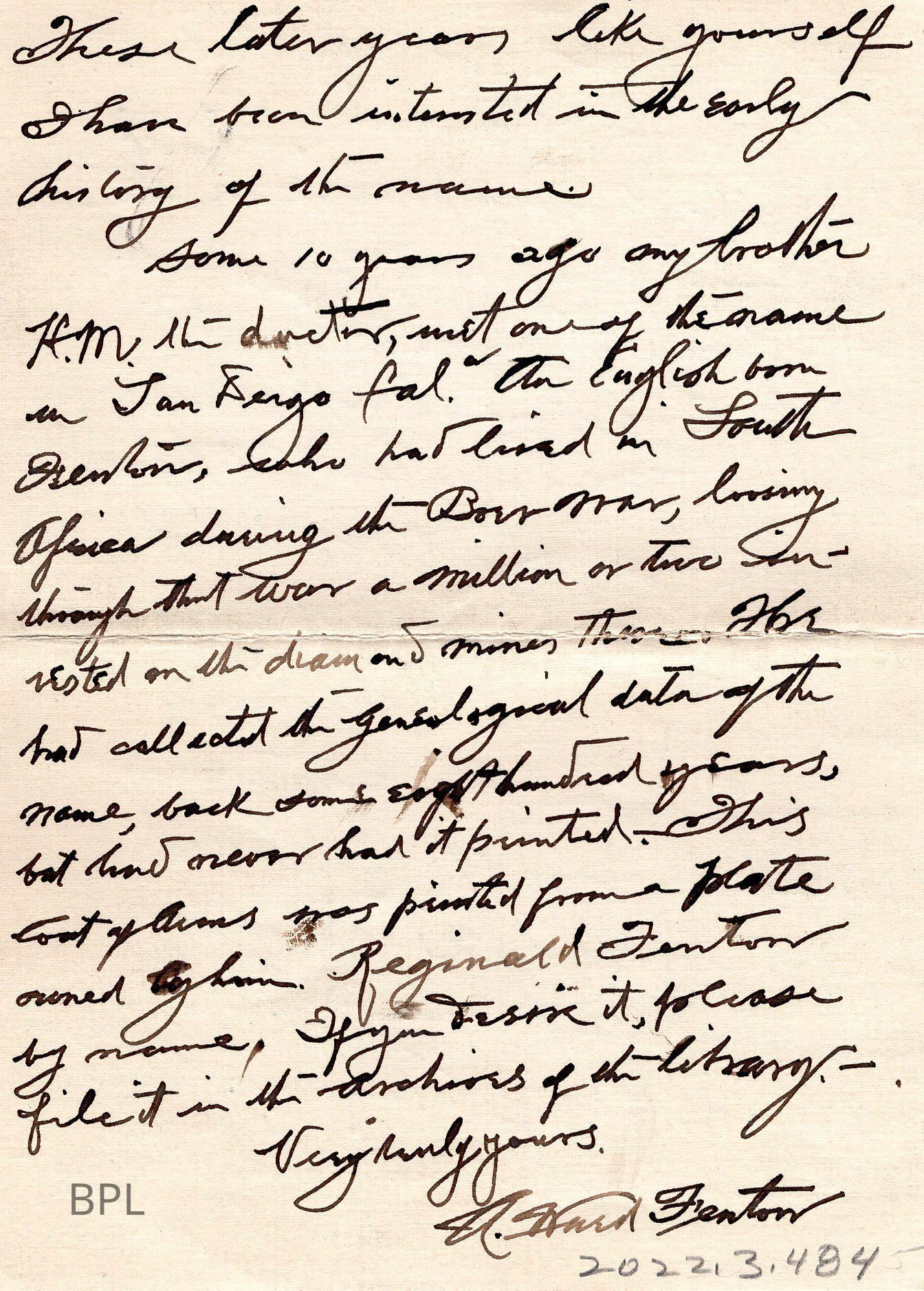 Letter, and Coat of Arms of Fenton Family, 1922Entry/Object ID