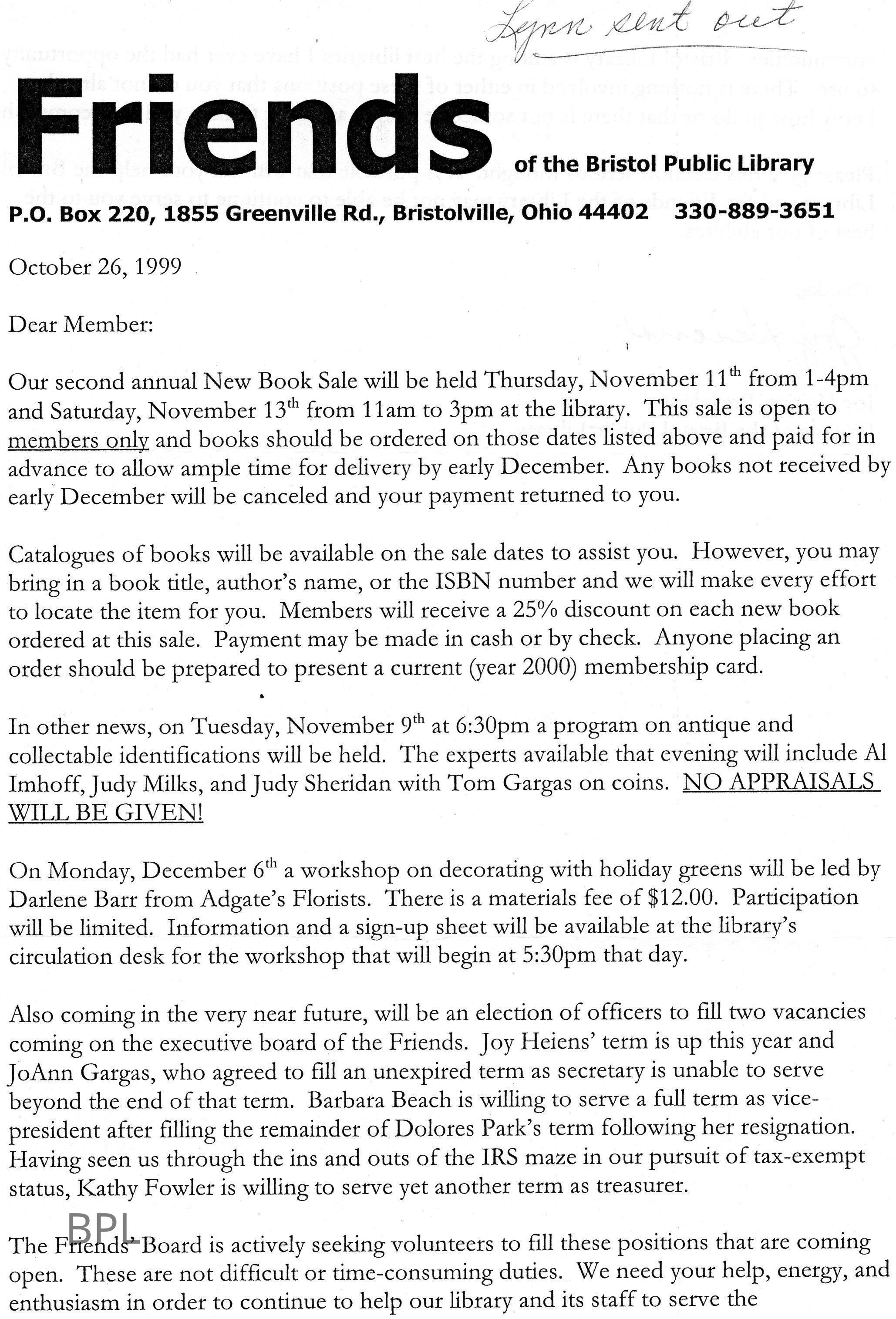 Newsletter of Friends of Bristol Public Library, October 26, 1999 noting upcoming programs.Cataloged By