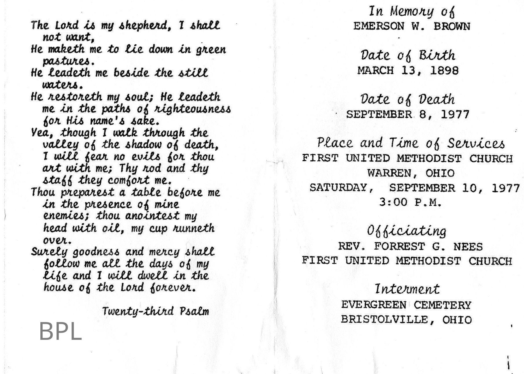 Memorial Card for Emerson W. Brown, September 8, 1977Cataloged By