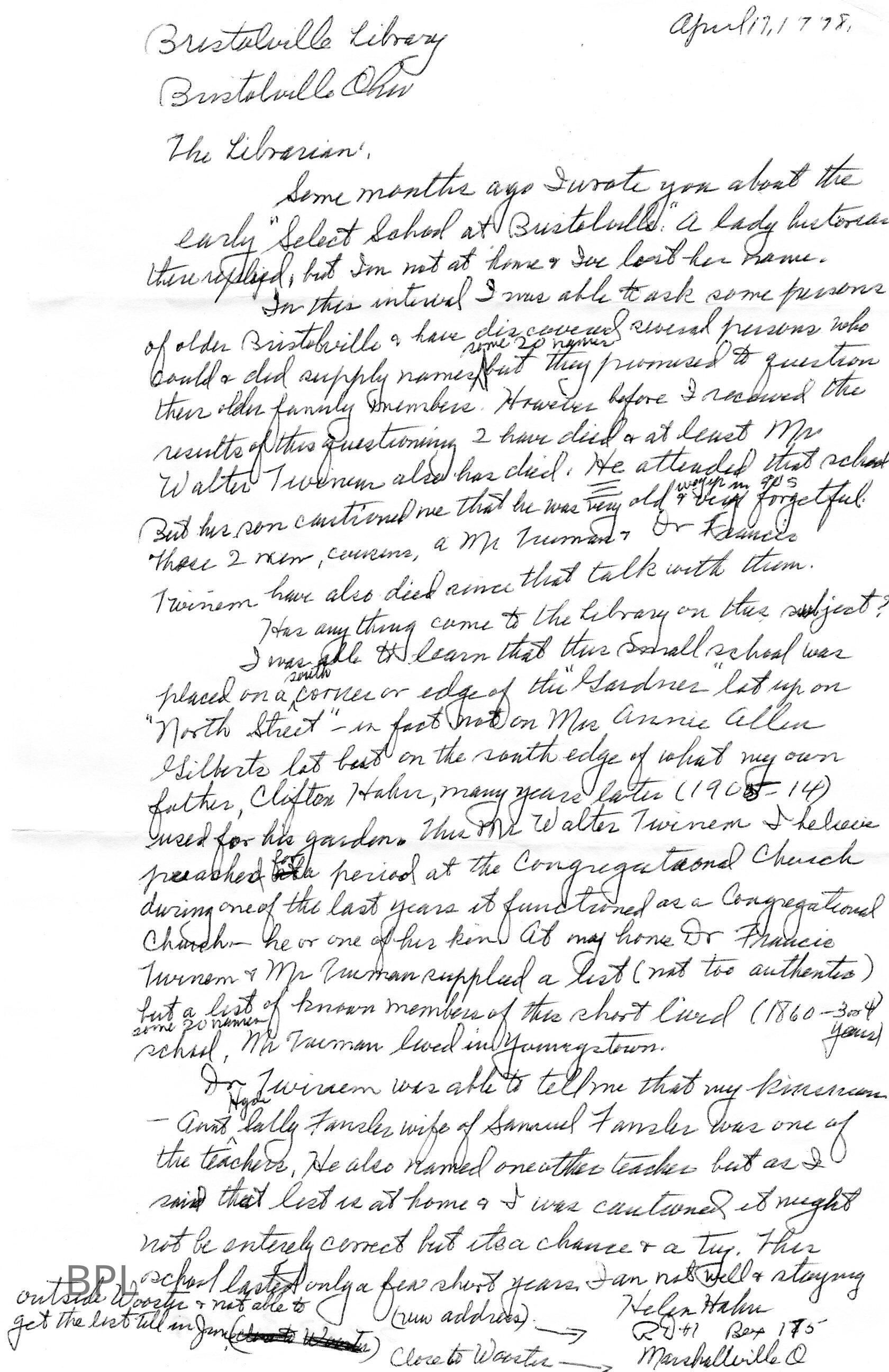 Letter requesting information on "Select School at Bristolville", from Heen HahnCataloged By