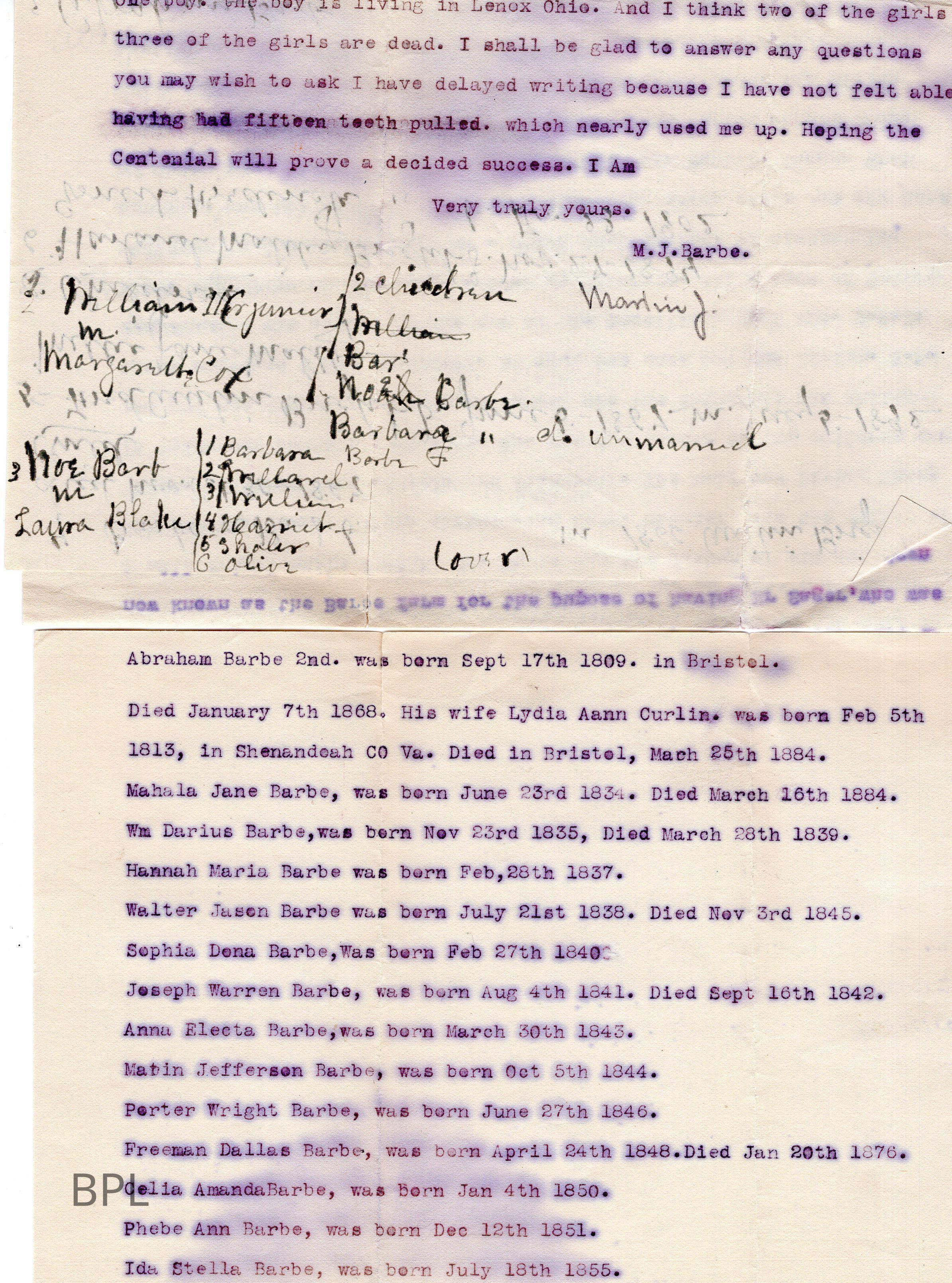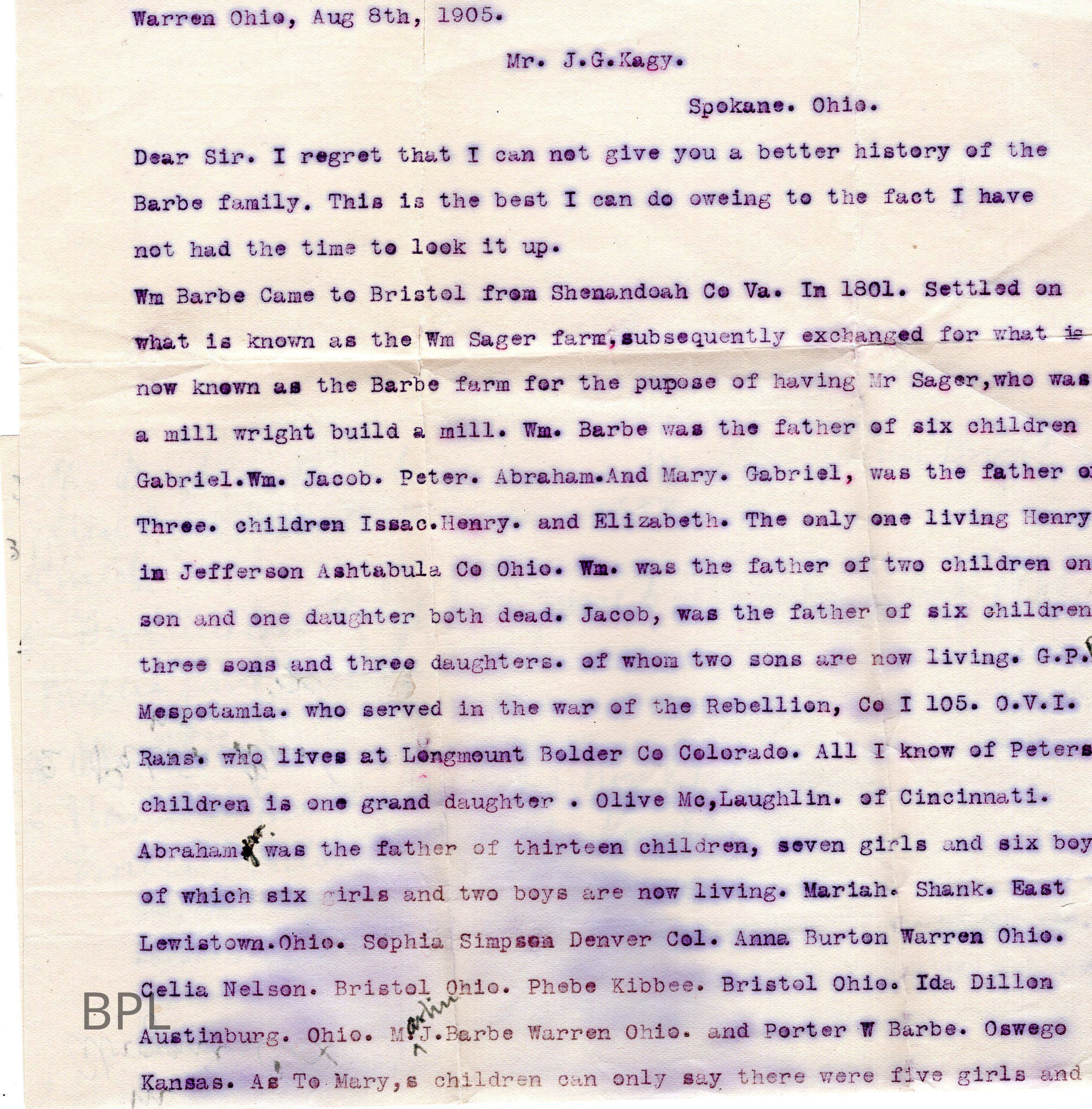 Letter to J. G. Kagy from M. J. Barb of Barb Family History, August 8, 1905Cataloged By