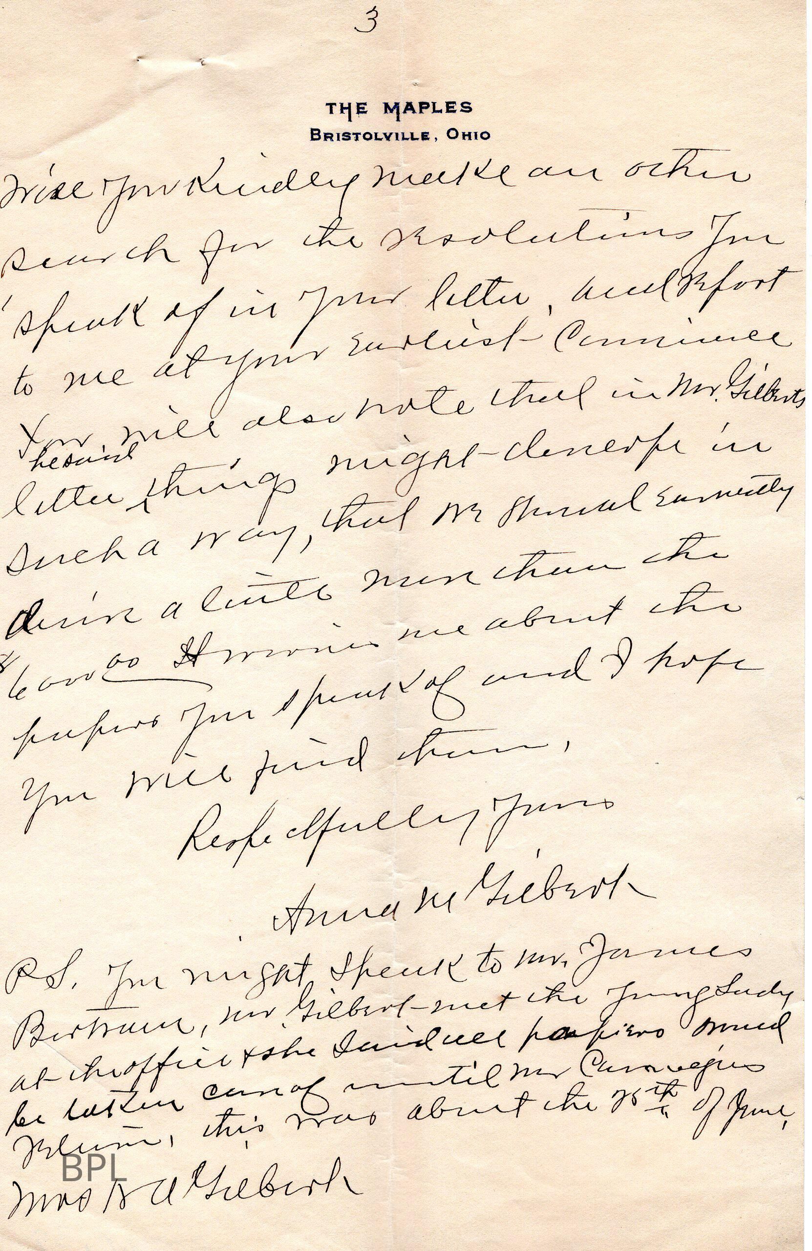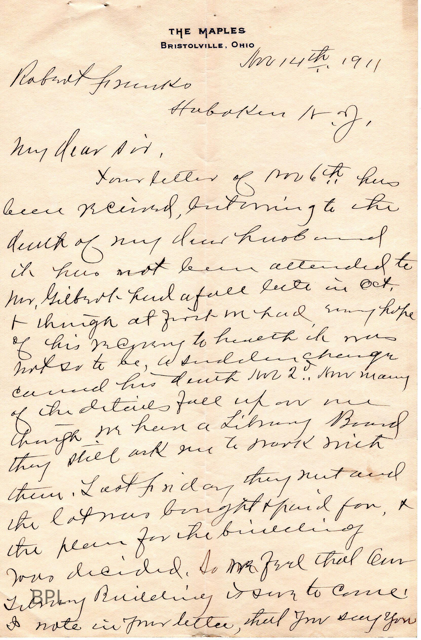 Letter to Robert Franko(?) of Hoboken N.J. from Anna M. Gilbert regarding death of Judge Gilbert on November 2. Also stating the she will be working with the Library Board in the Judge's place, November 11, 1911Cataloged By