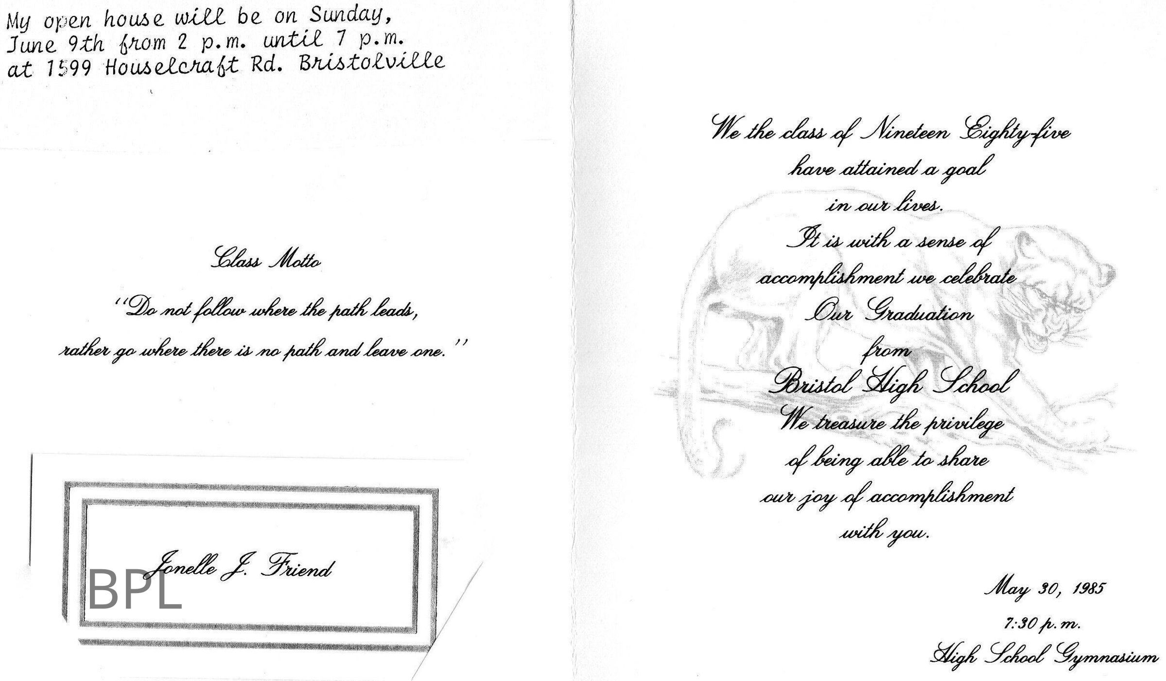 1985 Bristol High School Graduation Announcement of Jonelle J. FriendCataloged By