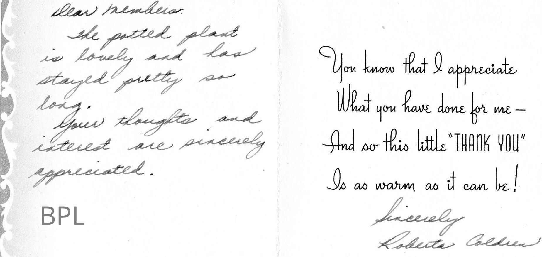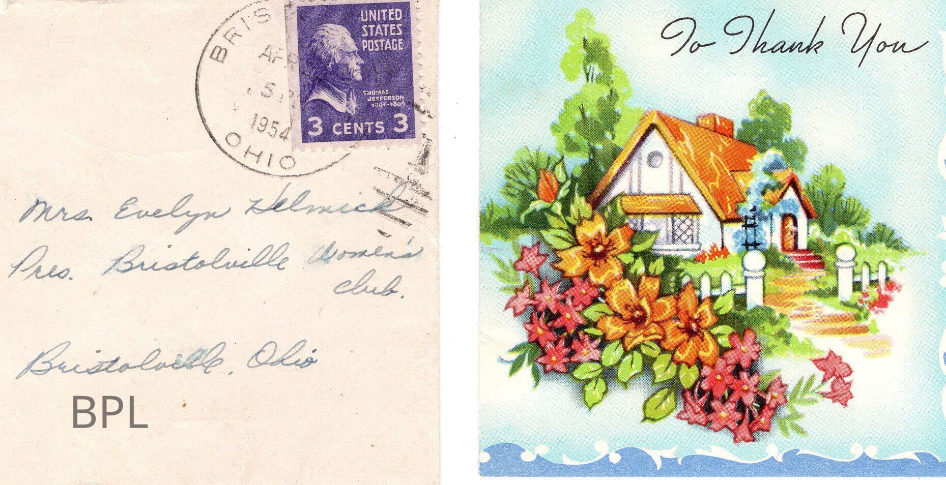Thank you note to Bristolville Woman's Club from Roberta Caldren, 1954Cataloged By