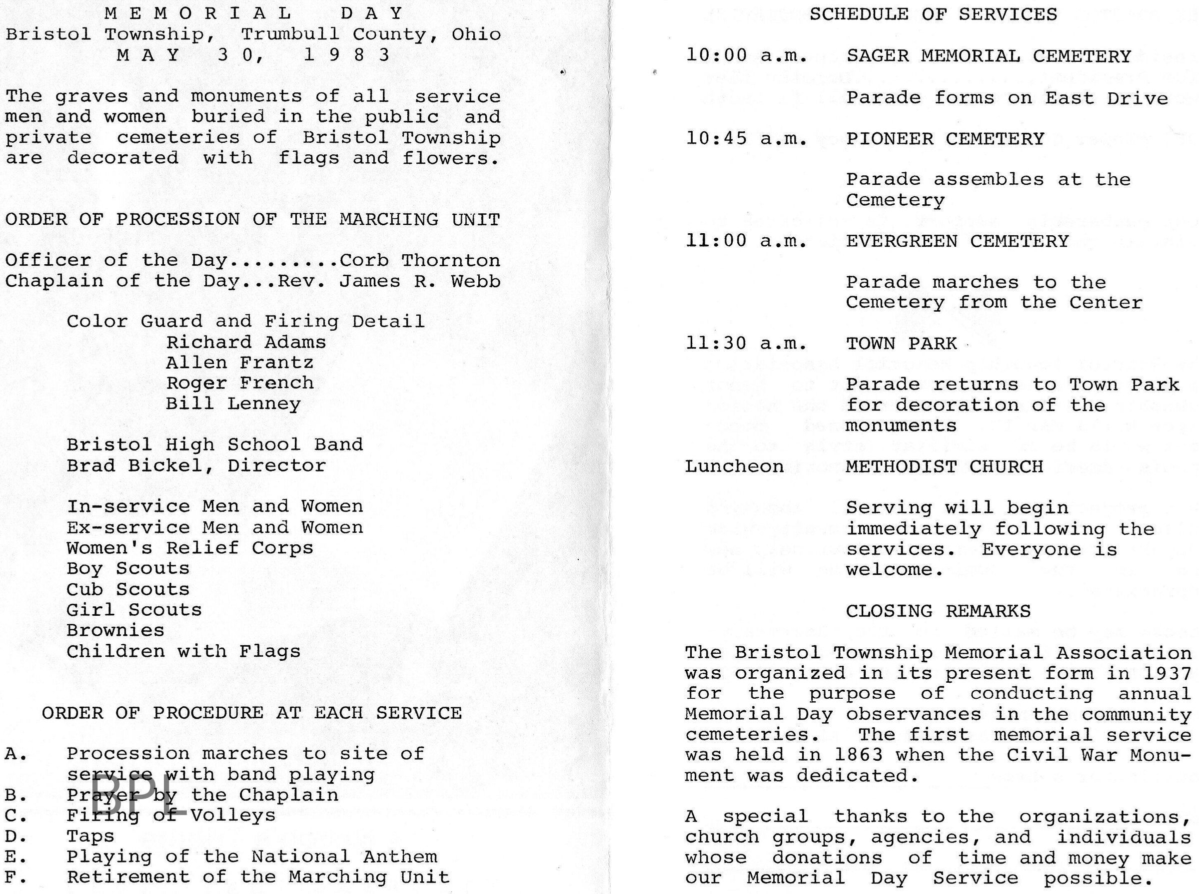 Memorial Day Program, Bristolville, Ohio, May 1983Cataloged By