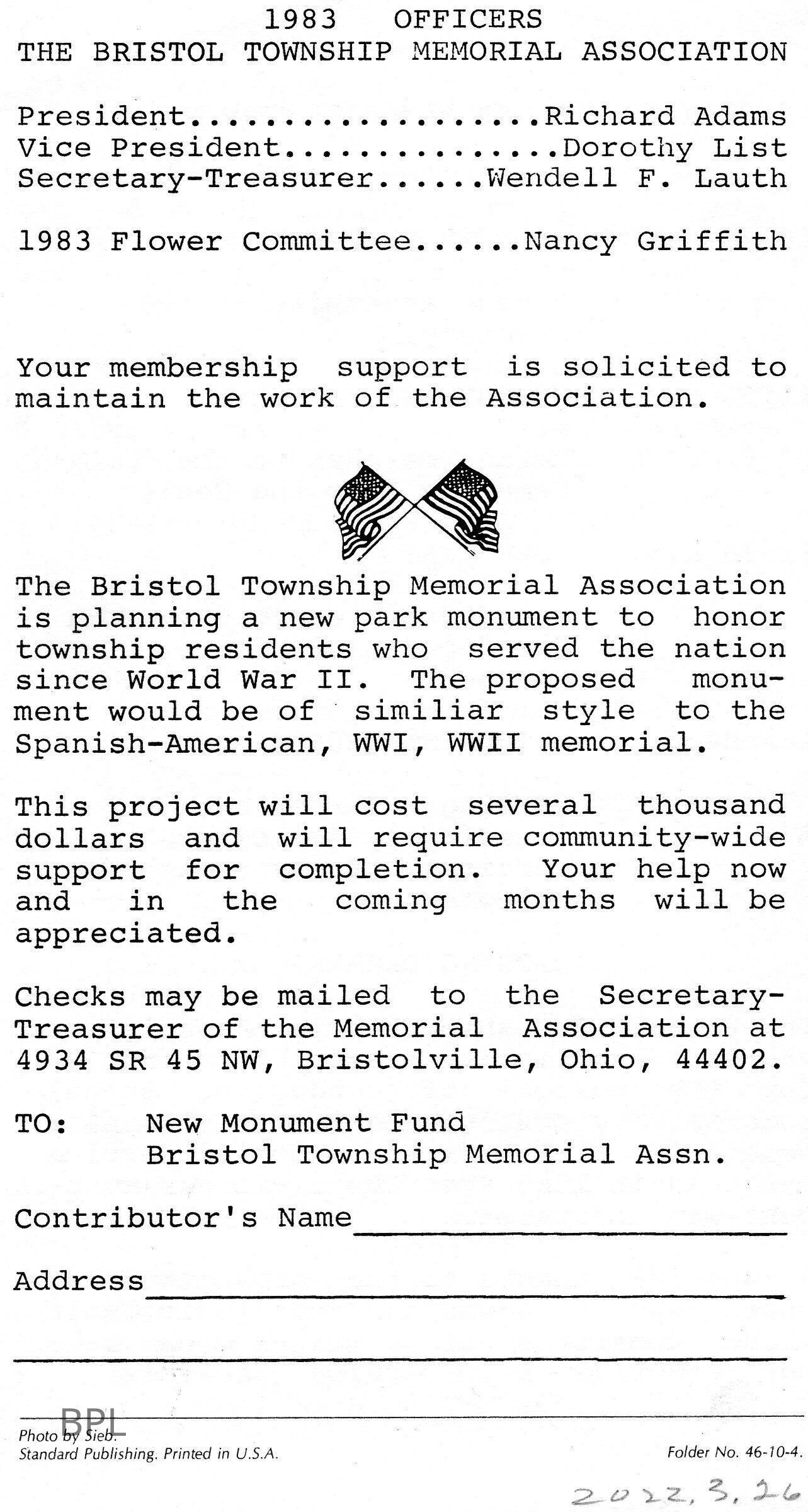 Bristol Township Memorial Association, Adams, Richard, List, Dorothy, Lauth, Wendell