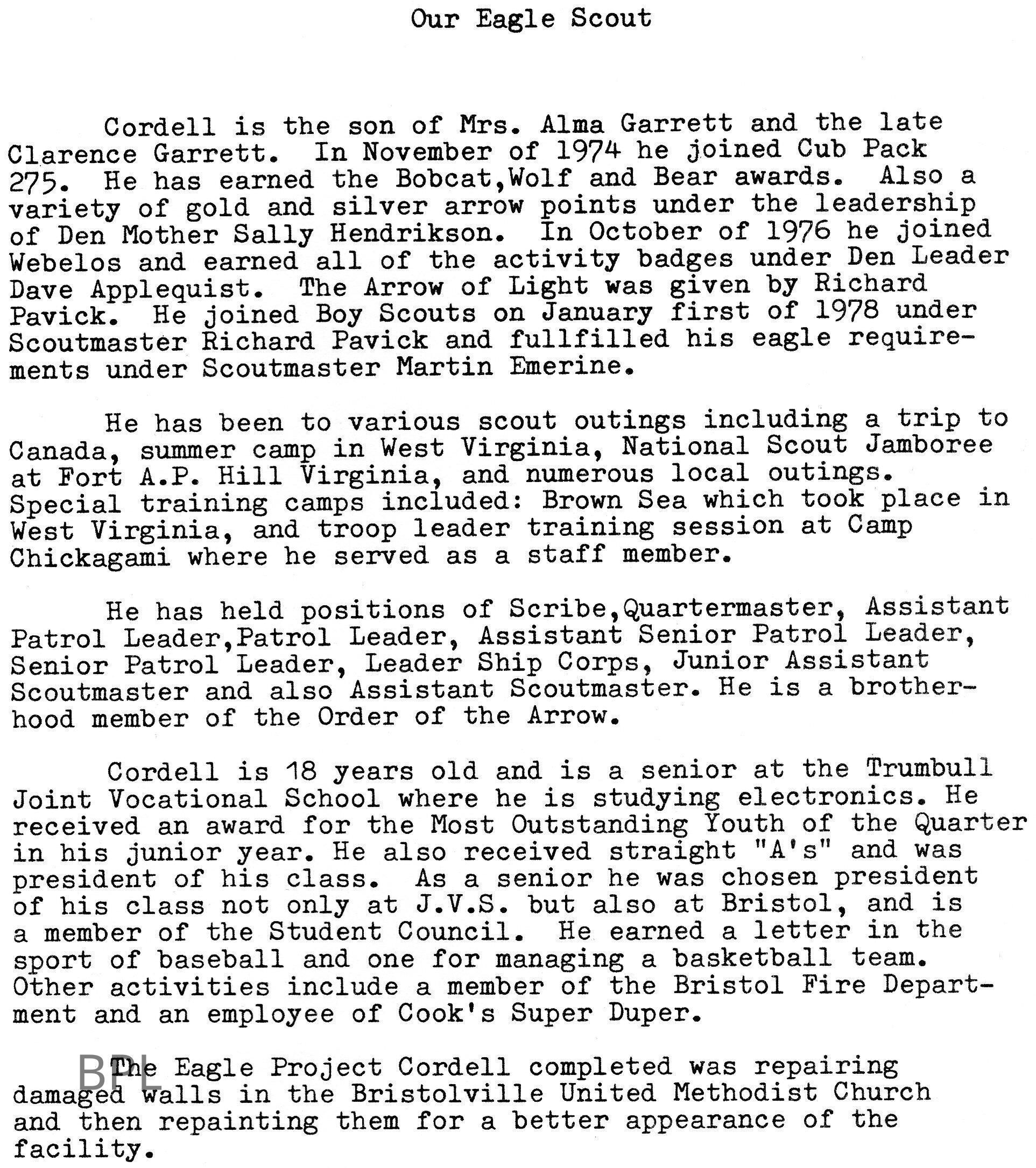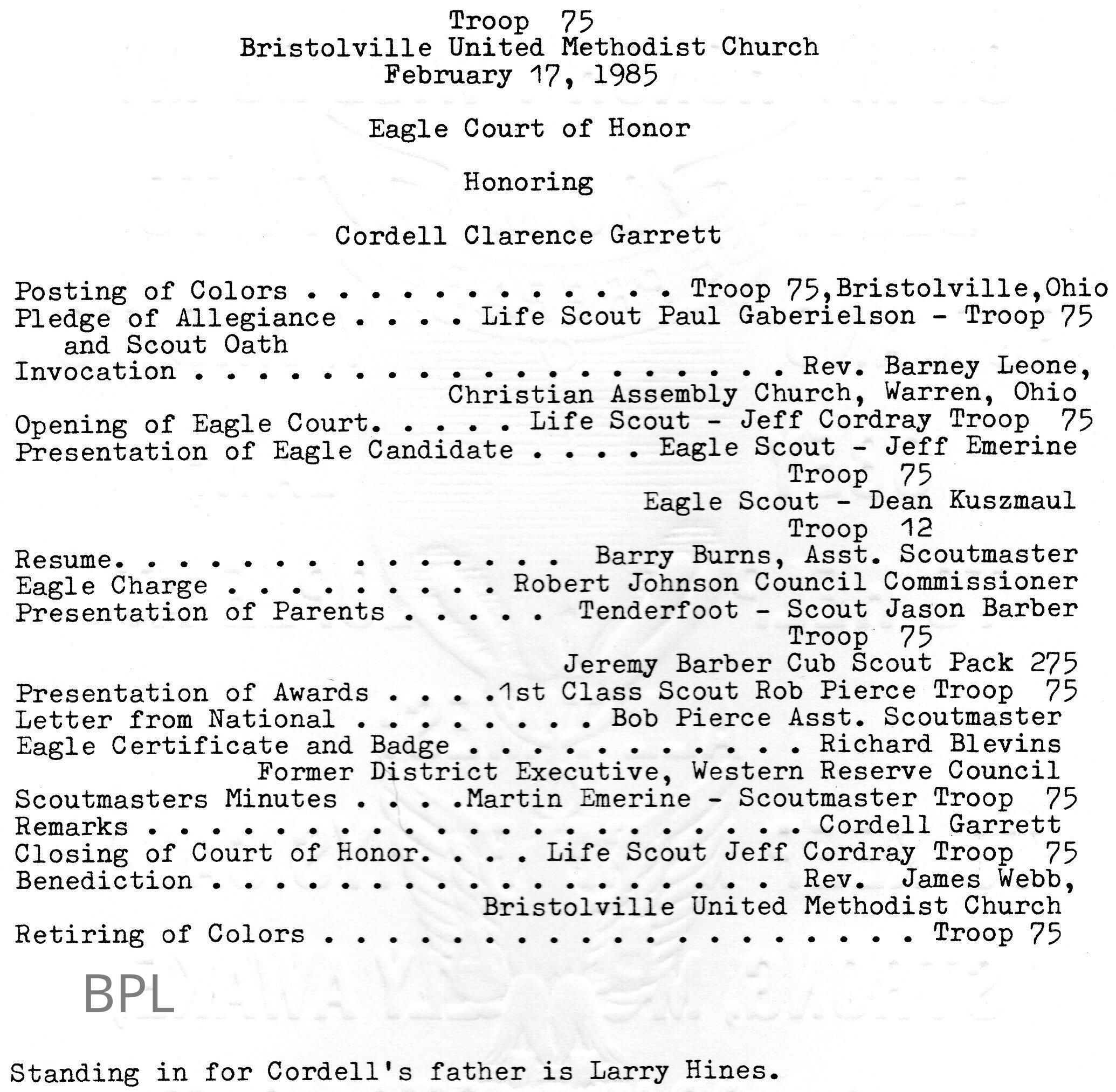 Honoring Eagle Scout Cordell Clarence Garrett, February 17, 1985 Troop 75 Bristolville United Methodist ChurchCataloged By