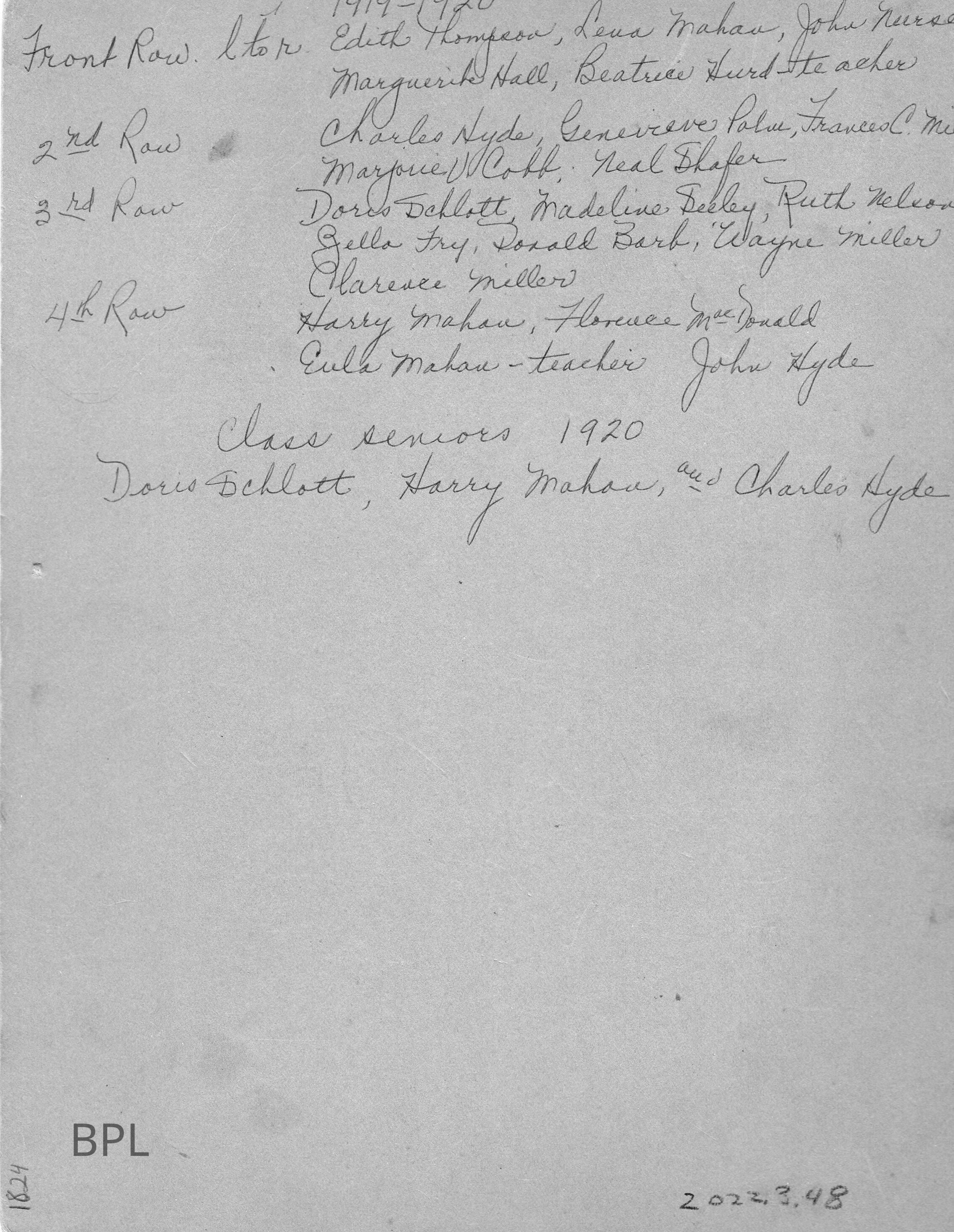 Hyde, Charles, Schlott, Doris, Thompson, Edith, Mahan, Lena, Nurse, John, Hall, Marguerite, Hurd, Beatrice, Palm, Genevieve, Miller, Francis C., Cobb, Marjorie, Shafer, Neal, Sheel, Madeline, Nelson, Ruth, Fry, Zella, Barbe, Donald, Miller, Wayne, Miiier, Clarence, Mahan, Harry, MacDonald, Florence, Mahan, Eula, Hyde, John