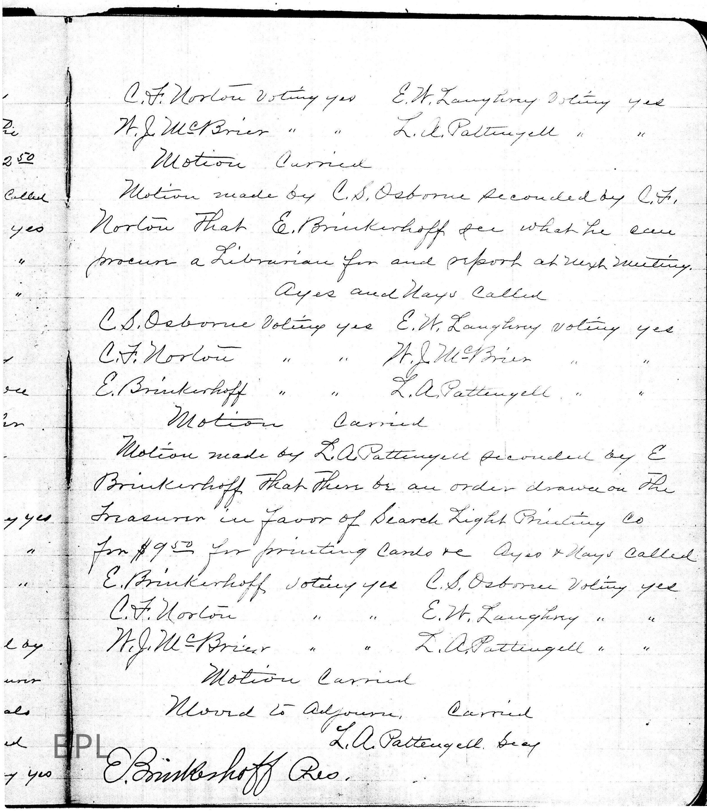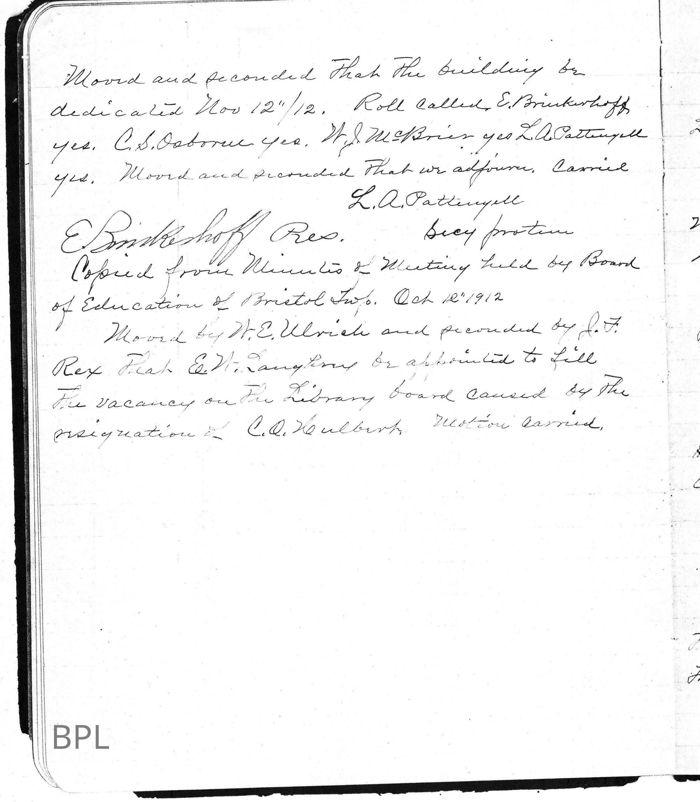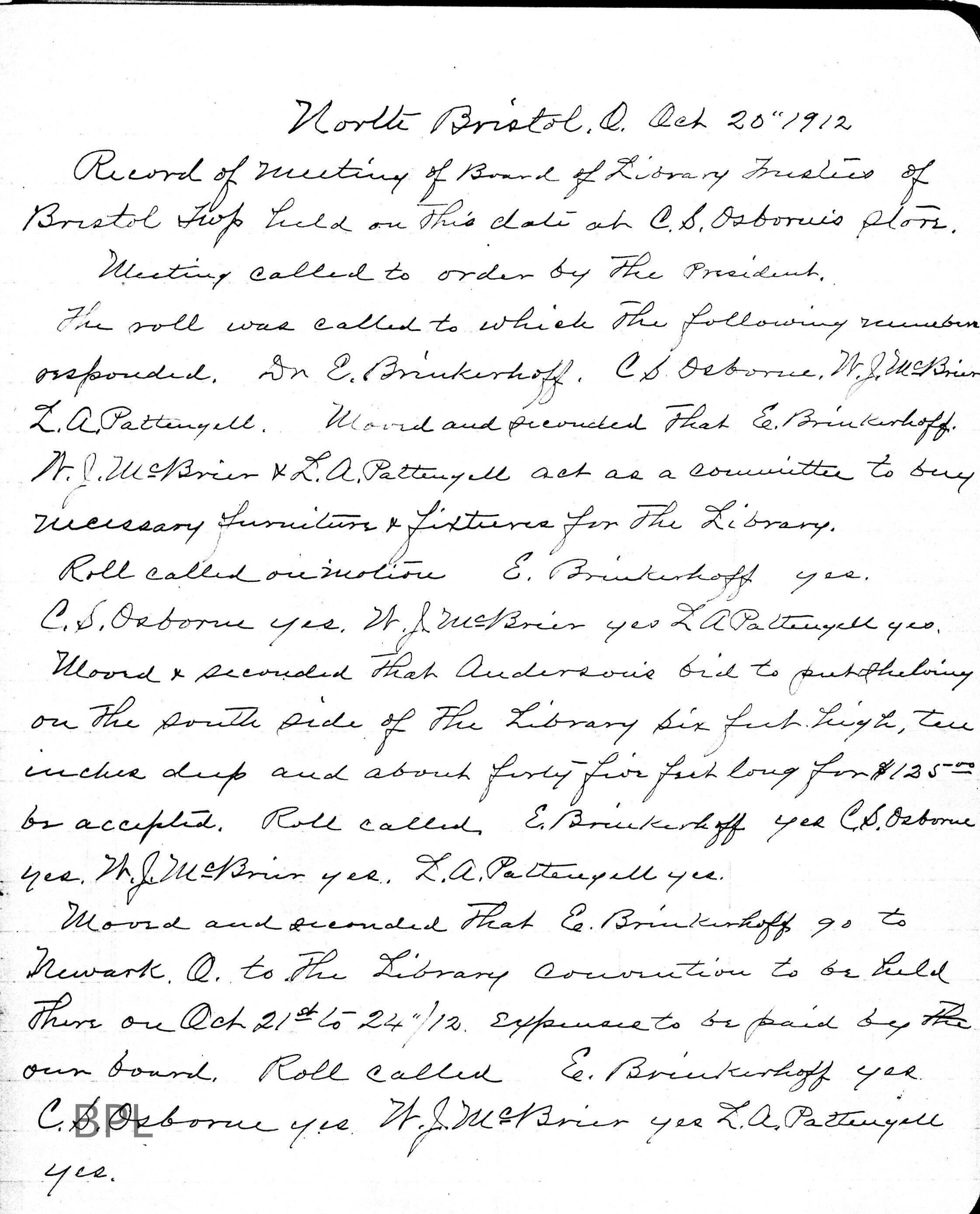 Minutes of Bristol Library Trustees of October 20,1912. Among motions approved for bid of Anderson Company for shelving. Dr. Brinkerhoff is to attend a library convention in Newark, Ohio. Board is to find a librarian. C. O. Hurlbert has resigned as secretary. Dedication of library to be November 12, 1912.Cataloged By