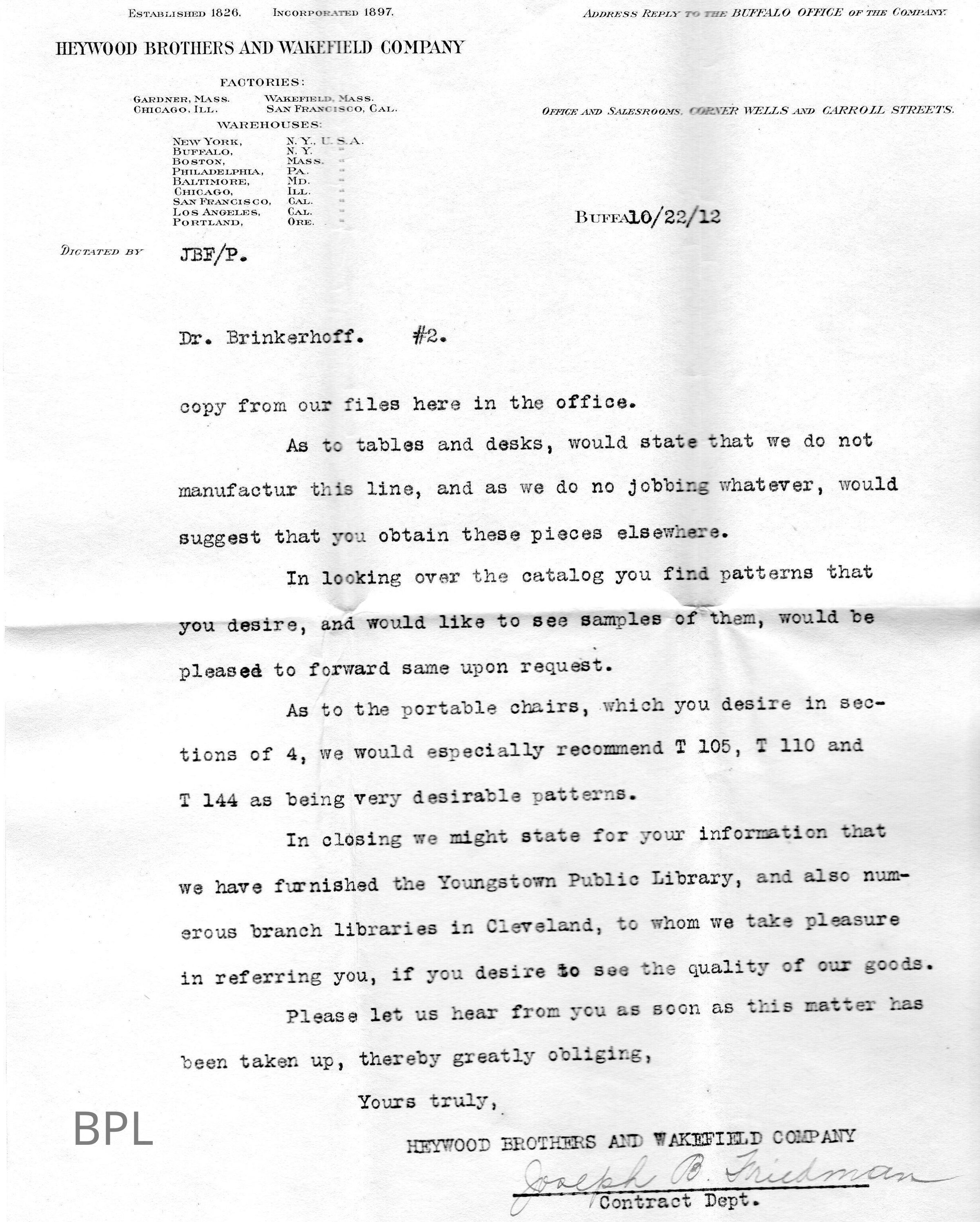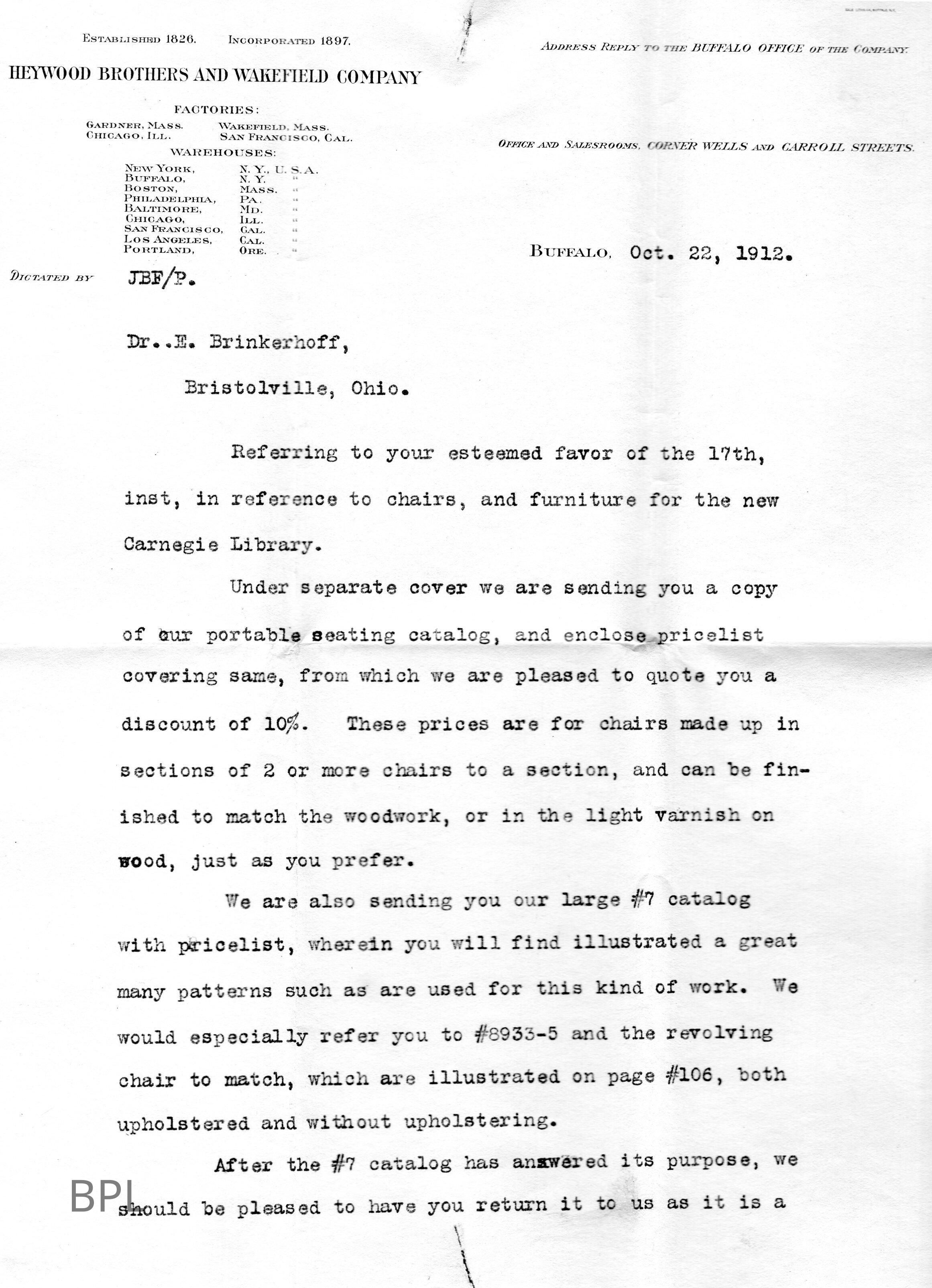 Envelope and letter from Heywood Brothers and Wakefield Company of Buffalo, New York to Dr. Brinkerhoff of Bristol Library Trustees, dated October 22,1912 regarding tables and desks for library.Cataloged By