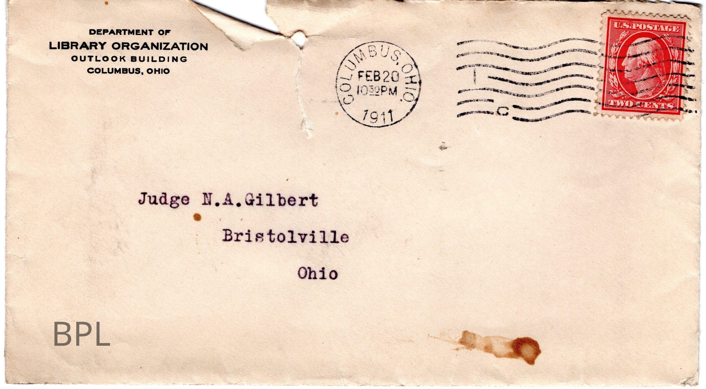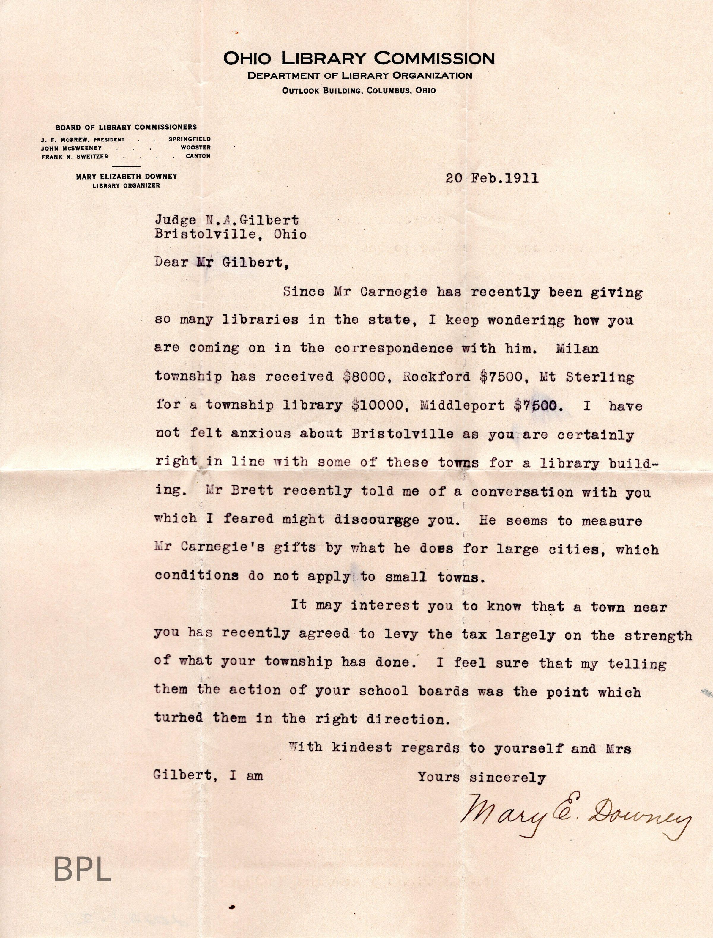 Letter to N. A. Gilbert from Mary E Downey of the Ohio Library Commission asking if Carnegie had made his financial offer yet. February 20, 1911Cataloged By