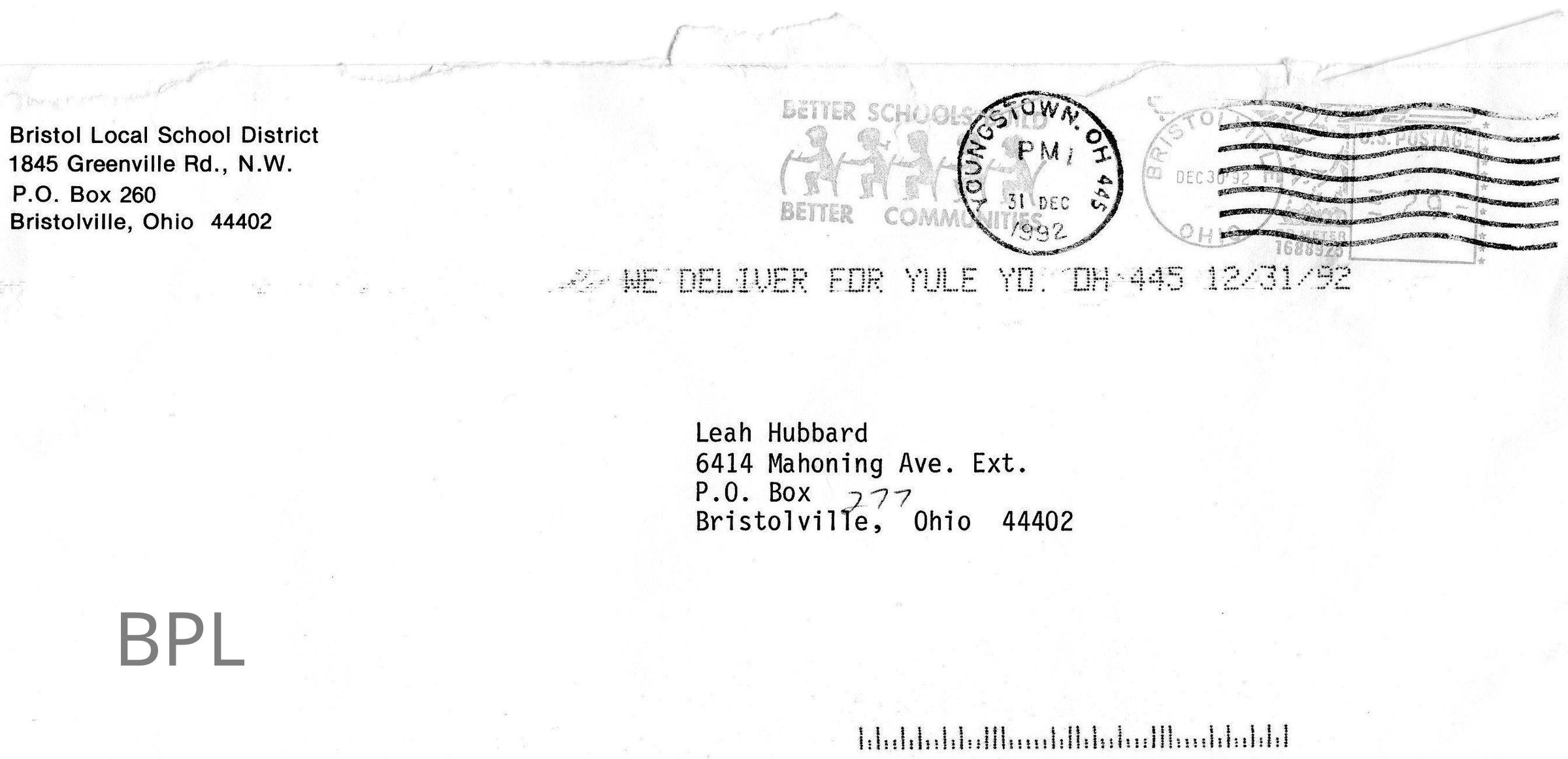 Envelope and Mailer to Leah Hubbard from Bristol School, December, 1992Cataloged By